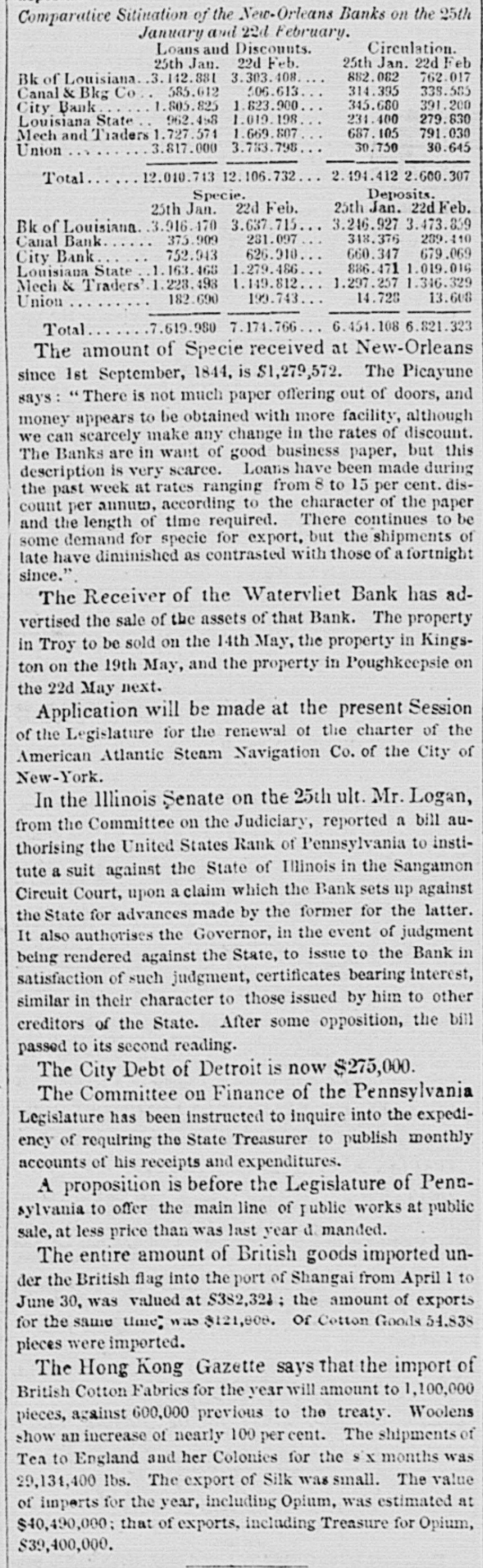 Comparative Sitination of the New-Orleans Banks on the 25th January and 22d February. Loans and Discounts. Circulation. 25th Jan. 22d Feb. 25th Jan. 22d Feb Bk of Louisiana. 3.142.881 3.303.408. 882.082 762.017 Canal & Bkg Co. 585.612 506.613... 314.395 338.585 City Bank. 1.805.825 1.823.900.. 345.680 391.200 Louisiana State 962.458 1.019.198... 231.400 279.830 Mech and Traders 1.727.574 1.669.807 687.105 791.030 Union 3.817.000 3.783.798... 30.750 30.645 Total 12.010.713 12.106.732... 2.194.412 2.600.307 Specie. Deposits. 25th Jan. 22d Feb. 25th Jan. 22d Feb. Bk of Louisiana. 3.916.470 3.637.715... 3.246.927 3.473.859 Canal Bank. 375.909 281.097.. 348.376 289.410 City Bank... 752.943 626.910... 660.347 679.069 Louisiana State 1.163.468 1.279.486. 886.471 1.019.016 Mech & Traders'.1.228.498 1.149.812... 1.297.257 1.346.329 Union 182.690 199.743... 14.728 13.608 Total..7.619.980 7.174.766... 6.454.108 6.821.323 The amount of Specie received at New-Orleans since 1st September, 1844, is $1,279,572. The Picayune says: "There is not much paper offering out of doors, and money appears to be obtained with more facility, although we can scarcely make any change in the rates of discount. The Banks are in want of good business paper, but this description is very scarce. Loans have been made during the past week at rates ranging from 8 to 15 per cent. dis- count per annum, according to the character of the paper and the length of time required. There continues to be some demand for specie for export, but the shipments of late have diminished as contrasted with those of a fortnight since.". The Receiver of the Watervliet Bank has ad- vertised the sale of the assets of that Bank. The property in Troy to be sold on the 14th May, the property in Kings- ton on the 19th May, and the property in Poughkeepsie on the 22d May next. Application will be made at the present Session of the Legislature for the renewal of the charter of the American Atlantic Steam Navigation Co. of the City of New-York. In the Illinois Senate on the 25th ult. Mr. Logan, from the Committee on the Judiciary, reported a bill au- thorising the United States Rank of Pennsylvania to insti- tute a suit against the State of Illinois in the Sangamon Circuit Court, upon a claim which the Bank sets up against the State for advances made by the former for the latter. It also authorises the Governor, in the event of judgment being rendered against the State, to issue to the Bank in satisfaction of such judgment, certificates bearing interest, similar in their character to those issued by him to other creditors of the State. After some opposition, the bill passed to its second reading. The City Debt of Detroit is now $275,000. The Committee on Finance of the Pennsylvania Legislature has been instructed to inquire into the expedi- ency of requiring the State Treasurer to publish monthly accounts of his receipts and expenditures. A proposition is before the Legislature of Penn- sylvania to offer the main line of public works at public sale, at less price than was last year demanded. The entire amount of British goods imported un- der the British flag into the port of Shangai from April 1 to June 30, was valued at $382,321; the amount of exports for the same time was $121,008. Of Cotton Goods 54.838 pieces were imported. The Hong Kong Gazette says that the import of British Cotton Fabrics for the year will amount to 1,100,000 pieces, against 600,000 previous to the treaty. Woolens show an increase of nearly 100 per cent. The shipments of Tea to England and her Colonies for the six months was 29,134,400 lbs. The export of Silk was small. The value of imports for the year, including Opium, was estimated at $40,490,000; that of exports, including Treasure for Opium, $39,400,000.