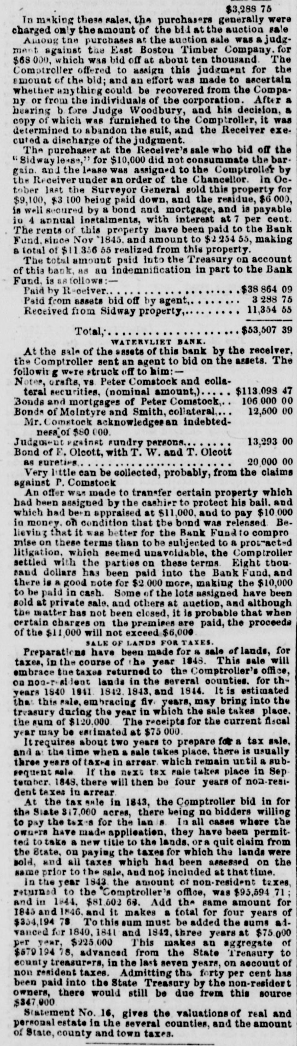 bearing b fore Judge Woodbury, and his decision, a copy of which was furnished to the Comptroller, it was determined to abandon the suit, and the Receiver executed a discharge of the judgment. The purchaser at the Receiver's sale who bid off the " Sidway lease," for $10,000 did not consummate the bargain. and the lease was assigned to the Comptroller by the Receiver under an order of the Chancellor. in October last the Surveyor General sold this property for $9,100, $3,100 being paid down, and the residue, $6 000, is well secured by a bond and mortgage, and is payable io 4 annual instalments, with interest at 7 per cent. The rents of this property have been paid to the Bank Fund. since Nov '1845, and amount to $2,254 55, making a total of $11.356 55 realized from this property. The total amount paid into the Treasury on account of this bank, as an indemnification in part to the Bank Fund, is as follows:$38 864 09 Paid by Receiver 328875 Paid from assets bid off by agent 11,354 Received from Sidway property $53,507 39 Total, WATERVLIET BANK. At the sale of the assets of this bank by the receiver, the Comptroller sent an agent to bid on the assets. The followir 5 were struck off to him:Notes, orafts, vs Peter Comstock and colla$113.098 47 teral securities, (nominal amount,) 106,000 0 Bonds and mortgages of Peter Comstock 12,500 00 Bonds of McIntyre and Smith, collateral Mr. Comstock acknowledgesan indebtedness[of $80 000. 13,293 00 Judgment against sundry persons Bond of E. Olcott, with T. W. and T. Olcott as sureties 20,000 00 Very little can be collected, probably, from the claims against P. Comstock An offer was made to transfer certain property which had been assigned by the cashier to protect his bail. and which had been appraised at $11,000, and to pay $10,000 in money. on condition that the bond was released. Believing that it was better for the Bank Fund to compro mise on these terms than to be subjected to a protracted litigation, which seemed unavoidable, the Comptroller settled with the parties on these terms. Eight thousand dollars has been paid into the Bank Fund, and there is a good note for $2.000 more, making the $10,000 to be paid in cash. Some of the lots assigned have been sold at private sale, and others at auetion, and although the matter has not been closed, it is probable that when certain charges on the premises are paid, the proceeds of the $11,000 will not exceed $6,000 SALE OF LANDS FOR TAXES. Preparations have been made for & sale of lands, for taxes, in the course of the year 1848. This sale will embrace the taxes returned to the Comptroller's office, on non-resident lands in the several counties. for the years 1840 1841. 1842. 1843, and 1844. It is estimated that this sale, embracing fiv. years, may bring into the treasury during the year in which the sale takes place. the sum of $120,000. The receipts for the current fiscal year may be esrimated at $75 000. It requires about two years to prepare for a tax sale, and a: the time when a sale takes place, there is usually three years of taxes in arrear. which remain until a subsequent sale If the next tex sale takes place in September. 1848, there will then be four years of non-restdent taxes in arrear. At the tax sale in 1843, the Comptroller bid in for the State $17,000 acres, there being no bidders willing to pay the texes for the lan 8. In all cases where the owners have made application, they have been permitted to take a new title to the lands, or a quit claim from the State, on paying the taxes for which the lands were sold, and all taxes which had been assessed on the same prior to the sale, and not included at thattime. In the year 1843 the amount of non-resident taxes, returned to the "Comptroller's office, was $95,594 71; and in 1844, $81,602 68. Add the same amount for 1845 and 1846, and it makes a total for four years of $354,194 78 To this sum must be added the sums advanced for 1840, 1841 and 1842, three years at $75.000