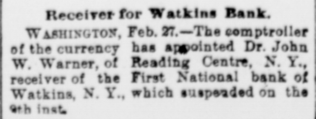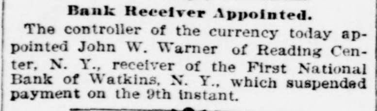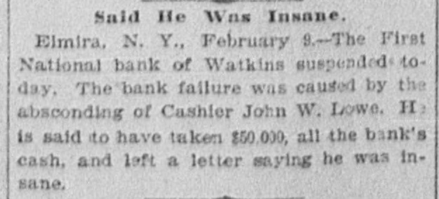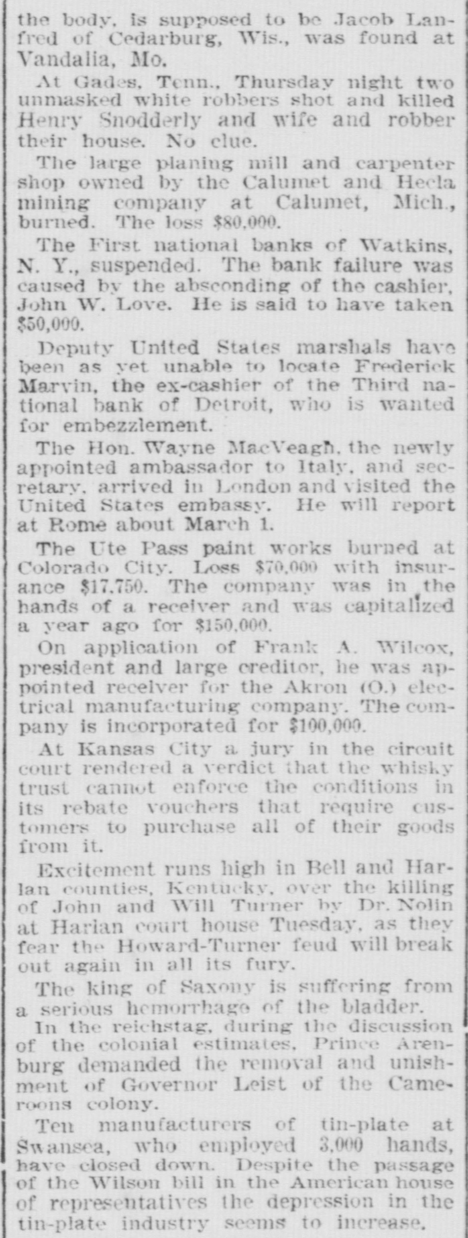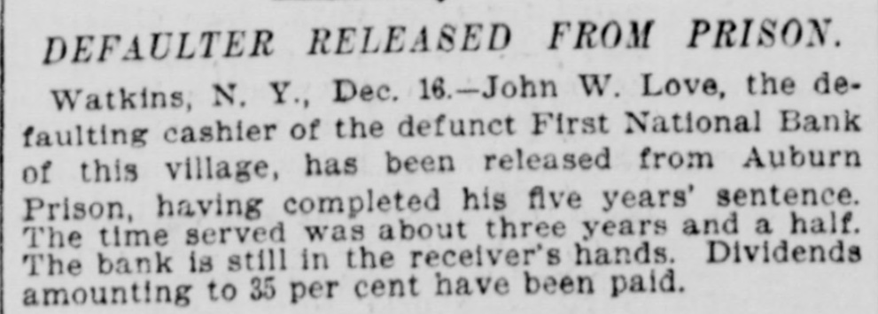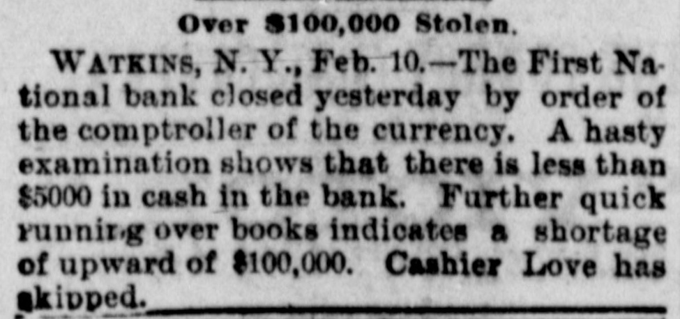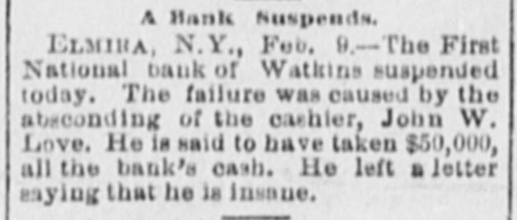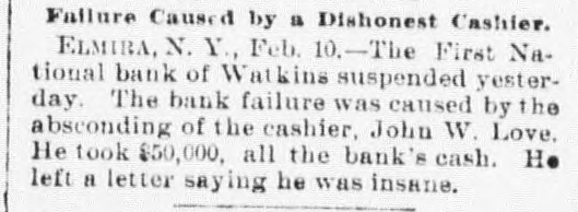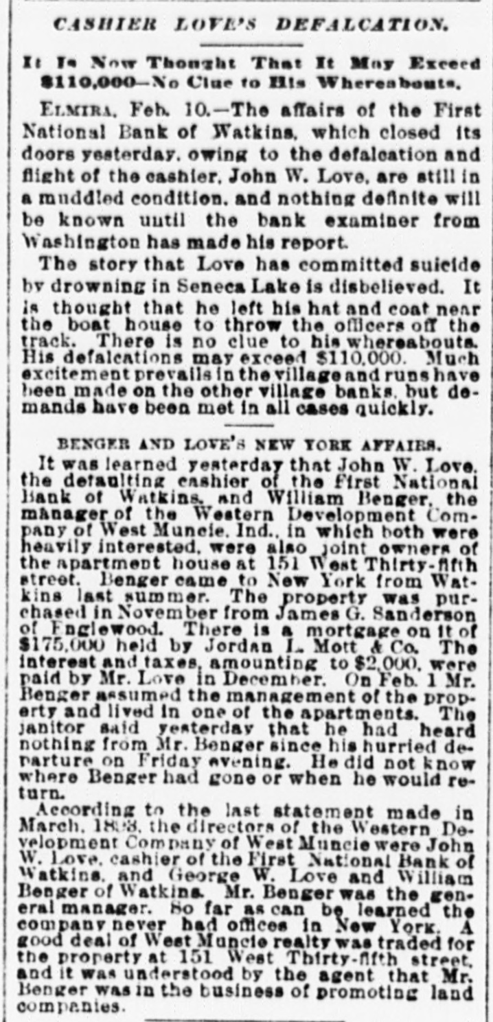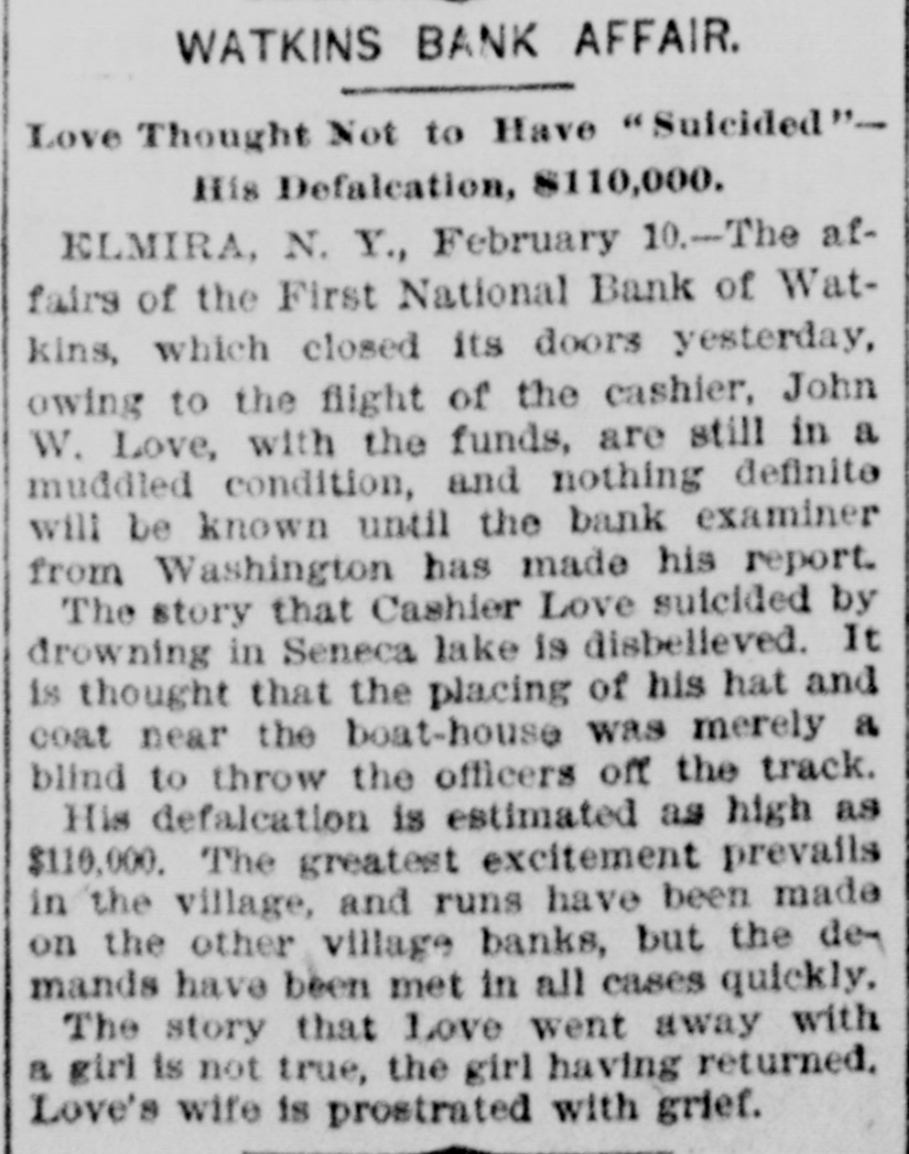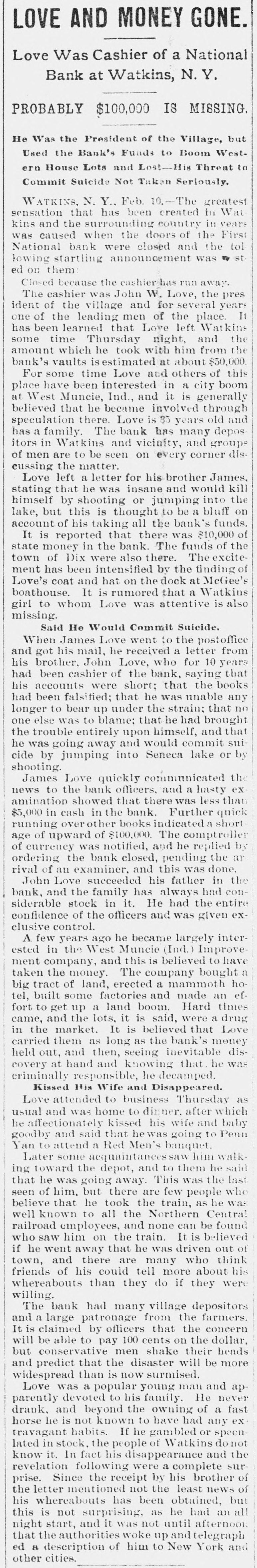 LOVE AND MONET Love Was Cashier of a National Bank at Watkins, N. Y. PROBABLY $100,000 IS MISSING. He Was the President of the Village, but Used the Bank's Funds to Boom Western House Lots and Lost-His Threat to Commit Suicide Not Taken Seriously. WATKINS, N. Y., Feb. .--The greatest sensation that has been created in Wat kins and the surrounding country in years was caused when the doors of the First National bank were closed and the tol st. lowing startling announcement was on them because the cashier has run away. was John W. pres Closed The of cashier village Love, several the ident the and for years It one of the leading men of the place. has been learned that Love left Watkins some time Thursday night, and the amount which he took with him from the bank's vaults is estimated at about $50,000. For some time Love and others of this place have been interested in a city boom at West Muncie, Ind., and it is generally believed that he became involved through speculation there. Love is 35 years old and has a family. The bank has many depos itors in Watkins and vicinity, and groups of men are to be seen on every corner discussing the matter. left a letter for his James, that he was insane and kill stating Love brother would into the himself or jumping but this is thought to be a on lake, by shooting bank's bluff funds. account of his taking all the It is reported that there was $10,000 the of state money in the bank. The funds of town of Dix were also there. The excitement has been intensified by the finding of Love's coat and hat on the dock at McGee's boathouse. It is rumored that a Watkins girl to whom Love was attentive is also missing. Said He Would Commit Suicide. When James Love went to the postoffice his mail, he received a letter from his John Love, who years had been cashier of the bank, and brother, got for saying the 10 books that his accounts were short; that had been falsified; that he was unable any longer to bear up under the strain; that no was to blame; that he had brought the trouble entirely upon himself, one else commit and that he was going away and would suicide by jumping into Seneca lake or by shooting. James Love quickly communicated the to the bank officers, and a hasty ex amination news showed that there was less than $5,000 in cash in the bank. Further quick running over other books indicated a shortof $100,000. The comptroller by of age was notified, and he the bank closed, ar ordering currency of upward pending replied done. the rival of an examiner, and this was John Love succeeded his father in the bank, and the family has always had entire considerable stock in it. He had the confidence of the officers and was given exclusive control. A few years ago he became largely interested in the West Muncie (Ind.) Improvement and this is believed to have a the money. The company hotaken tract company, mammoth bought of land, erected a efbuilt some factories and made an fort to up a land boom. tel, get Hard times drug and the lots, it is said, were a Love came, in the market. It is believed that carried them as long as the bank's money disheld out, and then, seeing inevitable covery at hand and knowing that. he was criminally responsible, he decamped. Kissed His Wife and Disappeared. Love attended to business Thursday as usual and was home to dinner, after which he affectionately kissed his wife and Penn baby goodby and said that he was going to Yan to attend a Red Men's banquet. Later some acquaintances saw him walk- said toward the depot, and to them he ing was away. This was the last of but there are few people seen he took the train, as was believe that he him, that going Central he who to all the Northern and none can well railroad known employees, be believed found who saw him on the train. It is of he went away that he was driven out think if and there are many who his town, friends of his could tell more about whereabouts than they do if they were willing. bank had many village depositors and The a large patronage from the farmers. It is claimed by officers that the concern able to pay 100 cents on dollar, conservative men shake but will be their the heads more and predict that the disaster will be widespread than is now surmised. Love was a popular young man and apdevoted to his family. He never fast drank, parently and beyond the owning of a he is not known to have had any ex horse travagant habits. If he gambled or specu- do not lated in stock, the people of Watkins the know it. In fact his disappearance and revelation following were a complete surSince the receipt by his brother of of prise. letter mentioned not the least news but the whereabouts has been obtained, all his this is not surprising, as he had an night start, and it was not until afternool. the authorities woke up and telegraph and that ed 8 description of him to New York other cities.