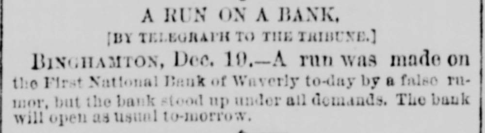 A RUN ON A BANK, [BY TELEGRAPH TO THE TRIBUNE.] BINGHAMTON, Dec. 19.-A run was made on the First National Bank of Waverly to-day by a false I'llmor, but the bank stood up under all demands. The bank will open as usual to-morrow.