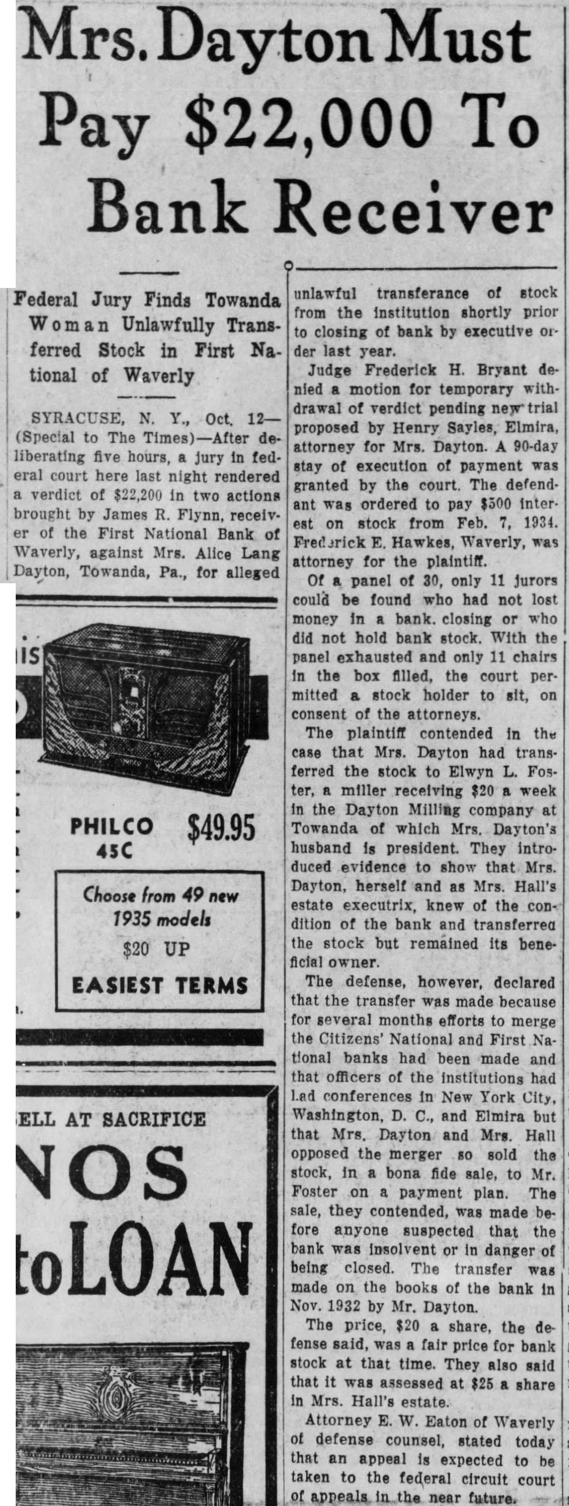 Mrs. Dayton Must Pay $22,000 To Bank Receiver Federal Jury Finds Towanda Woman Unlawfully Transferred Stock in First National of Waverly SYRACUSE, N. Y., Oct. 12(Special to The Times)-After deliberating five hours, jury in federal court here last night rendered verdict of $22,200 in two actions brought by James R. Flynn, receiver of the First National Bank of Waverly, against Mrs. Alice Lang Dayton, Towanda, Pa., for alleged unlawful transferance of stock from the institution shortly prior to closing of bank by executive or der last year. Judge Frederick H. Bryant denied a motion for temporary withdrawal of verdict pending new trial proposed by Henry Sayles, Elmira, attorney for Mrs. Dayton. A 90-day stay of execution of payment was granted by the court. The defendant was ordered to pay $500 interest on stock from Feb. 7, 1934. Frederick E. Hawkes, Waverly, was attorney for the plaintiff. Of a panel of 30, only 11 jurors could be found who had not lost money in a bank. closing or who did not hold bank stock. With the panel exhausted and only 11 chairs in the box filled, the court permitted a stock holder to sit, on consent of the attorneys. The plaintiff contended in the case that Mrs. Dayton had transferred the stock to Elwyn L. Foster, a miller receiving $20 a week in the Dayton Milling company at Towanda of which Mrs. Dayton's husband is president. They introduced evidence to show that Mrs. Dayton, herself and as Mrs. Hall's estate executrix, knew of the condition of the bank and transferred the stock but remained its beneficial owner. The defense, however, declared that the transfer was made because for several months efforts to merge the Citizens' National and First National banks had been made and that officers of the institutions had Lad conferences in New York City, Washington, D. C., and Elmira but that Mrs. Dayton and Mrs. Hall opposed the merger so sold the stock, in a bona fide sale, to Mr. Foster on a payment plan. The sale, they contended, was made before anyone suspected that the bank was insolvent or in danger of being closed. The transfer was made on the books of the bank in Nov. 1932 by Mr. Dayton. The price, $20 a share, the defense said, was a fair price for bank stock at that time. They also said that it was assessed at $25 a share in Mrs. Hall's estate. Attorney E. W. Eaton of Waverly of defense counsel, stated today that an appeal is expected to be taken to the federal circuit court of appeals in the near future.