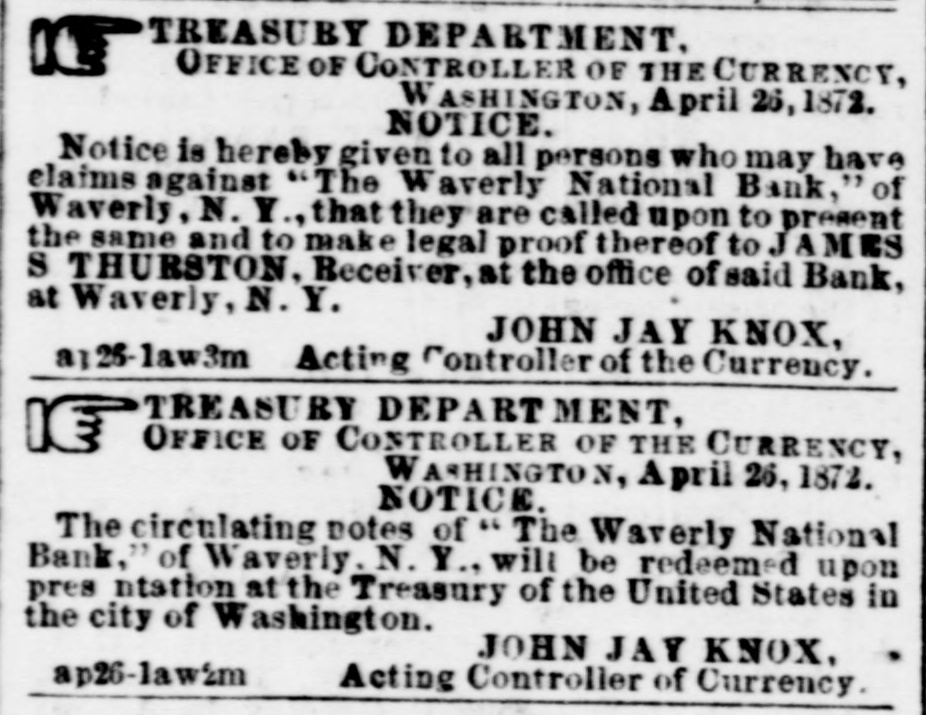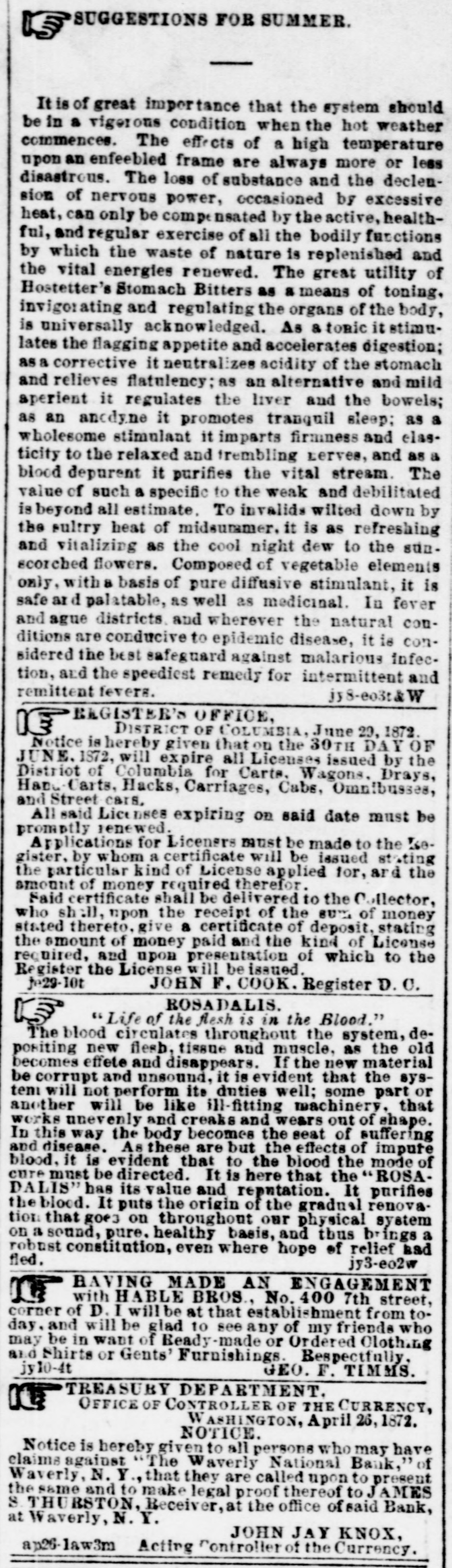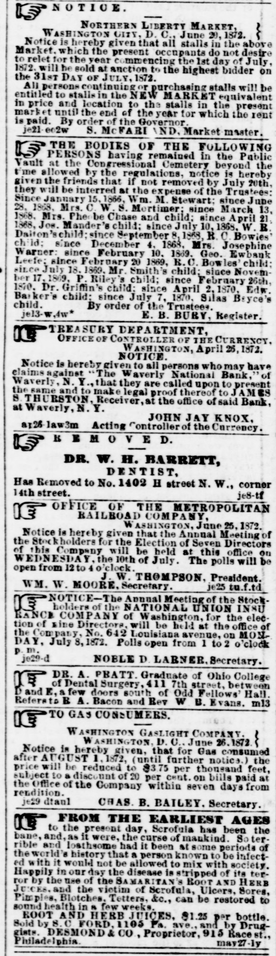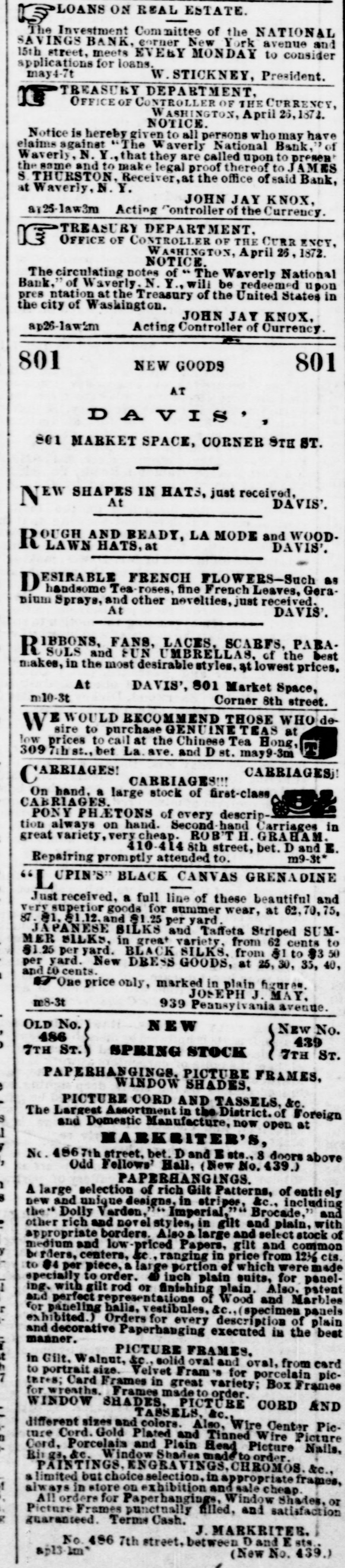 ON REAL ESTATE. LOALS Investment Committee New of York the NATIONAL avenue consider and 15th street, meets SAVINGS The BANK, EVERY eorner MONDAY to W. applications for loans, STICKNEY, President. may4-7t TREASURY DEPARTMENT. CURRENCY, OFFICE OF CONTROLLER OF WASHINGTON, April 26,1871. have elaims against Notice is hereby The given NOTICE Waverly to are all persons called National upon who Bank, to may JAMES premen , of S THURSTON Y. Waverly, N the Waverly, same and N.Y. to make that Receiver, they legal at proof the office thereof of to said Bank, JOHN JAY KNOX, at a:25-law3m Acting Controller of the Currency 3 CURR ENCY, TREASUR DEPARTMENT. OF THE OFFICE OF CONTROLLER WASHINGTON, April 25, 1872. Bank, The circulating of Waverly at the notes Treasury NOTICE. N. Y., of " will The of the be Waverly United redeemed National States upon in ap26-law2m 5 the pres city ntation of Washington. Acting Controller JOHN JAY of Currency KNOX. 801 801 NEW GOODS AT , D A V I S 801 MARKET SPACE, CORNER STH ST. NEW SHAPES At IN HATS, just received, DAVIS'. WOODLAWN HATS,at TOUGH AND READY, LA MODE and DAVIS'. nium ESIRABLE FRENCH fine FLOWERS-Such French Leaves. received. Gera- as At D handsome Sprays, and Tea other roses, novelties, just DAVIS. SCARFS, PARA. in the most makes, R 1BBONS, SOLS and FANS, FUN desirablestyles, UMBRELLAS. LACES, at lowest of the prices. best At DAVIS', 801 Market Space, Corner 8th street. m10-3t RECOMMEND GENUINE THOSE TEAS WHO de at T the Chinese Tea Hong, MARRIAGES! low 309 7ih st. prices to bet call La at ave. and D st. may9-3m CARRIAGES On hand. a large stock of NEW in of Second every hand descrip Carriages always on very cheap. hand. ROB'T H. GRAHAM. bet. D and E. tion great variety, 410-4148th street, m9-3t* promptly attended to. Repairing UPIN'S BLACK CANVAS GRENADINE and Just superior goods for yard. " L received, a full line summer of these wear, beautiful at 62.70.75. 87 very JAPANESE #1. 1.12. and BILKS $1.25 per and variety, Taffeta from Striped 62 cents SUM to per yard. and MER SILKS, in BLACK great SILKS. from at 25, $1 to e 3 50 30, 35, 40, $1.25 per yard. New DRESS GOODS, figures. m8-3t 939 " we price only. marked JOSEPH J. in plain MAY. Pennsylvania avenue. OLD No. NEW NEW No. S 439 7TH ST. 1 7TH ST. 486 1 SPRING STOCK SHADES. PAPERHANDADOW PICTURE FRAMES. &c. PICTURE Assortment CORD AND in the TASSELS, District. of Foreign at The Largest and Domestic Manufacture, now open MARKRITER'S, bet. D and Ests. 8 doors above 1 No 4867th Odd Follows street, Hall, (New No. 439.) A large and selection unique PAPERHANGINGS. designs. 1764 Imperial in stripes, Brocade, of including entirely with and new the Dolly rich and Varden, novel styles, large in gilt and and select plain, stock of other appropriate borders. priced Also Papers, gilt from and common 12% cts. medium and centers, low be ranging in of price which weremade to b rders, 84 per piece, large inch portion plain suits, Also. for panel- patent specially to gilt order. rod or finishing plain. Wood and Marblee and ing. paneling perfect with represe halls, sentations vestibules. of &c. description (specimen of panels plain best and for exhibited.) decorative Orders Paperhanging for every executed is the manner. Gilt. Walnut, PICTURE sc solid Fram's FRAMES. oval and for oval, porcelain from card picin for tares; to portrait wreaths. Card size. Frames Frames Velvet in madet great PICTURE variety; order. CORD Box Frames AND WINDOW SHADES, TABSELS, Also, &c. Wire Center Piedifferent sizes and Plated colors. and Tinned Wire Picture Nails, Cord. Big &c. indow ENGRAVINGS. Shades made CHROMOS. to ture Cord. Porcelais Gold and Plain Head Appropriate Picture order. frames, &c., PAINTINGS. but choice selection. in sale cheap. a limited in store on exhibition and Window Shades, or always All orders! Frames for punctually Paperhanginge. filled, and satisfaction guaranteed. Picture Terms Cash. J. MARKRITES. ap13 1m No. 486 7th street, between (New and No. E 439.) sts