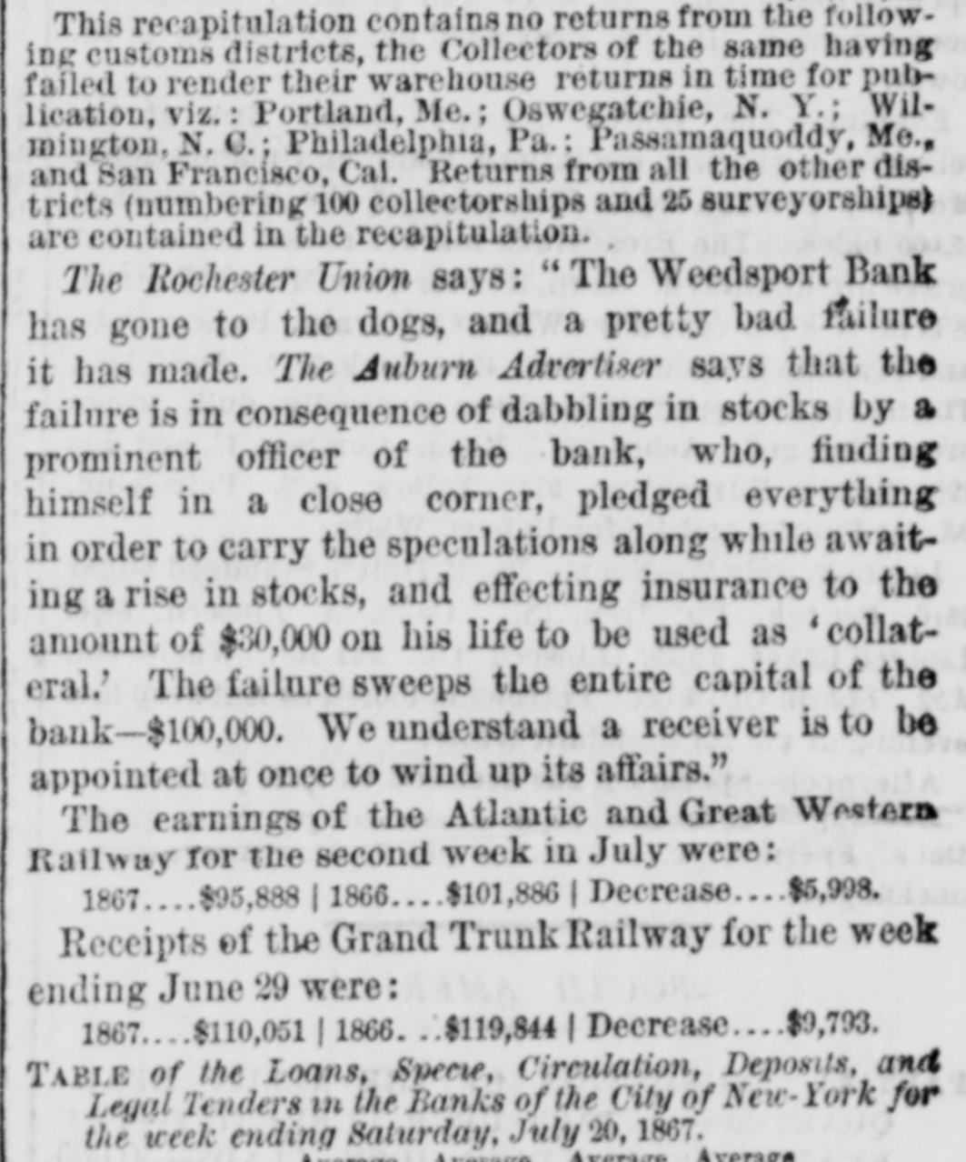 This recapitulation contains no returns from the following customs districts, the Collectors of the same having failed to render their warehouse returns in time for publication, viz. Portland, Me.; Oswegatchie, N. Y.; Wilmington, N. C. Philadelphia, Pa.: Passamaquoddy, Me., and San Francisco, Cal. Returns from all the other districts (numbering 100 collectorships and 25 surveyorships) are contained in the recapitulation. The Rochester Union says: "The Weedsport Bank has gone to the dogs, and a pretty bad failure it has made. The Auburn Advertiser says that the failure is in consequence of dabbling in stocks by a prominent officer of the bank, who, finding himself in a close corner, pledged everything in order to carry the speculations along while awaiting a rise in stocks, and effecting insurance to the amount of $30,000 on his life to be used as 'collateral.' The failure sweeps the entire capital of the bank-$100,000. We understand a receiver is to be appointed at once to wind up its affairs." The earnings of the Atlantic and Great Western Railway for the second week in July were: $5,998. Decrease $101,886 I 1867 $95,888 I 1866 Receipts of the Grand Trunk Railway for the week ending June 29 were: Decrease $9,793. 1866 I 1867 $119,844 $110,051 TABLE of the Loans, Specre, Circulation, Deposits, and Legal Tenders in the Banks of the City of New-York for the week ending Saturday, July 20, 1867.