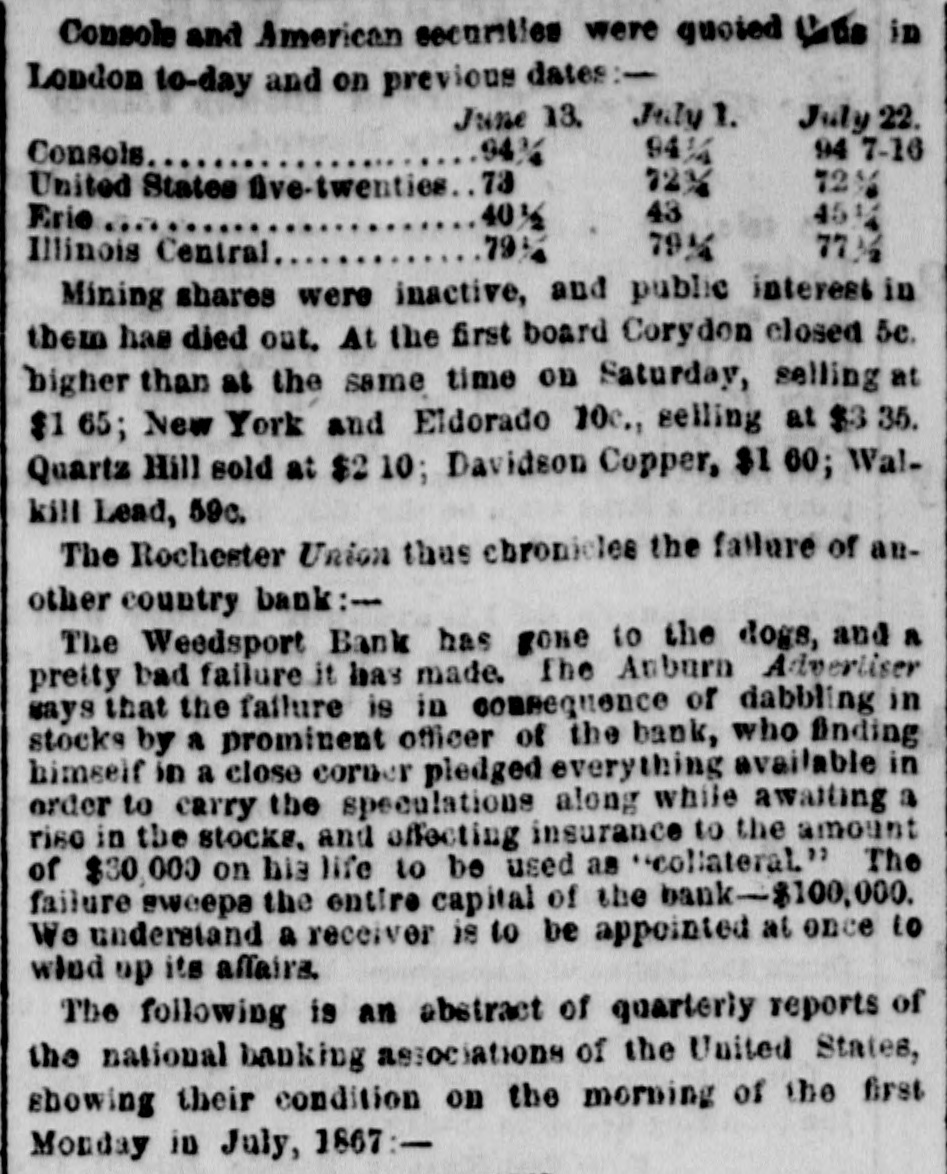 Console and American securities were quoted Litts in London to-day and on previous dates:July1. June 13. July 22. 9414 94 7-16 9414 Consols 72% 72% United States Ove-twenties 73 43 4514 Erie 401/2 7914 79% 77 14 Illinois Central Mining shares were inactive, and public interest in them has died out. At the first board Coryden closed 5c. bigher than at the same time on Saturday, selling at $1 65; New York and Eldorado 10c., selling at $3 35. Quartz Hill sold at $2 10; Davidson Copper, $1 60; Walkill Lead, 59c. The Rochester Union thus chronicles the failure of another country bank:The Weedsport Bank has gone to the dogs, and n pretty bad failure it has made. The Auburn Advertiser says that the failure is in consequence of dabbling in stocks by a prominent officer of the bank, who finding himself in a close corner pledged everything available in order to carry the speculations along while awaiting a riso in the stocks. and effecting insurance to the amount of $30 000 on hia life to be used as "collateral." The failure sweepa the entire capital of the bank-$100,000. We understand a receiver is to be appointed at once to wind up its affairs. The following is an abstract of quarterly reports of the national banking associations of the United States, showing their condition on the morning of the first Monday in July, 1867:-