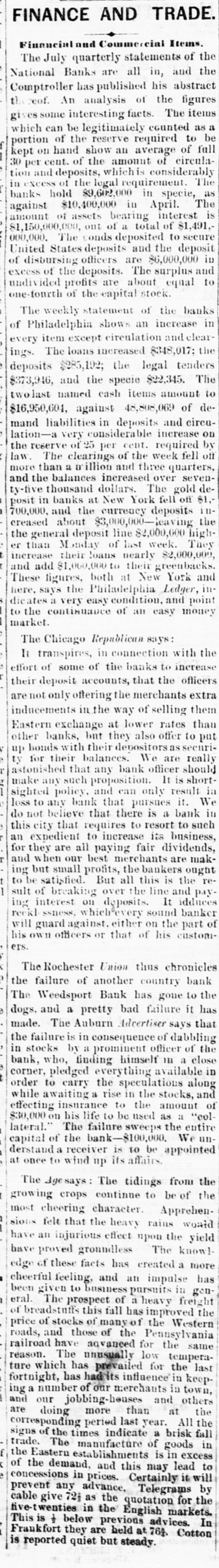 Financial and Commercial Items. The July quarterly statements of the Banks are all in, and the has published Comptroller National his the abstract figures t) reof. An analysis of gives some interesting facts. The items which can be legitimately counted as be a of the reserve required to on hand show an average 30 cent. of the amount of kept portion per considerably circula- of full whichis The of the legal as tion in excess and deposits, requirement. specie, banks hold $9,602,000 in The $10,400,000 in April. is amount against of assets bearing interest $1,150,000,000, out of a total of $1,491,000,000. The conds deposited to secure United States deposits and the deposit in of disbursing officers are $6,000,000 and excess of the deposits. The surplus to undivided profits are about equal one-fourth of the capital stock. The weekly statement of the banks in of Philadelphia shows an increase every item except circulation and clear the ings. The loans increased $348,017: deposits $285,192; the legal tenders The $373,946, and the specie $22,345. twolast named cash items amount to $16,950,604, against 48,808,069 of demand liabilities in deposits and circulation-a very considerable increase on by of 25 per cent. required of the week than a million and three more law. the reserve The clearings quarters. fell seven- off and the balances increased over ty-tive thousand dollars. The gold de- 81,in banks at New York fell off in700,000, posit and the currency deposits the creased about $3,000,000-leaving the general deposit line $2,000,000 They highthan Monday of last week. er increase their loans nearly $2,000,009, and add $1,000,000 to their greenbacks and These figures, both at New York insays the Philadelphia Ledger, dicates here, a very easy condition, and point the continuance of an easy money market. The Chicago Republican says: It transpires, in connection with the effort of some of the banks to increase their deposit accounts, that the officers are not only offering the merchants extra inducements in the way of selling them Eastern exchange at lower rates than other banks, but they also offer to put bonds with their depositors securi- really up their balances. We are that any bank shortsuch proposition. in astonished make ty for any officer It result is should sighted policy. and can only it. We loss to any bank that pursues believe that there is a bank in that requires to resort to increase its this do not an expedient city dividends, business, to such are all paying fair our best merchants are but small profits, the But all this and for ing they when bankers is the ought mak- reof over the interest on deposits. It banker sult ing to be satisfied. breaking line and idduces payreckle ssness, which every sound will guard against. either on the part of his own officers or that of his customers. The Rochester Union thus chronicles the failure of another country bank The Weedsport Bank has gone to has the dogs, and a pretty bad failure it made. The Auburn Advertiser says that the failure is in consequence of dabbling of the stocks by a prominent officer close bank, in who, finding himself 111 a in corner, pledged everything available order to carry the speculations along and a rise in the stocks, of insurance to the on his life to be used as a $30,000 effecting while awaiting amount the entire "collateral." The failure sweeps capital of the bank-$100,000. We understand a receiver is to be appointed at once to wind up its affairs. The Agesays: The tidings from the growing crops continue to be of the most cheering character. Apprehensions felt that the heavy rains would have an injurious effect upon the yield knowlhave proved groundless The edge of these facts has created a more cheerful feeling, and an impulse has been given to business pursuits in general. The prospect of a heavy freight this fall has improved the of stocks of many of the and those of the roads, price of breadstuffs Pennsylvania Western railroad have advanced for the same The unusually low temperahas prevailed has had its number of our and fortnight, ing ture reason. are a which our jobbing-heuses merchants influence for and in the in others town, keep- last the the peried last year. corresponding doing more than brisk at All fall signs of the times indicate a in trade. The manufacture of goods the Eastern establishments is in excess of the demand, and this may lead to in prices. any advance, concessions prevent Certainly Telegrams for will the by cable give 72j as the quotation in the below previous This five-twenties is t English advices. markets. In Frankfort they are held at 764. Cotton is reported quiet but steady.