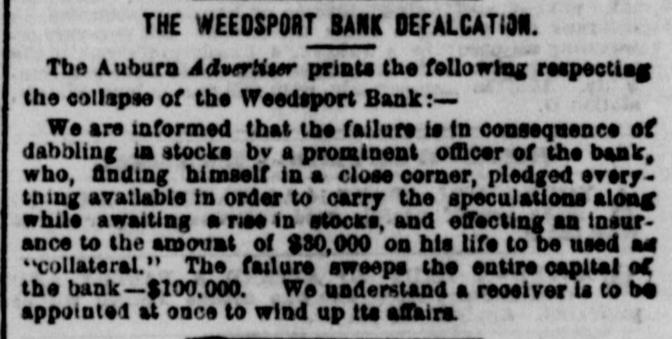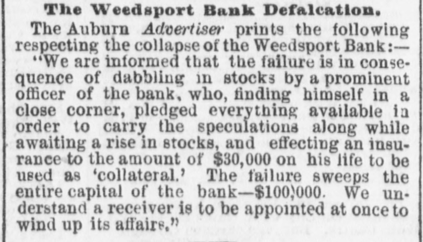 THE WEEDSPORT BANK DEFALCATION. The Auburn Advertiser prints the following respecting the collapse of the Weedsport Bank:We are informed that the failure is in consequence of dabbling in stocks bv a prominent officer of the bank, who, finding himself in a close corner, pledged everything available in order to carry the speculations along while awaiting a rise in stocks, and effecting an insurance to the amount of $80,000 on his life to be used ad "collateral." The failure sweeps the entire capital of the bank - $100,000. We understand a receiver is to be appointed at once to wind up its affairs.