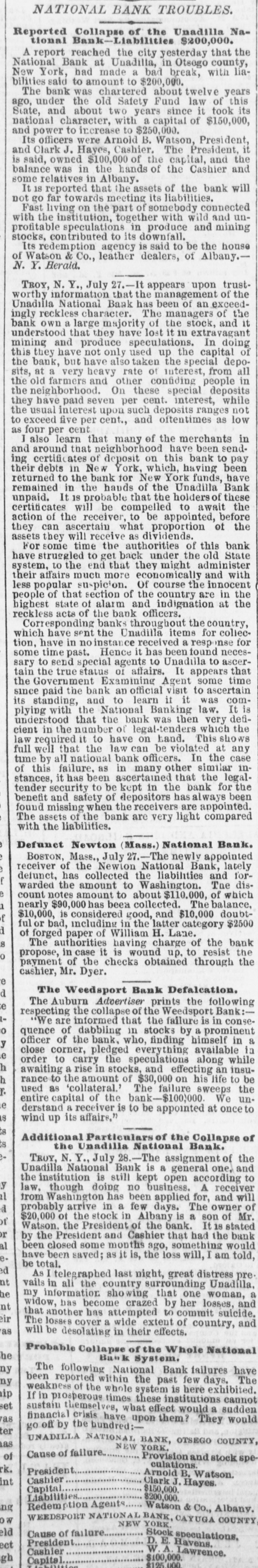 NATIONAL BANK TROUBLES. Reported Collapse of the Unadilla National Bank-Liabilities $200,000. A report reached the city yesterday that the National Bank at Unadilla, in Otsego county, liaNew York, had made a bad break, with bilities said to amount to $200,000. The bank was chartered about twelve years ago, under the old Safety Fund law of this State, and about two years since it took its national character, with a capital of $150,000, and power to increase to $250,000. Its officers were Arnold B. Watson, President and Clark J. Hayes, Cashier. The President, it is said, owned $100,000 of the capital, and the balance was in the hands of the Cashier and some relatives in Albany. will It is reported that the assets of the bank not go far towards meeting its liabilities. Fast living on the part of somebody connected with the institution, together with wild and unprofitable speculations in produce and mining stocks, contributed to its downfall. Its redemption agency is said to be the house of Watson & Co., leather dealers, of Albany. N. Y. Heraid. TROY, N. Y. July 27.-It appears upon trustworthy information that the management of the Unadilla National Bank has been of an exceedingly reckless character. The managers of the bank own a large majority of the stock, and it understood that they have lost it in extravagant mining and produce speculations. In doing this they have not only used up the capital of the bank, but have also taken the special deposits, at a very heavy rate of interest, from all the old farmers and other confiding people in the neighborhood. On these special deposits they have paid seven per cent. interest, while the usual interest upon such deposits ranges not to exceed five per cent., and oftentimes as low as four per cent also learn that many of the merchants in and around that neighborhood have been sending certific ates of deposit on this bank to pay their debts in New York, which, having been returned to the bank for New York funds, have remained in the hands of the Unadilla Bank unpaid. It 18 probable that the holders of these certificates will be compelled to await the action of the receiver, to be appointed, before the they can ascertain what proportion of assets they will receive as dividends. For some time the authorities of this bank have struggled to get back under the old State system, to the end that they might administer their affairs much more economically and with less popular suspicion. Of course the innocent people of that section of the country are in the highest state of alarm and indignation at the reckless acts of the bank officers. Corresponding banks throughout the country, which have sent the Unadilla items for collection, have in no instance received a response for some time past. Hence it has been found necessary to send special agents to Unadilla to ascertain the true status of affairs. It appears that the Government Examining Agent some time since paid the bank an official visit to ascertain its standing, and to learn it it was complying with the National Banking law. It is understood that the bank was then very deficient in the number of legal-tenders which the law required it to have on hand. This shows full well that the law can be violated at any time by all national bank officers. In the case of this failure, as in many other similar instances, it has been ascertained that the legaltender security to be kept in the bank for the benefit and safety of depositors has always been found missing when the receivers are appointed. The assets of the bank are very light compared with the liabilities. Defunct Newton (Mass.) National Bank. BOSTON, Mass., July 27. -The newly appointed receiver of the Newlon National Bank, lately defunct, has collected the liabilities and forwarded the amount to Washington. The discount notes amount to $ 110.000, of which a nearly $90,000 has been collected. The balance, f $10,000, is considered good, and $10,000 doubtfulor bad, including in the latter category $2500 a of forged paper of William H. Lane. The authorities having charge of the bank 0 propose, in case it is wound up, to resist the payment of the checks obtained through the cashier, Mr. Dyer. e d The Weedsport Bank Defalcation. The Auburn Advertiser prints the following e respecting the collapse of the Weedsport Bank:'We are informed that the failure is in conseo quence of dabbling in stocks by a prominent y officer of the bank. who, finding himself in a close corner, pledged everything available in le order to carry the speculations along while h awaiting a rise in stocks, and effecting an insuh rance to the amount of $30,000 on his life to be f used as 'collateral.' The failure sweeps the entire capital of the bank $100,000. We une derstand a receiver is to be appointed at once to is wind up its affairs." ts Additional Particulars of the Collapse of S the Unadilla National Bank. TROY, N. Y., July 28. The assignment of the Unadilla National Bank is a general one. and the institution is still kept open according y law. though doing no business. A receiver al from Washington has been applied for, and will a probably arrive in a few days. The owner of of $20,000 ot the stock in Albany is a son of Mr. Watson, the President of the bank. s tated or by the President and Cashier that had the bank al been closed some months ago, something would e. have been saved; as it is, the loss will, I am told, be total. ed I telegraphed last night, great distress prent vails in ali the country surrounding Unadilla. a he my information showing that one woman, nt widow, has become crazed by her losses, and that another has attempted to commit suicide. eir The losses cover a wide extent of country, and as will be desolating in their effects. Probable Collapse of the Whole National he Bank System. ny The following National Bank failures have ny been reported within the past few days. The weakness of the whole system is here exhibited. hip If in piosperous times these institutions c