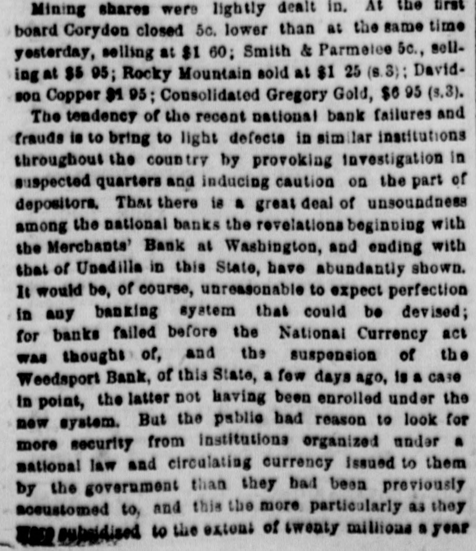 Mining shares were lightly dealt in. At the first board Corydon closed 5c. lower than at the same time yesterday, selling at $1 60: Smith & Parmelee 5c., selling at $5 95; Rocky Mountain sold at $1 25 (s.3): Davidson Copper $1 95; Consolidated Gregory Gold, $6 95 (s.3). The tendency of the recent national bank failures and frauds is to bring to light defects in similar institutions throughout the country by provoking investigation in suspected quarters and inducing caution on the part of depositors. That there is a great deal of unsoundness among the national banks the revelations beginning with the Merchants' Bank at Washington, and ending with that of Unadilla in this State, have abundantly shown. It would be, of course, unreasonable to expect perfection in any banking system that could be devised; for banks failed before the National Currency act was thought of, and the suspension of the Weedsport Bank, of this State, a few days ago, is a case in point, the latter not having been enrolled under the new system. But the pablic bad reason to look for more security from Institutions organized under a national law and circulating currency issued to them by the government than they had been previously accustomed to, and this the more particularly as they subsidised to the extent of twenty millions a year