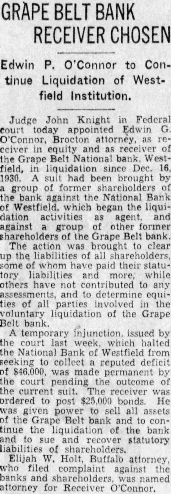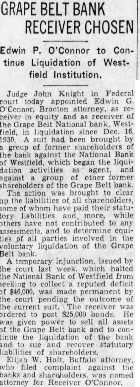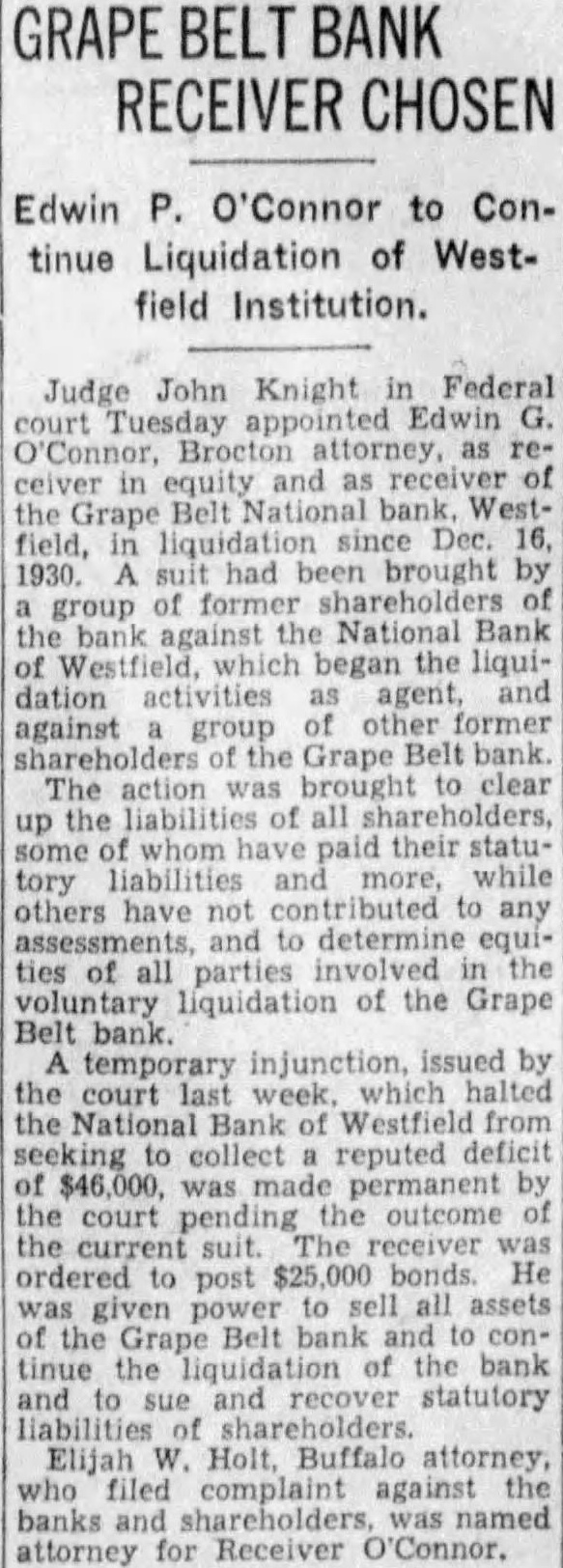 GRAPE BELT BANK RECEIVER CHOSEN Edwin P. O'Connor to Continue Liquidation of Westfield Institution. Judge John Knight in Federal court today appointed Edwin Connor, Brocton attorney, as receiver in equity and as receiver of Grape Belt National bank Westfield, in liquidation Dec. 16, 1930. suit had brought by group of former shareholders of the bank the National Bank Westfield. which began the liquidation activities as agent, and against group other former shareholders the Grape Belt bank. The action was brought to clear up the liabilities of all shareholders, some whom paid their statutory liabilities and more, while others have contributed to any and to determine ties of all parties involved the voluntary liquidation of the Grape Belt bank temporary injunction. issued by the court last week. which halted the National Bank of Westfield from seeking collect reputed deficit $46,000, was made permanent by the court the outcome of the suit. receiver ordered to post $25,000 bonds He given power to sell all assets the Grape Belt bank and to continue the liquidation of the bank and to sue recover statutory liabilities of shareholders. Elijah W. Holt, Buffalo attorney, who filed complaint against the banks and was named attorney for Receiver O'Connor.