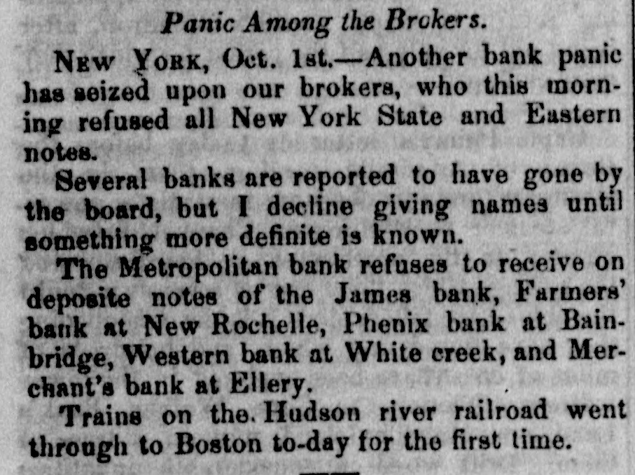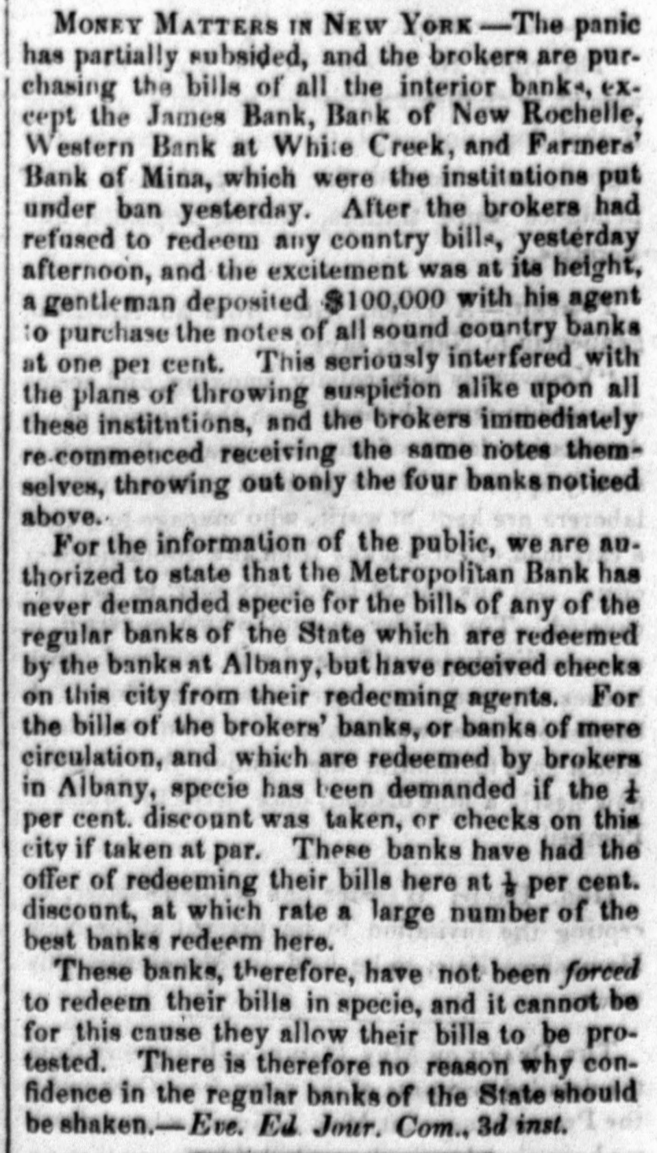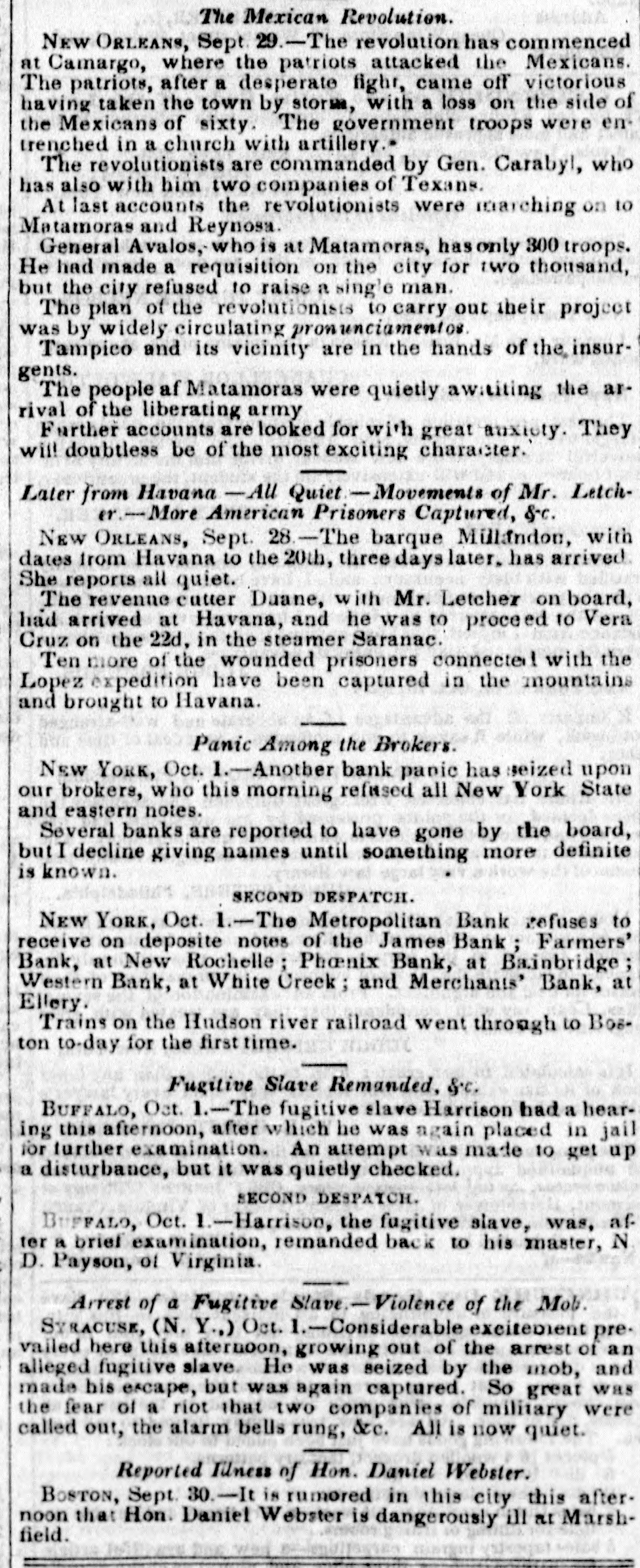 The Mexican Revolution. NEW ORLEANS, Sept. - The revolution has commenced at Camargo, where the patriots attacked the Mexicans. The patriots, after a desperate fight, came off victorious having taken the town by storm, with a loss on the side of the Mexicans of sixty. The government troops were entrenched in a church with artillery.* The revolutionists are commanded by Gen. Carabyl, who has also with him two companies of Texans. At last accounts the revolutionists were marching on to Matamoras and Reynosa. General Avalos, who is at Matamoras, has only 300 troops. He had made a requisition on the city for two thousand, but the city refused to raise a single man. The plan of the revolutionists to carry out their project was by widely circulating pronunciamentos Tampico and its vicinity are in the hands of the, insurgents. The people af Matamoras were quietly aw stiting the arrival of the liberating army Further accounts are looked for with great auxiety. They will doubtless be of the most exciting character. Later from Havana - -All Quiet.-Movements of Mr. Letcher -More American Prisoners Captured, &c. NEW ORLEANS, Sept. -The barque Millandor, with dates from Havana to the 20th, three days later. has arrived She reports all quiet. The revenne cutter Daane, with Mr. Letcher on board, had arrived at Havana, and he was to proceed to Vera Cruz on the 22d, in the steamer Saranac. Ten more of the wounded prisoners connected with the Lopez expedition have been captured in the mountains and brought to Havana. Panic Among the Brokers. New YORK, Oct. 1.-Another bank panic has seized upon our brokers, who this morning refused all New York State and eastern notes. Several banks are reported to have gone by the board, but I decline giving names until something more definite is known. SECOND DESPATCH. NEW YORK, Oct. 1. - The Metropolitan Bank refuses to receive on deposite notes of the James Bank; Farmers' Bank, at New Rochelle ; Phonix Bank, at Bainbridge; Western Bank, at White Creek; and Merchants' Bank, at Ellery. Trains on the Hudson river railroad went through to Boston to-day for the first time. Fugitive Slave Remanded, S.C. BUFFALO, Oat. 1.-The fugitive slave Harrison had a hearing this afternoon, after which he was again placed in jail for further examination. An attempt was made to get up a disturbance, but it was quietly checked. SECOND DESPATCH. BUFFALO, Oct. 1.-Harrison, the fugitive slave, was, af ter a brief examination, remanded back to his master, N D. Payson, of Virginia. Arrest of a Fugitive Stave.-Violence of the Mob. SYRACUSE, (N. Y.,) Oct. .Considerable excitement prevailed here this afternoon, growing out of the arrest of an alleged fugitive slave He was seized by the mob, and made his escape, but was again captured. So great was the fear of a riot that two companies of military were called out, the alarm bells rung, &c. All is now quiet. Reported Illness of Hon. Daniel Webster. BOSTON, Sept. 30.-It is rumored in this city this afternoon that Hon. Daniel Webster is dangerously ill at Marshfield.