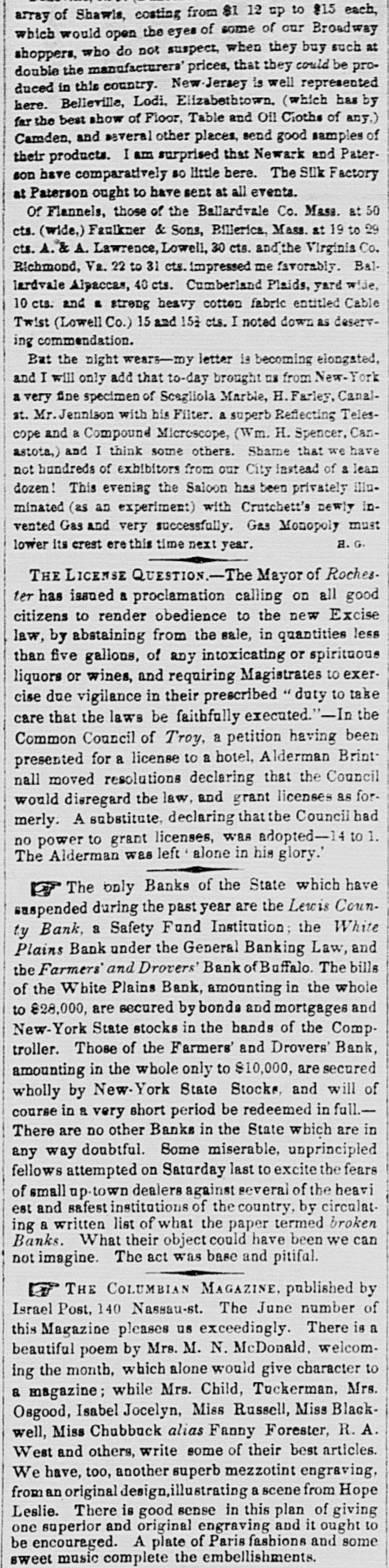 array of Shawls, costing from $1 12 up to $15 each, which would open the eyes of some of our Broadway shoppers, who do not suspect, when they buy such at double the manufacturers' prices, that they could be produced in this country. New Jersey is well represented here. Belleville, Lodi, Elizabethtown, (which has by far the best show of Floor, Table and Oil Cioths of any.) Camden, and several other places, send good samples of their products. I am surprised that Newark and Paterson have comparatively so little here. The Silk Factory at Paterson ought to have sent at all events. Of Flannels, those of the Ballardvale Co. Masa. at 50 cts. (wide,) Faulkner & Sons, Pillerica, Mass. at 19 to 29 cts. A. & A. Lawrence, Lowell, 30 cts. and the Virginia Co. Richmond, Va. 22 to 31 cts. impressed me favorably. Ballardvale Alpaccas, 40 cts. Cumberland Plaids, yard wide, 10 cts. and a streng heavy cotton fabric entitled Cable Twist (Lowell Co.) 15 and 152 cts. I noted down as deserving commendation. But the night wears-my letter is becoming elongated, and I will only add that to-day brought us from New-York a very fine specimen of Scagliola Marble, H. Farley, Canal-at. Mr. Jennison with his Filter. a superb Reflecting Telescope and a Compound Microscope, (Wm. H. Spencer, Canastota,) and I think some others. Shame that we have not hundreds of exhibitors from our City instead of a lean dozen! This evening the Saloon has been privately illuminated (as an experiment) with Crutchett's newly invented Gas and very successfully. Gas Monopoly must lower its crest ere this time next year. H. G. # THE LICENSE QUESTION. The Mayor of Rochester has issued a proclamation calling on all good citizens to render obedience to the new Excise law, by abstaining from the sale, in quantities less than five gallons, of any intoxicating or spirituous liquors or wines, and requiring Magistrates to exercise due vigilance in their prescribed "duty to take care that the laws be faithfully executed."-In the Common Council of Troy, a petition having been presented for a license to a hotel, Alderman Brintnall moved resolutions declaring that the Council would disregard the law, and grant licenses as formerly. A substitute, declaring that the Council had no power to grant licenses, was adopted-14 to 1. The Alderman was left alone in his glory.' The only Banks of the State which have suspended during the past year are the Lewis County Bank, a Safety Fund Institution; the White Plains Bank under the General Banking Law, and the Farmers' and Drovers' Bank of Buffalo. The bills of the White Plains Bank, amounting in the whole to $28,000, are secured by bonds and mortgages and New-York State stocks in the hands of the Comptroller. Those of the Farmers' and Drovers' Bank, amounting in the whole only to $10,000, are secured wholly by New-York State Stocks, and will of course in a very short period be redeemed in full.- There are no other Banks in the State which are in any way doubtful. Some miserable, unprincipled fellows attempted on Saturday last to excite the fears of small up-town dealers against several of the heaviest and safest institutions of the country, by circulating a written list of what the paper termed broken Banks. What their object could have been we cannot imagine. The act was base and pitifal. # THE COLUMBIAN MAGAZINE published by Israel Post, 140 Nassau-st. The June number of this Magazine pleases us exceedingly. There is a beautiful poem by Mrs. M. N. McDonald, welcoming the month, which alone would give character to a magazine; while Mrs. Child, Tuckerman, Mrs. Osgood, Isabel Jocelyn, Miss Russell, Miss Blackwell, Miss Chubbuck alias Fanny Forester, R. A. West and others, write some of their best articles. We have, too, another superb mezzotint engraving, from an original design, illustrating a scene from Hope Leslie. There is good sense in this plan of giving one superior and original engraving and it ought to be encouraged. A plate of Paris fashions and some sweet music complete the embellishments.