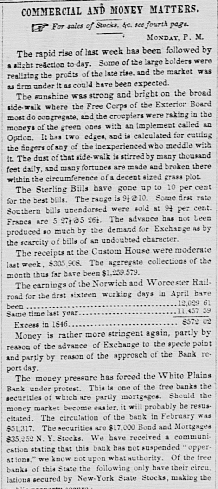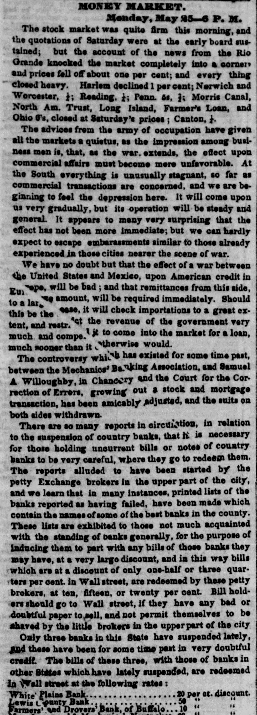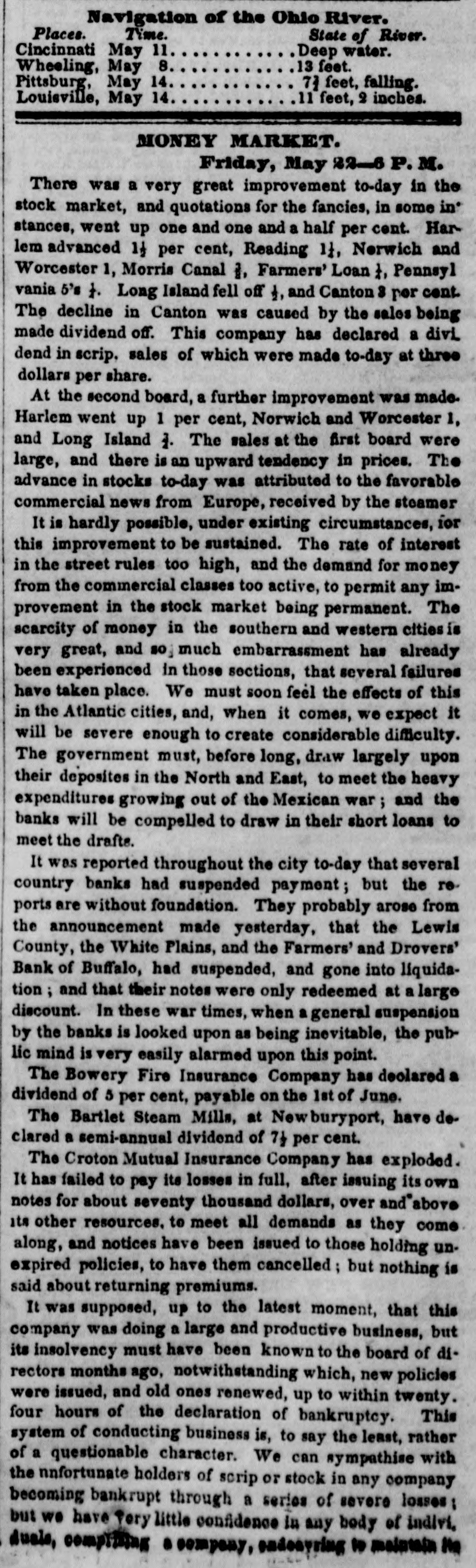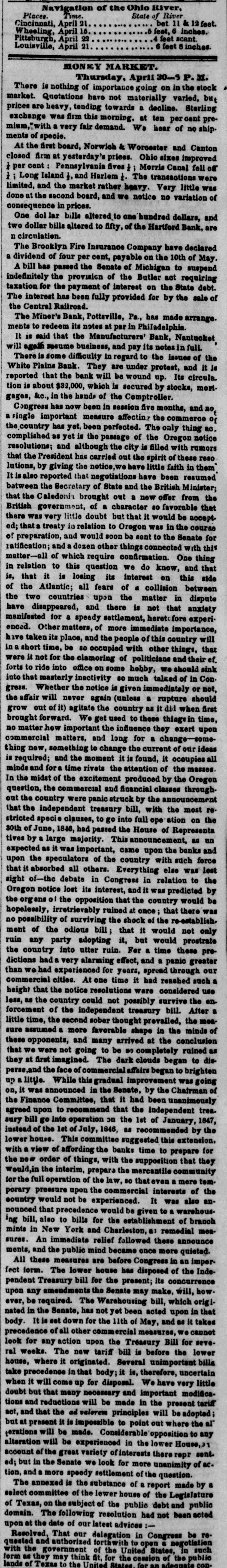 Navigation of the Ohio River, River Places Time. State of bet 11 & 12 feet. Cincinnati. April 21 Wheeling. April 15 feet, inches. Pittsburgh April 22 feet scant. 6 feet Sinches. Louisville, April 21. MONEY MARKET. Thursday, April 30-9 P.M. There is nothing of importance going on in the stock market. Quotations have not materially varied, bu prices are heavy, tending towards a decline. Sterling exchange was firm this morning, at ten per cent premium,"with a very fair demand. W. hear of no ship. ments of specie. At the first board, Norwich k Worcester and Canton closed firm at yesterday's prices. Ohio sixes improved 1 per cent Pennsylvania fives Morris Canal fell of Long Island 1. and Harlem t. The transactions were limited, and the market rather heavy. Very little was done at the second board, and we notice no variation of consequence in prices. One dol lar bills altered to one hundred dollars, and two dollar bills altered to fifty, of the Hartford Bank, are n circulation. The Brooklyn Fire Insurance Company have declared a dividend of four per cent, payable on the 10th of May A bill has passed the Senate of Michigan to suspend indefinitely the provision of the Butler act requiring taxation for the payment of interest on the State debt. The interest has been fully provided for by the sale of the Central Railroad The Miner's Bank, Pottsville, Pa., has made arrange. ments to redeem its notes at par in Philadelphia. It is said that the Manufacturers' Bank, Nantucket will again sosume business, and pay its notes in full. There is some difficulty in regard to the issues of the White Plains Bank. They are under protest, and it is reported that the bank will be wound up. Its circula. tion is about $32,000, which is secured by stocks, mort gages, &c., in the hands of the Comptroller. Congress has now been in session five months, and not a single important measure affecting the commerce of the country has yet, been perfected. The only thing ac. complished as yet is the passage of the Oregon notice resolutions; and although the city is filled with rumors that the President has carried out the spirit of these reso lutions, by giving the notice,we have little faith in them It also reported that negotiations have been resumed batween the Secretary of State and the British Minister; that the Caledonia brought out new offer from the British government, of a character so favorable that there was very little doubt but that it would be accepted; that a treaty in relation to Oregon was in the course of preparation, and would soon ba sent to the Senate for ratification: and dozen other things connected with this matter-all of which require confirmation. One thing in relation to this question we do know, and that is, that it is losing its interest on this side of the Atlantic; all fears of a collision between the two countries upon the matter in dispute have disappeared, and there is not that anxiety manifested for a speedy settlement, heret fore experienced. Other matters, of more immediate importance, have taken its place, and the people of this country will in a short time, be so occupied with other things, that were it not for the clamoring of politicians and their ef. forts to ride into office on some hobby, we should sink into that masterly inactivity so much talked of in Con gress. Whether the notice is given immediately or not, the affair will never again (unless a rupture should grow out of it) agitate the country as it did when first brought forward. We get used to these things in time, no matter how important the influence they exert upon commercial matters. and long for a change-something new, something to change the current of our ideas is required; and the moment it is found. it ocoupies all minds and for a time rivets the attention of the masses. In the midst of the excitement produced by the Oregon question, the commercial and financial classes throughout the country were panic struck by the announcement that the independent treasury bill, with the most re stricted specie clauses, to go into full ope ation on the 30th of June 1846, had passed the House of Represents tives by large majority. This announcement, as un expected as it was important, came upon the banks and upon the speculators of the country with such force that it absorbed all others. Everything else was lost sight of-the debate in Congress in relation to the Oregon notice lost its interest, and it was predicted by the organs of the opposition that the country would be hopelessly, irretrievably ruined at once; that there was no possibility of surviving the shock of the re-establish. ment of the odious bill; that it would not only ruin any party adopting it, but would prostrate the country into utter ruin. For a time these predictions had very alarming effect, and a panic greater than we had experienced for years, spread through our commercial cities. At one time it had reached such a height that the notice resolutions were considered use less, as the country could not possibly survive the enforcement of the independent treasury bill. After a little time, the second sober thought prevailed, the messure assumed a more favorable shape in the minds of these opponents, and many arrived at the conclusion that we were not going to be so completely ruined as they at first imagined. The dark clouds began to disperse, the face of commercial affairs began to brighten a little While this gradual improvement was going on, it was announced in the Senate, by the Chairman of the Finance Committee, that it had been unanimously agreed upon to recommend that the independent trea. sury bill go into operation on the 1st of January, 1847, instead of the 1st of July, 1846, as recommended by the lower house. This committee suggested this extension. with view of affording the banks time to prepare for the new order of things, with the supposition that they would,in the interim, prepara the mercantile community or the full operation of the law, so that eve