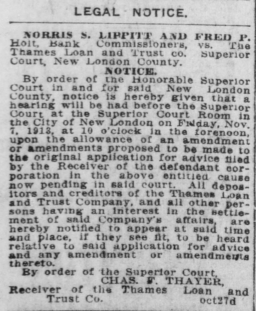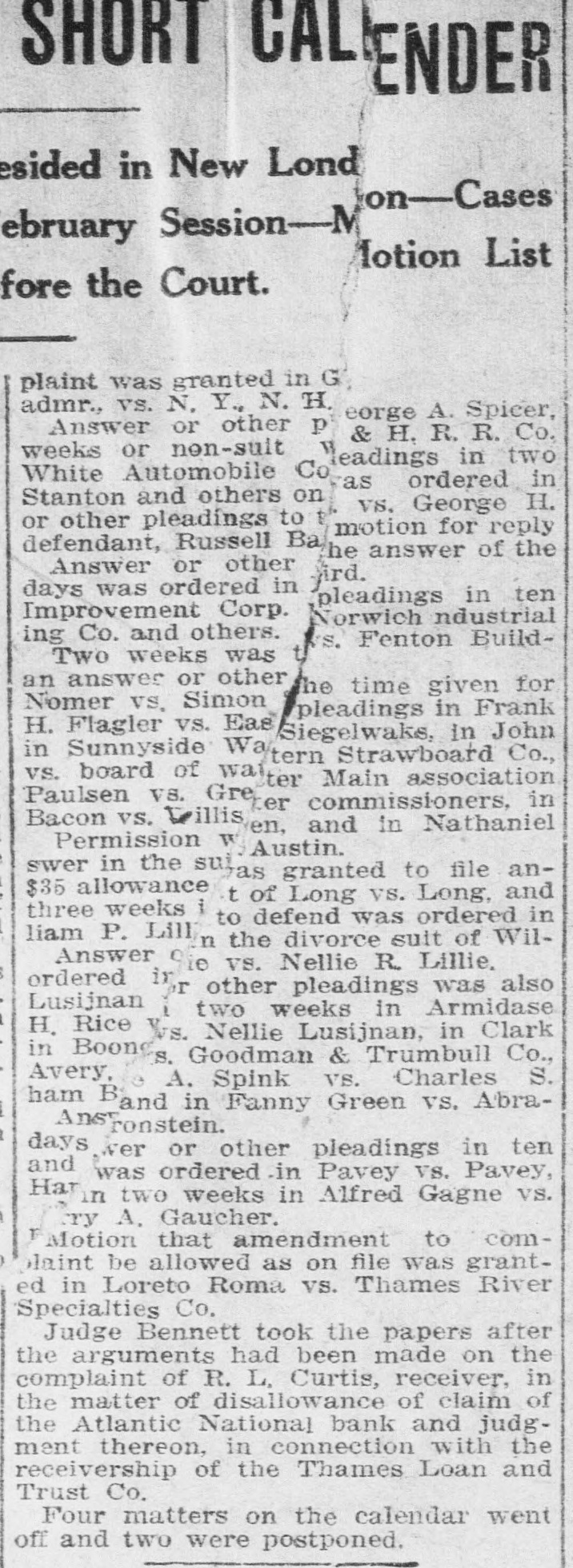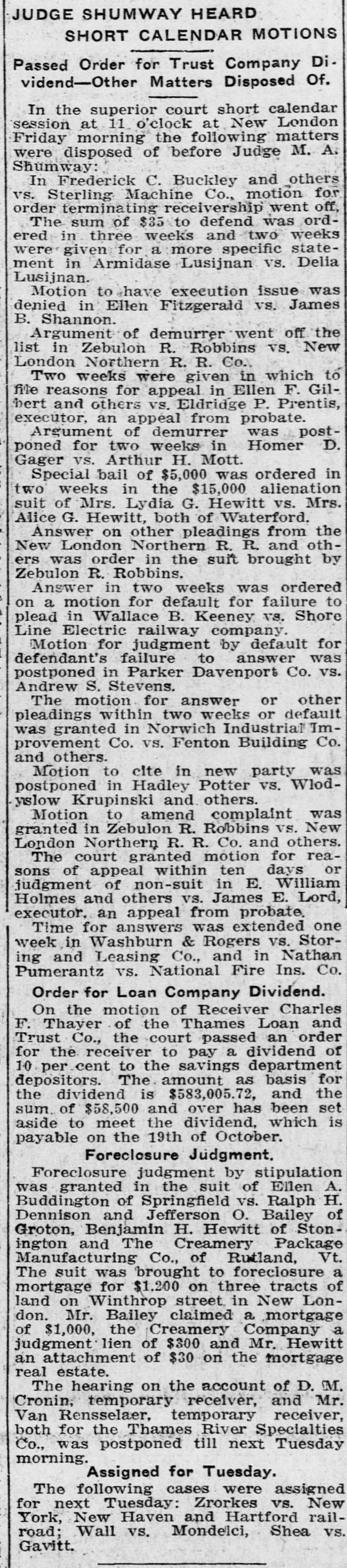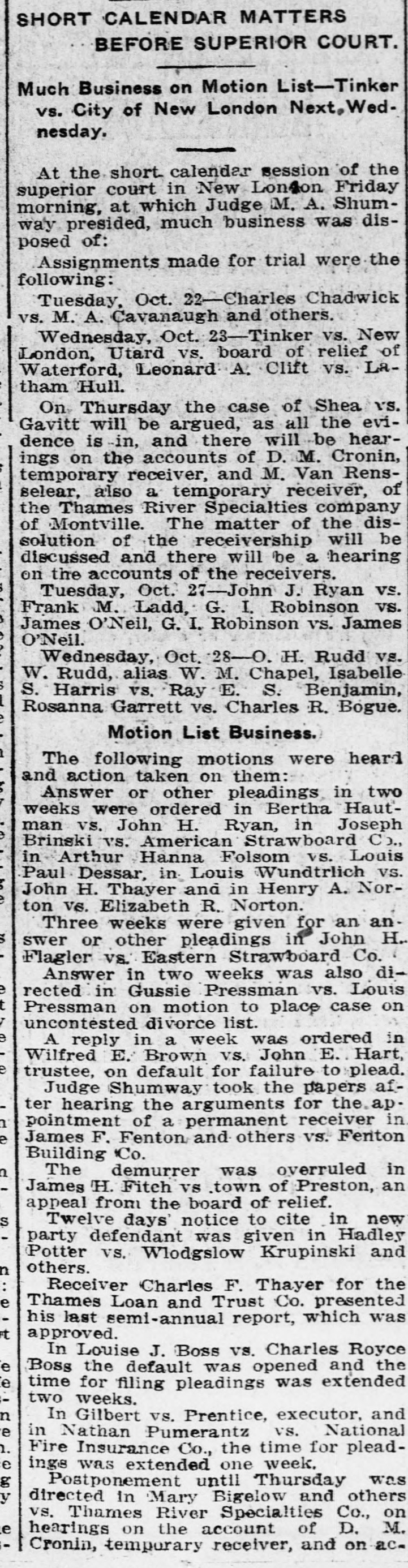 SHORT CALENDAR MATTERS BEFORE SUPERIOR COURT. Much Business on Motion List-Tinker vs. City of New London Next,Wednesday. At the short. calendar session of the superior court in New London Friday morning, at which Judge M. A. Shumway presided, much business was disposed of: Assignments made for trial were the following: Tuesday, Oct. 22-Charles Chadwick vs. M. A. Cavanaugh and others. Wednesday, Oct. 23-Tinker vs. New London, Utard VS. board of relief of Waterford, Leonard A. Clift vs. Latham Hull. On Thursday the case of Shea vs. Gavitt will be argued, as all the evidence is in, and there will be hearings on the accounts of D. M. Cronin, temporary receiver, and M. Van Rensselear, also a temporary receiver, of the Thames River Specialties company of Montville. The matter of the dissolution of the receivership will be discussed and there will be a hearing on the accounts of the receivers. Tuesday, Oct. 27-John J. Ryan vs. Frank M. Ladd, G. I. Robinson VS. James O'Neil, G. I. Robinson vs. James O'Neil. Wednesday, Oct. 28-0. H. Rudd vs. W. Rudd, alias. W. M. Chapel, Isabelle S. Harris vs. Ray E. S. Benjamin, Rosanna Garrett VS. Charles R. Bogue. Motion List Business. The following motions were heard and action taken on them: Answer or other pleadings in two weeks were ordered in Bertha Hautman vs. John H. Ryan, in Joseph Brinski vs. American Strawboard Co., in Arthur Hanna Folsom vs. Louis Paul Dessar, in Louis Wundtrlich vs. John H. Thayer and in Henry A. Norton VS. Elizabeth R. Norton. Three weeks were given for an answer or other pleadings in John H. Flagler vs. Eastern Strawboard Co. Answer in two weeks was also directed in Gussie Pressman vs. Louis Pressman on motion to place case on uncontested divorce list. A reply in a week was ordered in Wilfred E. Brown VS. John E. Hart, trustee, on default for failure to plead. Judge Shumway took the papers after hearing the arguments for the appointment of a permanent receiver in. James F. Fenton and others vs. Fenton Building Co. The demurrer was overruled in James H. Fitch vs town of Preston, an appeal from the board of relief. S Twelve days' notice to cite in new party defendant was given in Hadley Potter vs. Wlodgslow Krupinski and others. n : Receiver Charles F. Thayer for the e Thames Loan and Trust Co. presented his last semi-annual report, which was t approved. In Louise J. Boss vs. Charles Royce e Boss the default was opened and the le time for filing pleadings was extended two weeks. n In Gilbert vs. Prentice, executor, and e in Nathan Pumerantz vs. National h. Fire Insurance Co., the time for pleade ings was extended one week. g Postponement until Thursday was y directed in Mary Bigelow and others vs. Thames River Specialties Co., on e hearings on the account of D. M. Cronin, temporary receiver, and on ac-