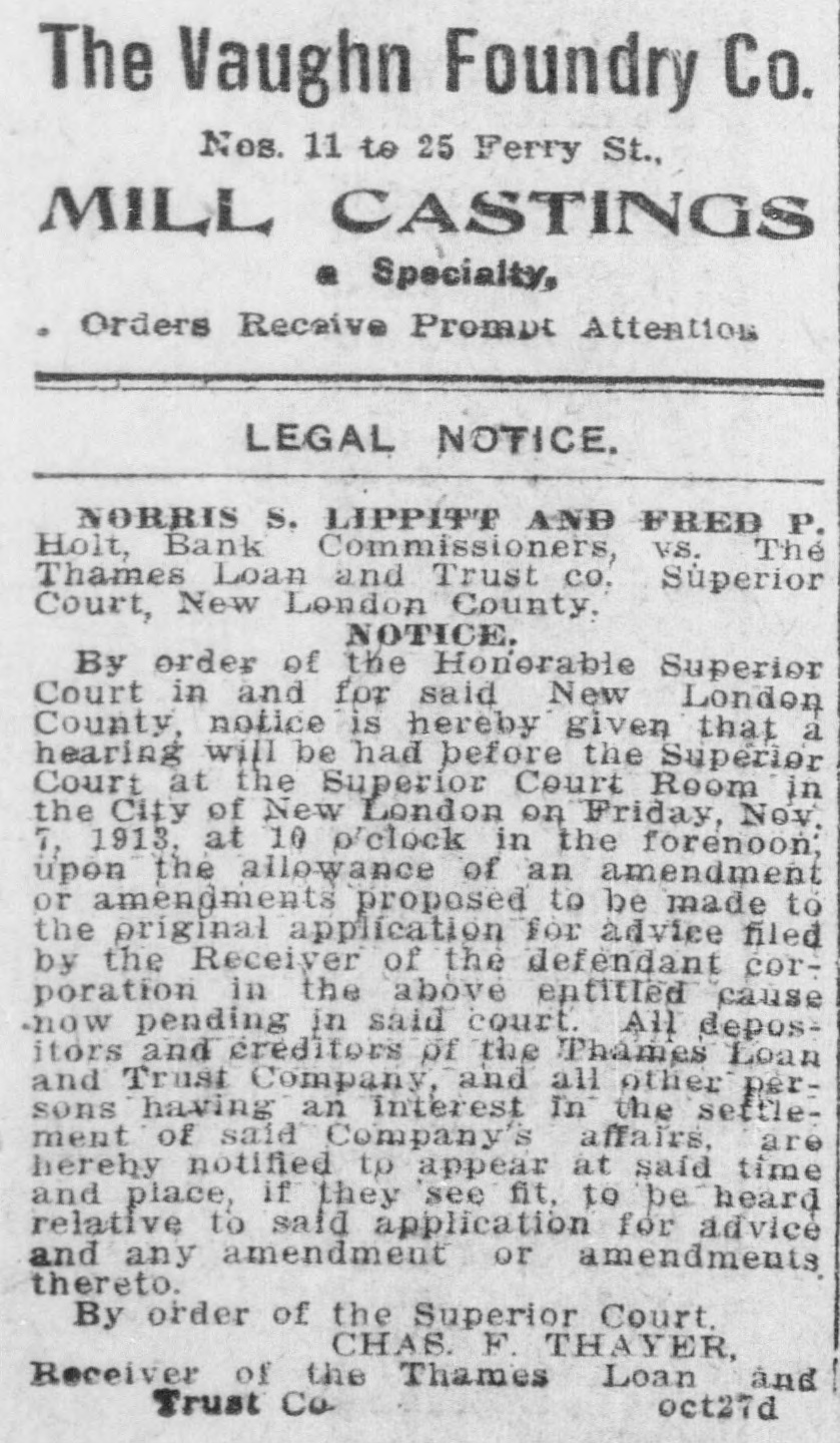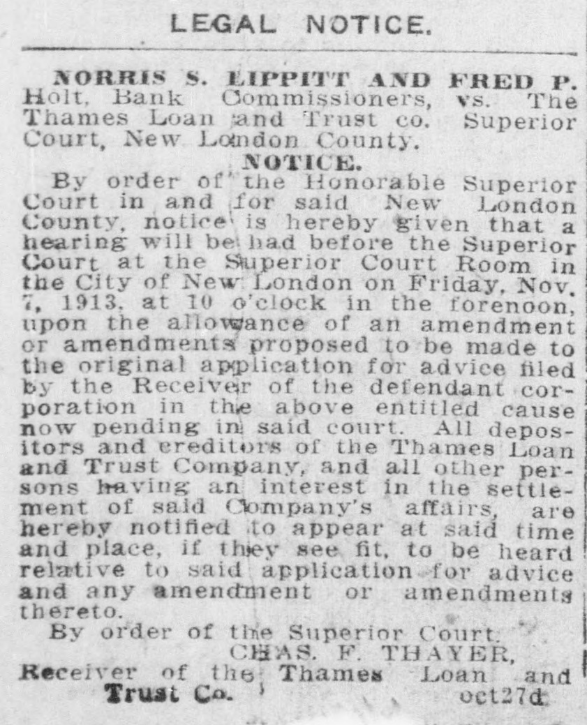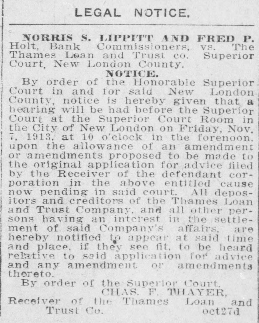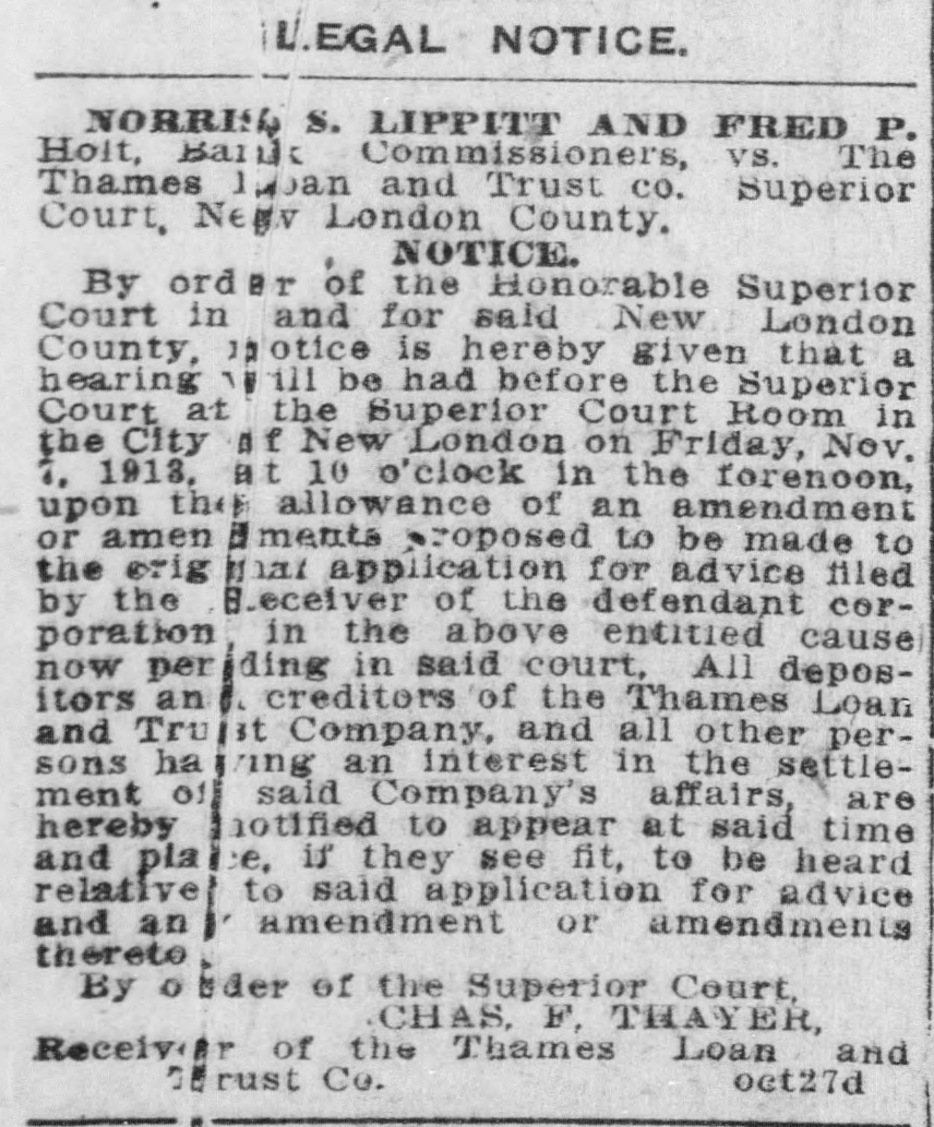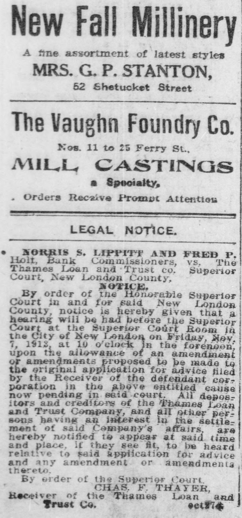 SHORT CALENDAR MATTERS BEFORE SUPERIOR COURT. Much Business on Motion List-Tinker vs. City of New London Next,Wednesday. At the short. calendar session of the superior court in New London Friday morning, at which Judge M. A. Shumway presided, much business was disposed of: Assignments made for trial were the following: Tuesday, Oct. 22-Charles Chadwick vs. M. A. Cavanaugh and others. Wednesday, Oct. 23-Tinker vs. New London, Utard VS. board of relief of Waterford, Leonard A. Clift vs. Latham Hull. On Thursday the case of Shea vs. Gavitt will be argued, as all the evidence is in, and there will be hearings on the accounts of D. M. Cronin, temporary receiver, and M. Van Rensselear, also a temporary receiver, of the Thames River Specialties company of Montville. The matter of the dissolution of the receivership will be discussed and there will be a hearing on the accounts of the receivers. Tuesday, Oct. 27-John J. Ryan vs. Frank M. Ladd, G. I. Robinson VS. James O'Neil, G. I. Robinson vs. James O'Neil. Wednesday, Oct. 28-0. H. Rudd vs. W. Rudd, alias. W. M. Chapel, Isabelle S. Harris vs. Ray E. S. Benjamin, Rosanna Garrett VS. Charles R. Bogue. Motion List Business. The following motions were heard and action taken on them: Answer or other pleadings in two weeks were ordered in Bertha Hautman vs. John H. Ryan, in Joseph Brinski vs. American Strawboard Co., in Arthur Hanna Folsom vs. Louis Paul Dessar, in Louis Wundtrlich vs. John H. Thayer and in Henry A. Norton VS. Elizabeth R. Norton. Three weeks were given for an answer or other pleadings in John H. Flagler vs. Eastern Strawboard Co. Answer in two weeks was also directed in Gussie Pressman vs. Louis Pressman on motion to place case on uncontested divorce list. A reply in a week was ordered in Wilfred E. Brown VS. John E. Hart, trustee, on default for failure to plead. Judge Shumway took the papers after hearing the arguments for the appointment of a permanent receiver in. James F. Fenton and others vs. Fenton Building Co. The demurrer was overruled in James H. Fitch vs town of Preston, an appeal from the board of relief. S Twelve days' notice to cite in new party defendant was given in Hadley Potter vs. Wlodgslow Krupinski and others. n : Receiver Charles F. Thayer for the e Thames Loan and Trust Co. presented his last semi-annual report, which was t approved. In Louise J. Boss vs. Charles Royce e Boss the default was opened and the le time for filing pleadings was extended two weeks. n In Gilbert vs. Prentice, executor, and e in Nathan Pumerantz vs. National h. Fire Insurance Co., the time for pleade ings was extended one week. g Postponement until Thursday was y directed in Mary Bigelow and others vs. Thames River Specialties Co., on e hearings on the account of D. M. Cronin, temporary receiver, and on ac-