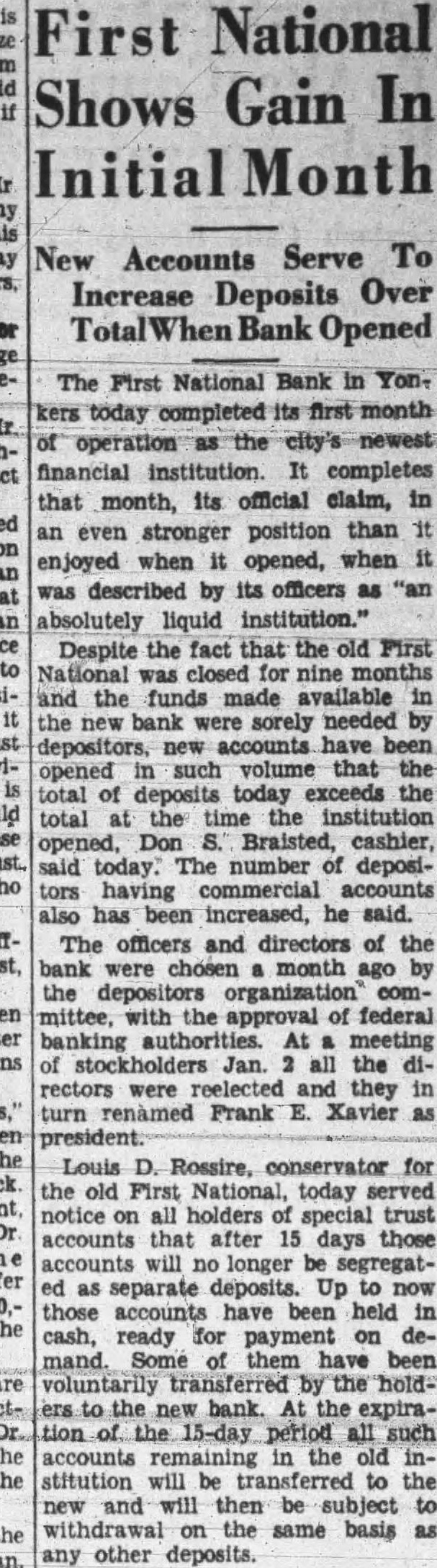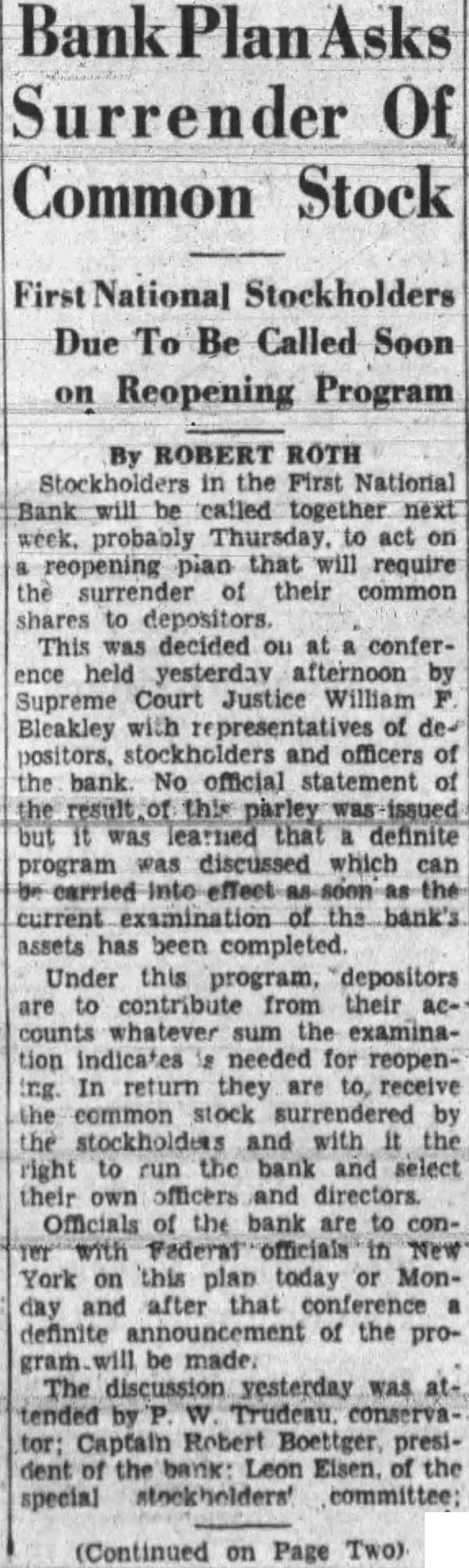 Surrender Of Common Stock First National Stockholders Due To Be Called Soon on Reopening Program By ROBERT ROTH Stockholders in First National be called together next week. probably Thursday. act on reopening pian that require the their common shares to This was decided on conferheld yesterday afternoon Supreme Court Justice William Bleakley with representatives of stockholders officers the bank. No official statement this parley issued learned that definite program discussed which can carried effect current examination of the bank's assets has been completed. Under this program. depositors contribute from their accounts whatever the examination indicates needed for reopenIn return they are to, receive common stock surrendered by stockholders and with the right to run the bank and select their own officers and directors. Officials the bank are to conYork on this plan today Monday and after that conference definite announcement of the prowill be The discussion yesterday tended Trudeau conservaCaptain Robert president Eisen. of the special stockholders' (Continued on Page Two)