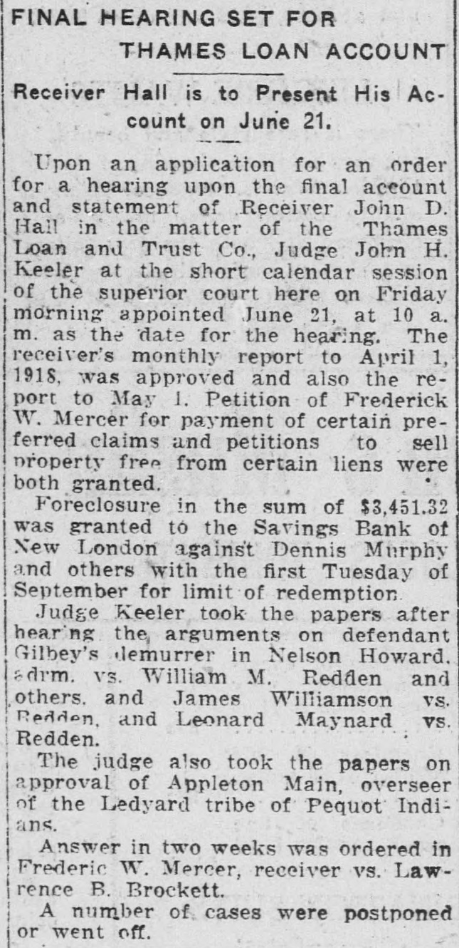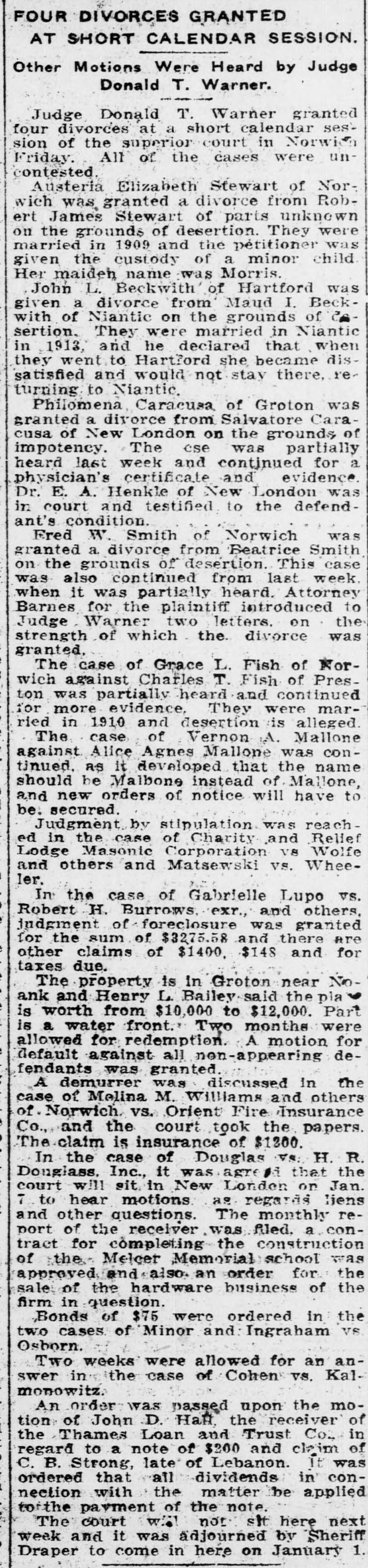 FOUR DIVORCES GRANTED AT SHORT CALENDAR SESSION. Other Motions Were Heard by Judge Donald T. Warner. Judge Donald T. Warner granted four divorces at a short calendar session of the superior court in Norwich Friday. All of the cases were uncontested. Austeria Elizabeth Stewart of Norwich was granted a divorce from Robert James Stewart of parts unknown on the grounds of desertion. They were married in 1909 and the pétitioner was given the custody of a minor child Her maiden name was Morris. John L. Beckwith of Hartford was given a divorce from Maud I. Beckwith of Niantic on the grounds of CAsertion. They were married in Niantic in 1913, and he declared that when they went to Hartford she became dissatisfied and would not stay there, returning to Niantic. Philomena Caracusa of Groton was granted a divorce from Salvatore Caracusa of New London on the grounds of impotency. The cse was partially heard last week and continued for a physician's certificate and evidence Dr. E. A. Henkle of New London was in court and testified to the defendant's condition Fred W. Smith of Norwich was granted a. divorce from Beatrice Smith on the grounds of desertion. This case was also continued from last week. when it was partially heard. Attorney Barnes for the plaintiff introduced to Judge Warner two letters. on the strength of which the. divorce was granted. The case of Grace L. Fish of Norwich against Charles T. Fish of Preston was partially heard and continued for more evidence, They were married in 1910 and desertion is alleged. The case of Vernon A. Mallone against Alice Agnes Mallone was continued. RS it developed that the name should be Malbone instead of Mallone, and new orders of notice will have to be. secured. Judgment by stipulation was reached in the case of Charity and Relief Lodge Masonic Corporation V8 Wolfe and others and Matsewski vs. Wheeler. In the case of Gabrielle Lupo vs. Robert H. Burrows. exr., and others. indgment of foreclosure was granted for the sum of $3275.58 and there are other claims of $1400. $148 and for taxes due. The property is in Groton near Noank and Henry L. Bailey said the pla is worth from $10,000 to $12,000. Part is a water front. Two months were allowed for redemption. A motion for default against all non-appearing defendants was granted A demurrer was discussed in the case of Melina M. Williams and others of Norwich vs. Orient Fire Insurance Co., and the court took the papers. The claim is insurance of $1200. In the case of Douglas TS: H. R. Donglass, Inc., it was agre 18 that the court will sit in New London on Jan. 7 to hear motions as regards liens and other questions. The monthly report of the receiver was filed. a contract for cômpleting the construction of the Melcer Memorial school was approved and also. an order for the sale of the hardware business of the firm in question. Bonds of $75 were ordered in the two cases of Minor and Ingraham vs Osborn. Two weeks were allowed for an answer in the case of Cohen VS. Kalmonowitz. An order was passed upon the motion of John D. Hall the receiver of the Thames Loan and Trust Co., in regard to a note of $200 and claim of C. B. Strong, late of Lebanon. It was ordered that all dividends in connection with the matter be applied torthe payment of the note. The court will not sit here next week and it was adjourned by Sheriff Draper to come in here on January 1.