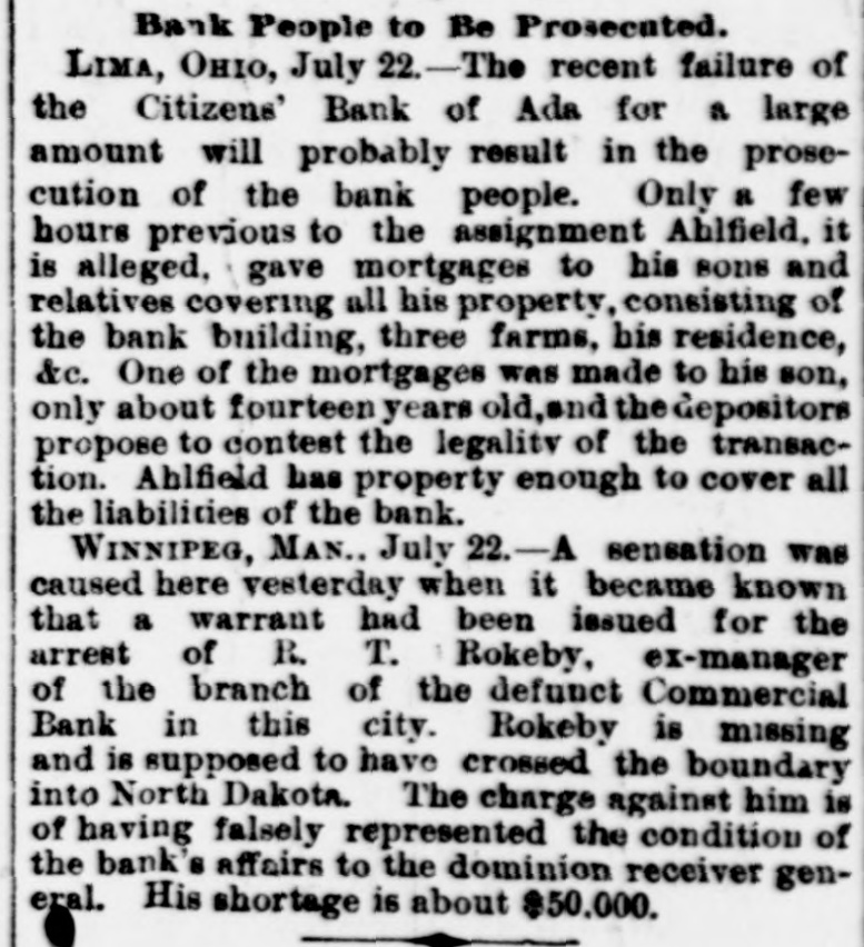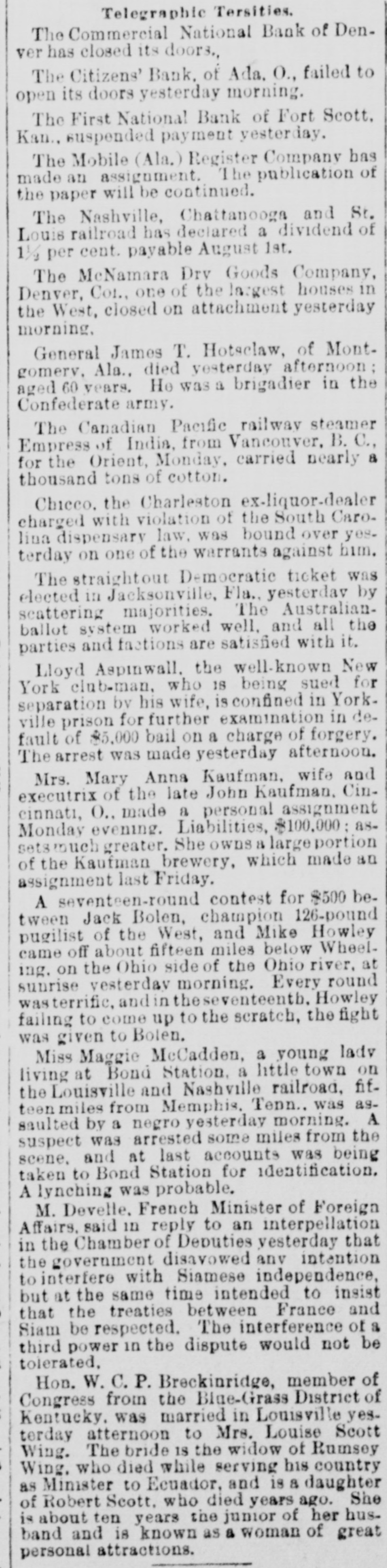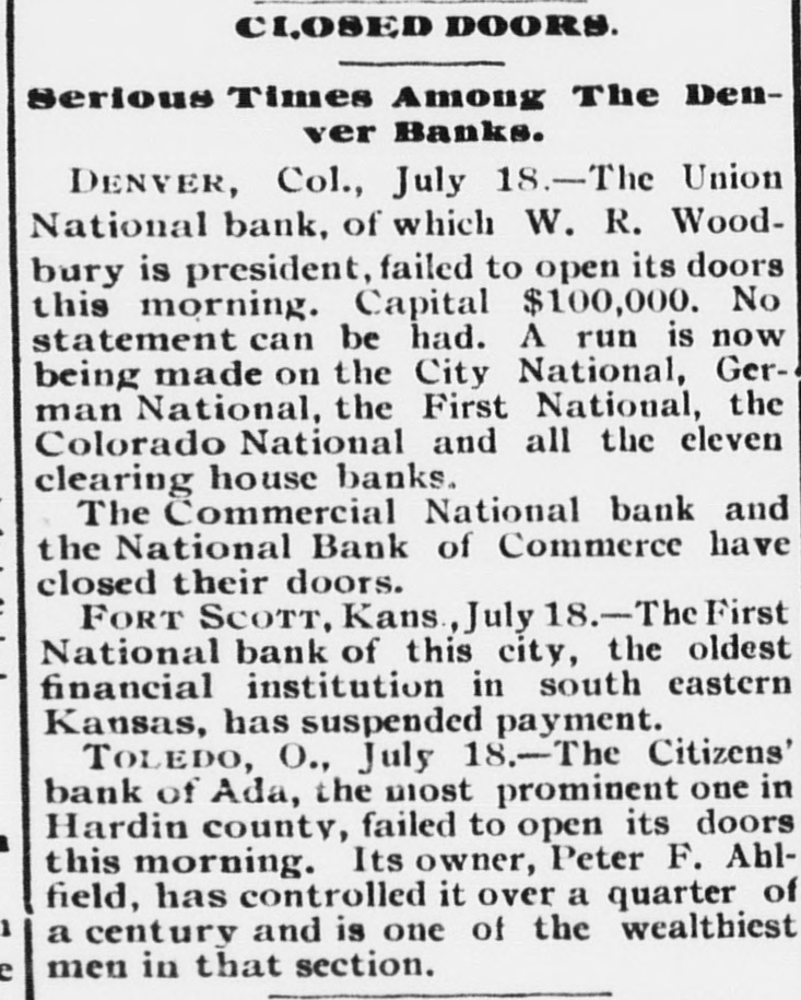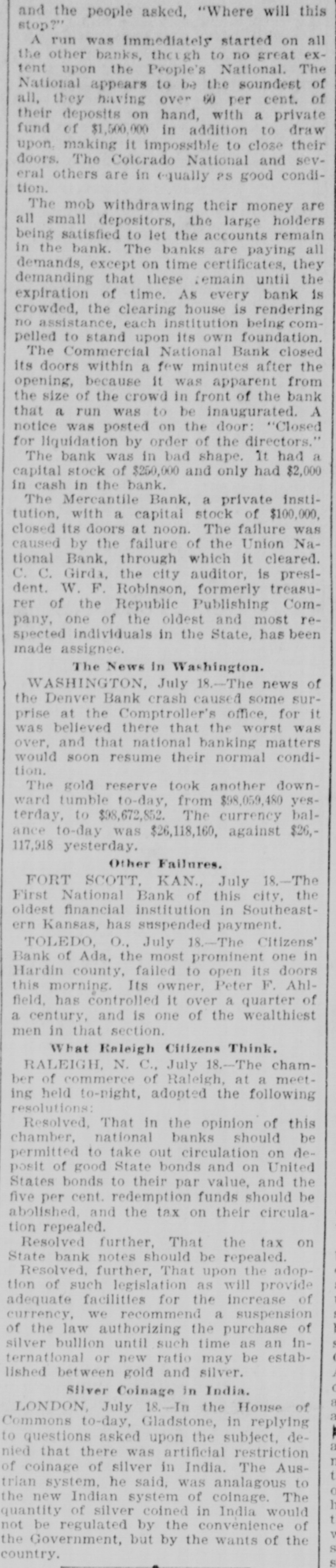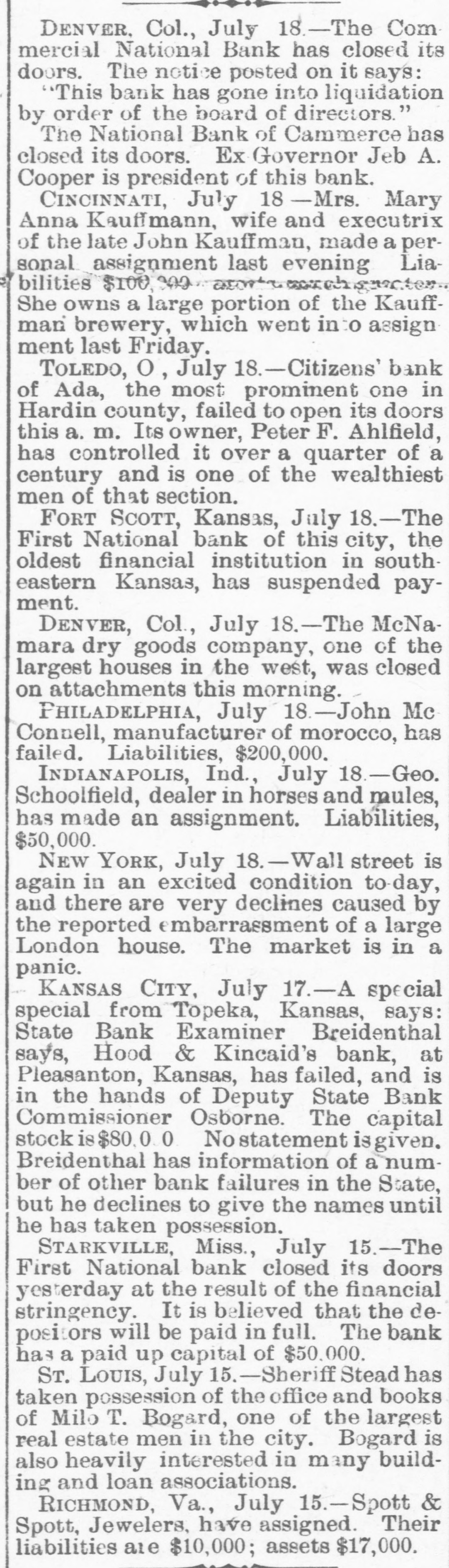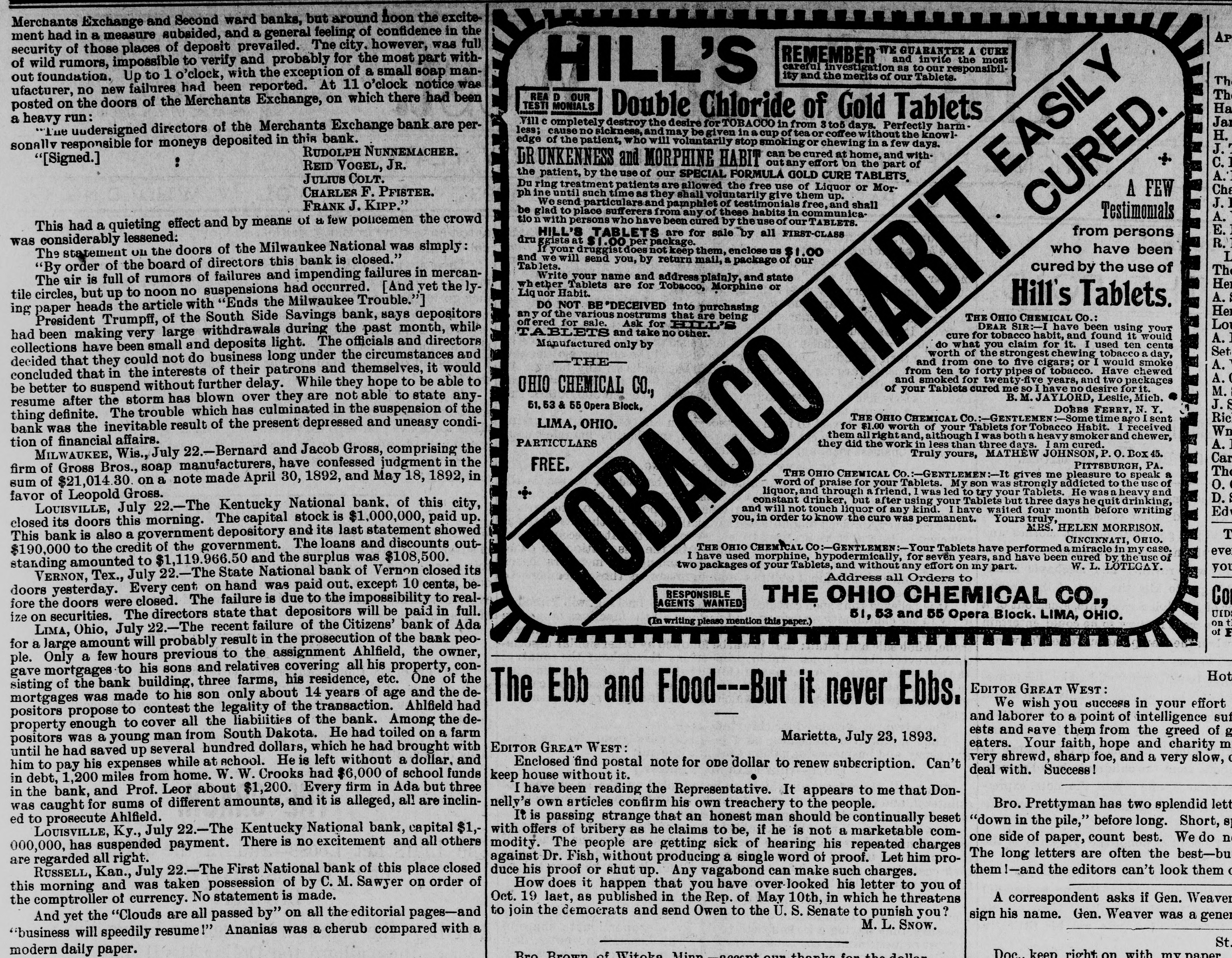 Merchants Exchange and Second ward banks, but around hoon the excitement had in a measure subsided, and a general feeling of confidence in the AP WE GUARANTEE A security of those places of deposit prevailed. Tne city. however, was full and invite the REMEMBER of wild rumors, impossible to verify and probably for the most part withcareful investigation as to our responsibility and the merits of our Tablets. out foundation. Up to 1 o'clock, with the exception of a small soap manHILL'S The ufacturer, no new failures had been reported. At 11 o'clock notice was Th D OUR TESTI MONIALS posted on the doors of the Merchants Exchange, on which there had been Ha Double Chloride of Gold Tablets a heavy run: Jai Vill c ompletely destroy the desire *TOBACCO in from 3 to5 days. Perfectly harm"Tue undersigned directors of the Merchants Exchange bank are perless; cause no sickness, and may be given in a cup of tea or coffee without the knowlH. edge of the patient, who will voluntarily stop smoking or chewing in a few days. sonallv responsible for moneys deposited in this bank. J. RUDOLPH NUNNEMACHER. can be cured at home, and withDR UNKENNESS and ... "[Signed.] MORPHINE HABIT C. out any effort on the part of REID VOGEL, JR. A.' the patient, by the use of our SPECIAL FORMULA GOLD CURE TABLETS. JULIUS COLT. Du ring treatment patients are allowed the free use of Liquor or MorCha CHARLES F. PFISTER. ph ine until such time as they shall voluntarily give them up. J. We send particulars and pamphlet of testimonials free, and shall FRANK J. KIPP." be glad to place sufferers from any of these habits in communicaTestimonials EASILY. FEW A. tio n with persons who have been cured by the use of our TABLETS. This had a quieting effect and by means of a few policemen the crowd E. from persons HILL'S TABLETS are for sale by all FIRST-CLASS dru was considerably lessened: ggists at 1.00 per package. R. who have been If your druggist does not keep them, enclose us 1.00 The statement on the doors of the Milwaukee National was simply: L and we will send you, by return mail, a package of our Tablets. cured by the use of "By order of the board of directors this bank is closed." The Write your name and address plainly, and state The air is full of rumors of failures and impending failures in mercanHe wh ether Tablets are for Tobacco, Morphine or Liq uor Habit. tile circles, but up to noon no suspensions had occurred. [And ,vet the lyA. Hill's Tablets. DO NOT BE "DECEIVED into purchasing ing paper heads the article with "Ends the Milwaukee Trouble."] Her THE OHIO CHEMICAL Co.: any of the various nostrums that are being President Trumpff, of the South Side Savings bank, says depositors Lou off ered for sale. Ask for HILL'S DEAR SIR:-I have been using your ABLETS and take no other. cure for tobacco habit, and found it would had been making very large withdrawals during the past month, while A. do what you claim for it. I used ten cents Manufactured only by collections have been small and deposits light. The officials and directors Set worth of the strongest chewing tobacco a day, THE and from one to five cigars; or I would smoke decided that they could not do business long under the circumstances and A. from ten to forty pipes of tobacco. Have chewed concluded that in the interests of their patrons and themselves, it would A. ( and smoked for twenty-five years, and two packages of your Tablets cured me so I have no desire for it. be better to suspend without further delay. While they hope to be able to M. OHIO CHEMICAL CO., B. M. JAYLORD, Leslie, Mich. resume after the storm has blown over they are not able to state anyJ. S 51, 53 & 55 Opera Block, DOBBS FERRY, N. Y. thing definite. The trouble which has culminated in the suspension of the Ric THE OHIO CHEMICAL Co.:-GENTLEMEN:-Some time ago I sent LIMA, OHIO. for $1.00 worth of your Tablets for Tobacco Habit. I received bank was the inevitable result of the present depressed and uneasy condiWn them all right and, although I was both a heavy smoker and chewer, tion of financial affairs. PARTICULARS they did the work in less than three days. I am cured. A. Truly yours, MATHEW JOHNSON, P. O. Box 45. MILWAUKEE, Wis., July 22.-Bernard and Jacob Gross, comprising the Car PITTSBURGH, PA. FREE. firm of Gross Bros., soap manufacturers, have confessed judgment in the The THE OHIO CHEMICAL Co.:-GENTLEMEN:-It gives me pleasure to speak a sum of $21,014.30. on a note made April 30, 1892, and May 18, 1892, in word of praise for your Tablets. My son was strongly addicted to the use of O. liquor, and through a friend, I was led to try your Tablets. He was a heavy and .: favor of Leopold Gross. D. constant drinker, but after using your Tablets but three days he quit drinking, LOUISVILLE, July 22.-The Kentucky National bank. of this city, and will not touch liquor of any kind. I have waited four month before writing Ed Yours truly, you, in order to know the cure was permanent. closed its doors this morning. The capital stock is $1,000,000, paid up. MRS. HELEN MORRISON. T This bank is also a government depository and its last statement showed CINCINNATI, OHIO. THE OHIO CHEMICAL CO:-GENTLEMEN:-Your Tablets have performed a miracle in my case. eve $190,000 to the credit of the government. The loans and discounts outI have used morphine, hypodermically, for seven years, and have been cured by the use of standing amounted to $1,119.966.50 and the surplus was $108,500. W. L. LOTEGAY. two packages of your Tablets, and without any effort on my part. you Address all Orders to VERNON, Tex., July 22.-The State National bank of Vernon closed its doors yesterday. Every cent on hand was paid out. except 10 cents, beRESPONSIBLE Co AGENTS WANTED fore the doors were closed. The failure is due to the impossibility to realTHE OHIO CHEMICAL CO., UID 51, 53 and 55 Opera Block. LIMA, OHIO. ize on securities. The directors state that depositors will be paid in full. on (In writing please mention this paper.) Lima, Ohio, 