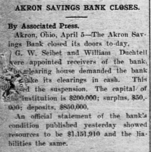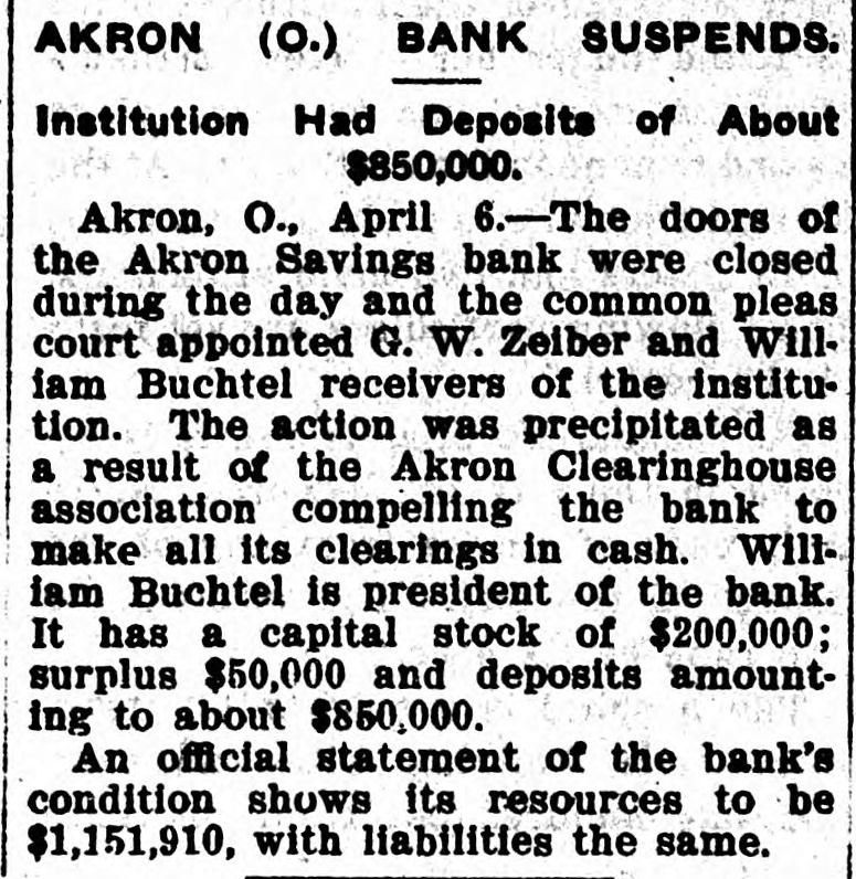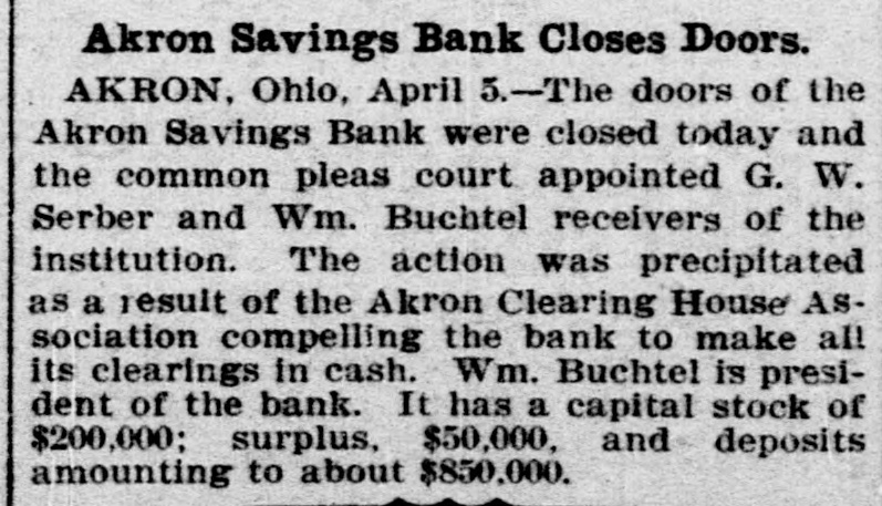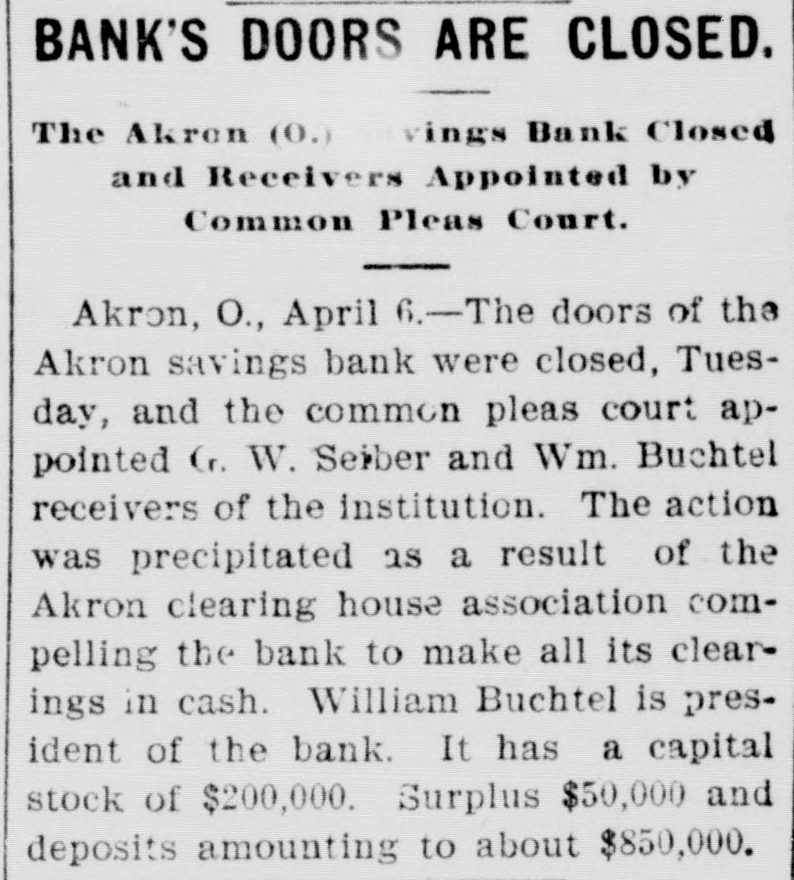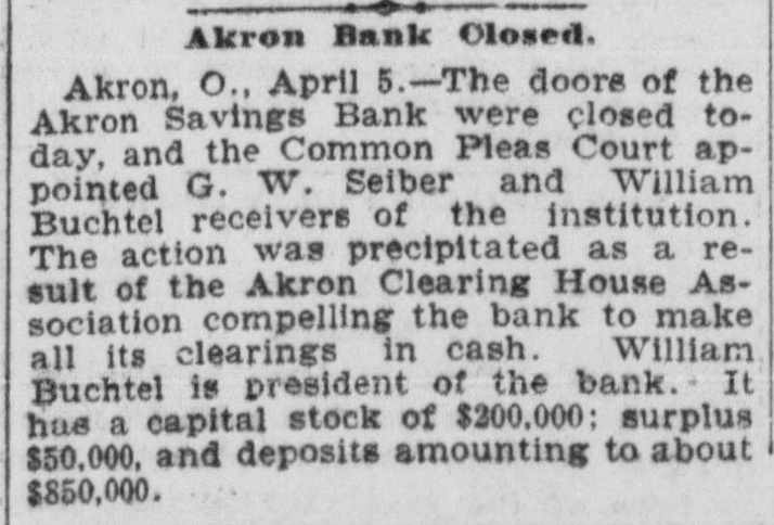 Akron Bank Olosed. Akron, O., April 5.-The doors of the Akron Savings Bank were closed today, and the Common Pleas Court appointed G. W. Seiber and William Buchtel receivers of the institution. The action was precipitated as a result of the Akron Clearing House Association compelling the bank to make all its clearings in cash. William Buchtel is president of the bank. It has a capital stock of $200,000; surplus $50,000, and deposits amounting to about $850,000.