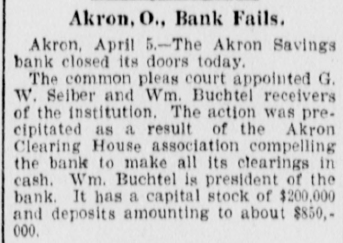Akron, O., Bank Fails. Akron, April 5.-The Akron Savings bank closed its doors today. The common pleas court appointed G. W. Seiber and Wm. Buchtel receivers of the institution. The action was precipitated as a result of the Akron Clearing House association compelling the bank to make all its clearings in cash. Wm. Buchtel is president of the bank. It has a capital stock of $200,000 and deposits amounting to about $850,000.