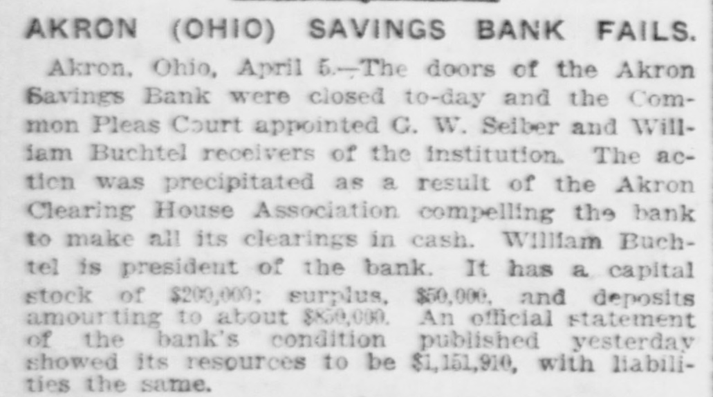 AKRON (OHIO) SAVINGS BANK FAILS. Akron. Ohio, April 6-The doors of the Akron Savings Bank were closed to-day and the Common Pleas Court appointed C. W. Seiber and William Buchtel receivers of the institution. The action was precipitated as a result of the Akron Clearing House Association compelling the bank to make all its clearings in cash. William Buchtel is president of the bank. It has a capital stock of $200,000; surplus, $50,000, and deposits amounting to about $850,000. An official statement of the bank's condition published yesterday showed its resources to be $1,151,910, with liabilities the same.