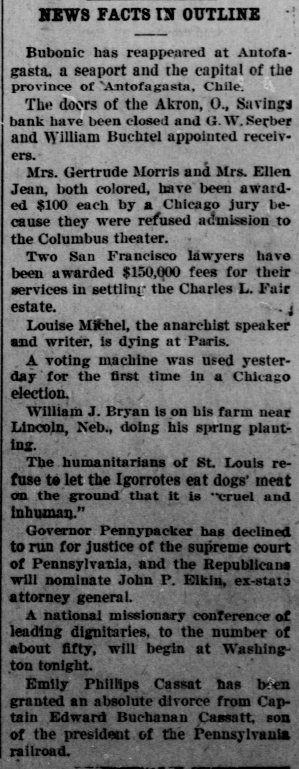 NEWS FACTS IN OUTLINE -Bubonic has reappeared at Antofagasta, a seaport and the capital of the province of Antofagasta, Chile. The doors of the Akron, O., Savings bank have been closed and G. W. Serber and William Buchtel appointed receivers. Mrs. Gertrude Morris and Mrs. Ellen Jean, both colored, have been awarded $100 each by a Chicago jury because they were refused admission to the Columbus theater. Two San Francisco lawyers have been awarded $150,000 fees for their services in settling the Charles L. Fair estate. Louise Michel, the anarchist speaker and writer, is dying at Paris. A voting machine was used yesterday for the first time in a Chicago election. William J. Bryan is on his farm near Lincoln, Neb., doing his spring planting. The humanitarians of St. Louis refuse to let the Igorrotes eat dogs' meat on the ground that it is "cruel and inhuman." Governor Pennypacker has declined to run for justice of the supreme court of Pennsylvania, and the Republicans will nominate John P. Elkin, ex-state attorney general. A national missionary conference of leading dignitaries, to the number of about fifty, will begin at Washing ton tonight. Emily Phillips Cassat has been granted an absolute divorce from Captain Edward Buchanan Cassatt, son of the president of the Pennsylvania railroad.