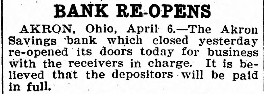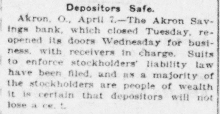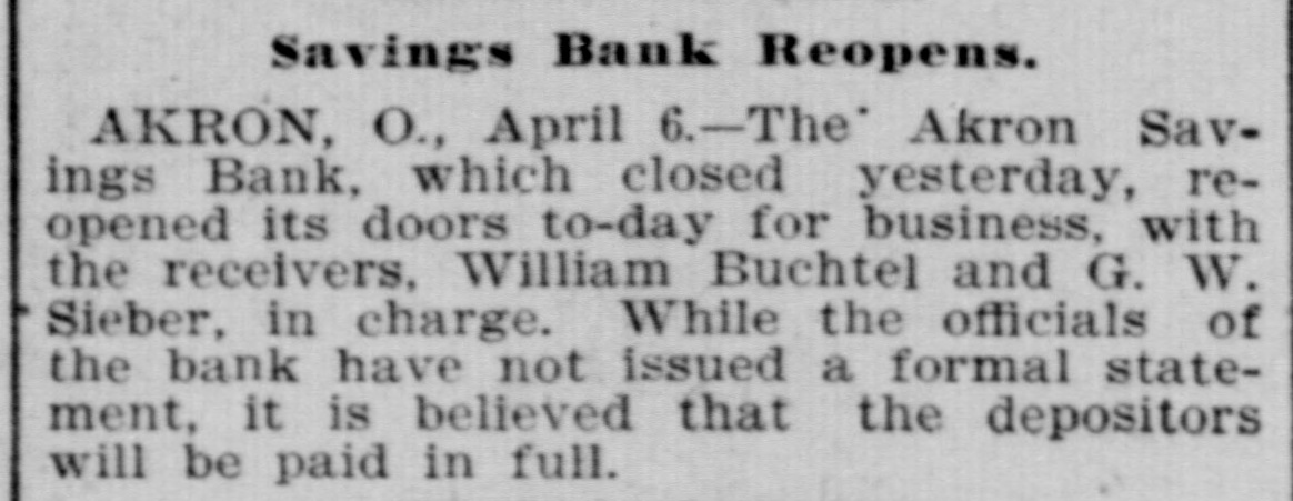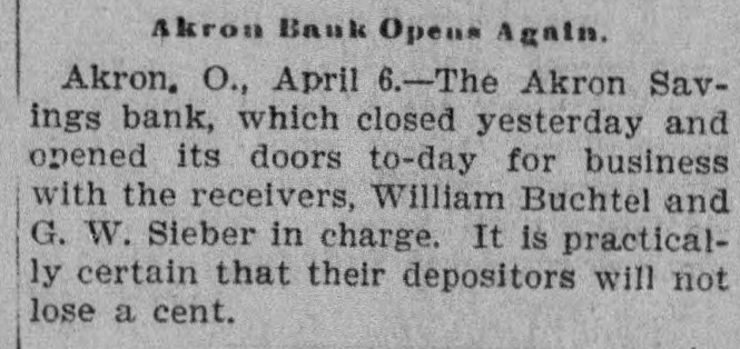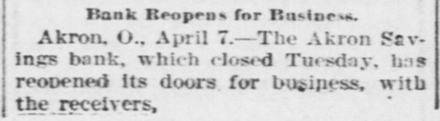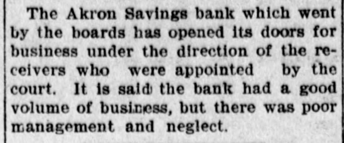 The Akron Savings bank which went by the boards has opened its doors for business under the direction of the receivers who were appointed by the court. It is said the bank had a good volume of business, but there was poor management and neglect.
