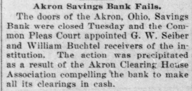Akron Savings Bank Fails. The doors of the Akron, Ohio, Savings Bank were closed Tuesday and the Common Pleas Court appointed G. W. Seiber and William Buchtel receivers of the institution. The action was precipitated as a result of the Akron Clearing House Association compelling the bank to make all its clearings in cash.