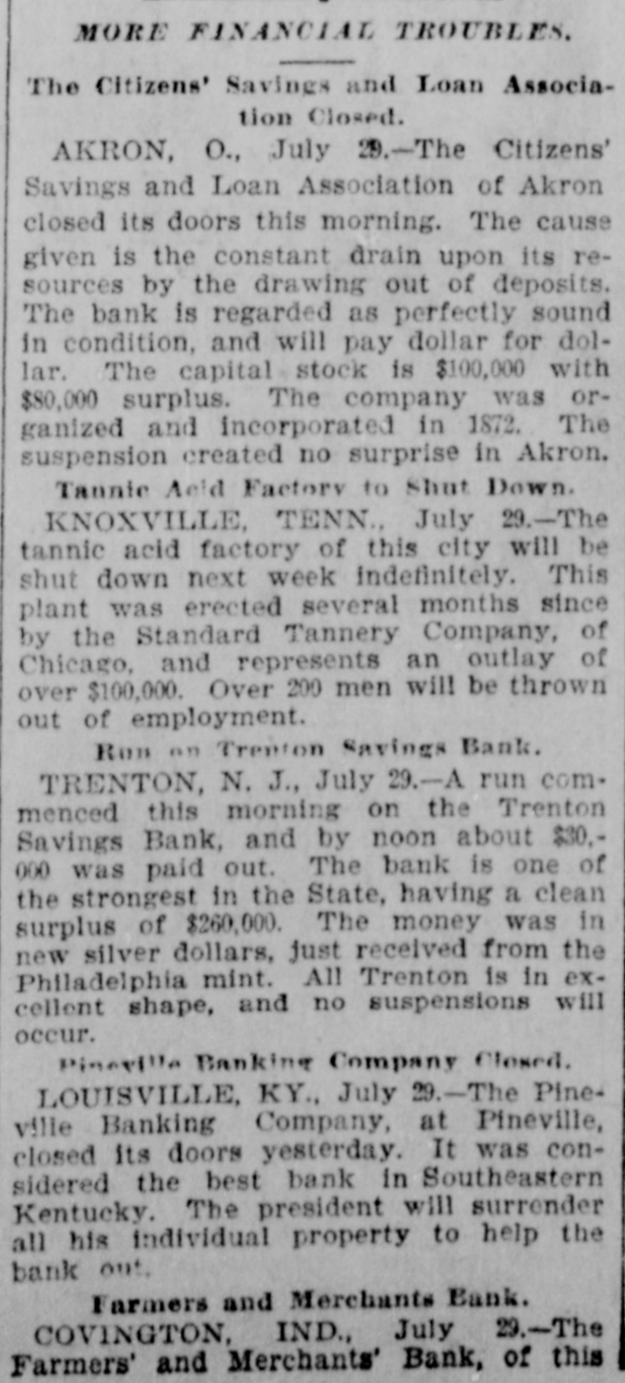 MORE FINANCIAL TROUBLES. The Citizens' Savings and Loan Association Closed. AKRON, O., July 29.-The Citizens' Savings and Loan Association of Akron closed its doors this morning. The cause given is the constant drain upon its resources by the drawing out of deposits. The bank is regarded as perfectly sound in condition, and will pay dollar for dollar. The capital stock is $100,000 with $80,000 surplus. The company was organized and incorporated in 1872. The suspension created no surprise in Akron. Tannie Aeld Factory to Shut Down. KNOXVILLE, TENN.. July 29.-The tannic acid factory of this city will be shut down next week indefinitely. This plant was erected several months since by the Standard Tannery Company, of Chicago, and represents an outlay of over $100,000. Over 200 men will be thrown out of employment. Run on Trenton Savings Bank. TRENTON, N. J., July 29.-A run com. menced this morning on the Trenton Savings Bank, and by noon about $30.000 was paid out. The bank is one of the strongest in the State, having a clean surplus of $260,000. The money was in new silver dollars, just received from the Philadelphia mint. All Trenton is in excellent shape, and no suspensions will occur. Pineville Banking Company Closed. LOUISVILLE, KY., July 29.-The Pineville Banking Company, at Pineville, closed its doors yesterday. It was considered the best bank in Southeastern Kentucky. The president will surrender all his individual property to help the bank out. Farmers and Merchants Bank. COVINGTON, IND., July 29.-The Farmers' and Merchants' Bank, of this