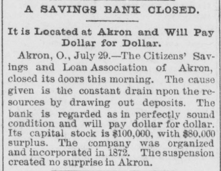A SAVINGS BANK CLOSED. It is Located at Akron and Will Pay Dollar for Dollar. Akron, O., July 29.-The - Citizens' Savings and Loan Association of Akron, closed its doors this morning. The cause given is the constant drain npon the resources by drawing out deposits. The bank is regarded as in perfectly sound condition and will pay dollar for dollar. Its capital stock is $100,000, with $80,000 surplus. The company was organized and incorporated in 1872. The suspension created no surprise in Akron.
