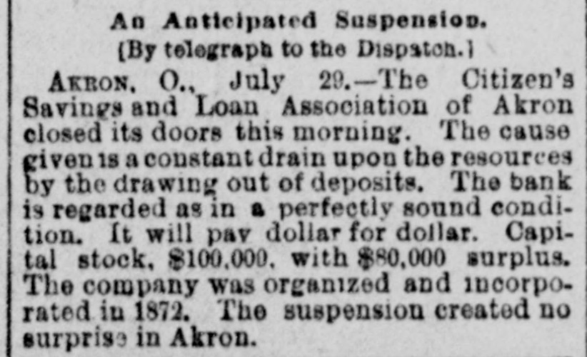 An Anticipated Suspension. (By telegraph to the Dispatch.] AKRON. O., July 29.-The Citizen's Savings and Loan Association of Akron closed its doors this morning. The cause given 18 a constant drain upon the resources by the drawing out of deposits. The bank is regarded as in a perfectly sound condition. It will pay dollar for dollar. Capital stock, $100,000. with $80,000 surplus. The company was organized and incorporated in 1872. The suspension created no surprise in Akron.