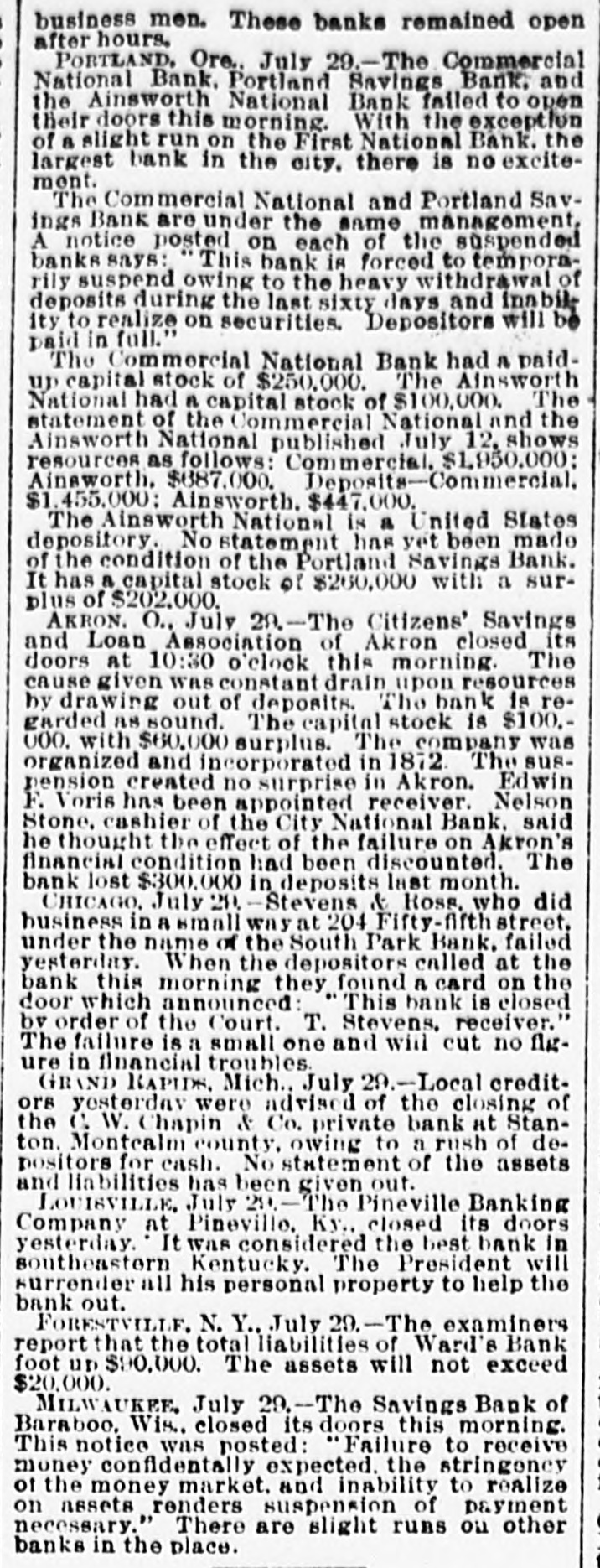 business men. These banks remained open after hours. PORTLAND, Ore., July 29.-The Commercial National Bank, Portland Savings Bank, and the Ainsworth National Bank failed to open their doors this morning. With the exception of a slight run on the First National Bank. the largest bank in the city, there is no excitement. The Commercial National and Portland Savings Bank are under the same management, A notice posted on each of the suspended banks says: This bank is forced to temporarily suspend owing to the heavy withdrawal of deposits during the last sixty days and inabile ity to realize on securities. Depositors will be paid in full." The Commercial National Bank had a paidup capital stock of $250,000. The Ainsworth National had n capital stock of $100,000. The statement of the Commercial National and the Ainsworth National published July 12, shows resources as follows: Commercial. $1,950.000; Ainsworth, $687,000. Deposits-Commercial, $1,455,000; Ainsworth. $447,000. The Ainsworth National is a United States depository. No statement has yet been made of the condition of the Portland Savings Bank. It has a capital stock of $260,000 with a surplus of $202,000. AKRON. O., July 29.-The Citizens' Savings and Loan Association of Akron closed its doors at 10:30 o'clock this morning. The cause given WAS constant drain upon resources by drawing out of deposits. The bank is regarded as sound. The capital stock is $100.000. with $60,000 surplus. The company was organized and incorporated in 1872. The suspension created no surprise in Akron. Edwin F. Voris has been appointed receiver. Nelson Stone. cashier of the City National Bank. said he thought the effect of the failure on Akron's financial condition had been discounted. The bank lost $300.000 in deposits last month. CHICAGO. July 20.-Stevens & Ross, who did business in a small way at 204 Fifty-fifth street. under the name of the South Park Bank. failed yesterday. When the depositors called at the bank this morning they found a card on the door which announced: This bank is closed bv order of the Court. T. Stevens. receiver." The failure is a small one and will cut no flgure in financial troubles. GRAND RAPIDS. Mich., July 29.-Local creditors yesterday were advised of the closing of the C. W. Chapin & Co. private bank at Stanton. Montealm county. owing to a rush of depositors for cash. No statement of the assets and liabilities has been given out. LOUISVILLE, July 29.-The Pineville Banking Company at Pineville, Ky., closed its doors yesterday. It was considered the best bank in southeastern Kentucky. The President will surrender all his personal property to help the bank out. FORESTVILLE, N. Y., July 29.-The examiners report that the total liabilities of Ward's Bank foot up $90,000. The assets will not exceed $20,000. MILWAUKEE, July 29.-The Savings Bank of Baraboo. Wis.. closed its doors this morning. This notice was posted: 'Failure to receive money confidentally expected. the stringency of the money market. and inability to realize on assets renders suspension of payment necessary." There are slight runs Oil other banks in the place.