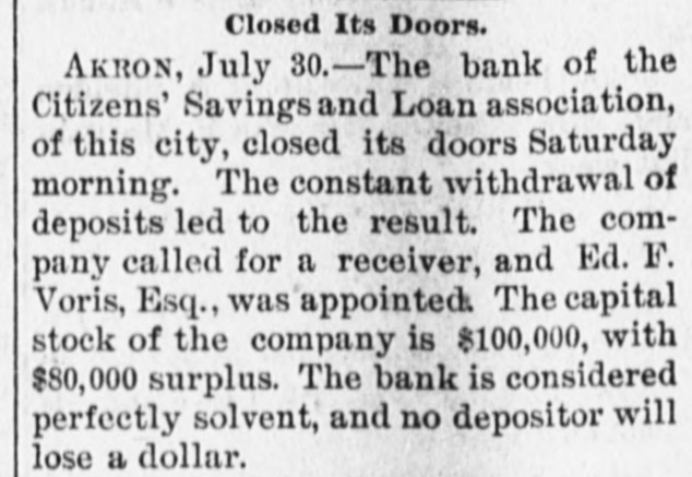 Closed Its Doors. AKRON, July 30.-The bank of the Citizens' Savingsand Loan association, of this city, closed its doors Saturday morning. The constant withdrawal of deposits led to the result. The company called for a receiver, and Ed. F. Voris, Esq., was appointed. The capital stock of the company is $100,000, with $80,000 surplus. The bank is considered perfectly solvent, and no depositor will lose a dollar.