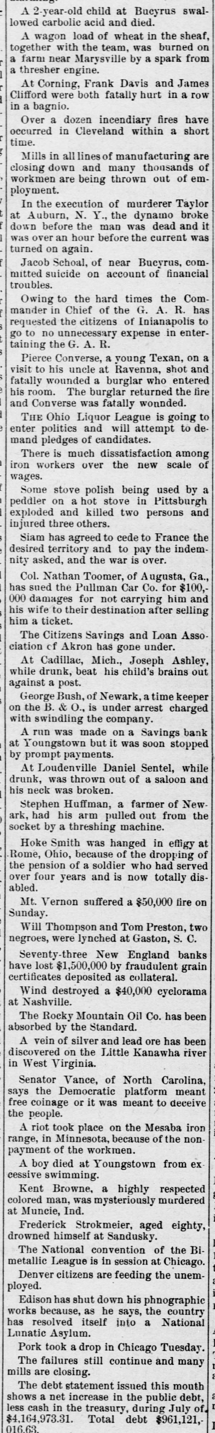 carbone acid and lowed died. A wagon load of wheat in the sheaf, together with the team, was burned on a farm near Marysville by a spark from a thresher engine. At Corning, Frank Davis and James Clifford were both fatally hurt in a row in a bagnio. Over a dozen incendiary fires have occurred in Cleveland within a short time. Mills in all lines of manufacturing are closing down and many thousands of workmen are being thrown out of employment. In the execution of murderer Taylor at Auburn, N. Y., the dynamo broke down before the man was dead and it was over an hour before the current was turned on again. Jacob Schoal, of near Bucyrus, committed suicide on account of financial troubles. Owing to the hard times the Commander in Chief of the G. A. R. has requested the citizens of Inianapolis to go to no unnecessary expense in entertaining the G. A. R. Pierce Converse, a young Texan, on a visit to his uncle at Ravenna, shot and fatally wounded a burglar who entered his room. The burglar returned the fire and Converse was fatally wonnded. THE Ohio Liquor League is going to enter politics and will attempt to demand pledges of candidates. There is much dissatisfaction among iron workers over the new scale of wages. Some stove polish being used by a peddler on a hot stove in Pittsburgh exploded and killed two persons and injured three others. Siam has agreed to cede to France the desired territory and to pay the indemnity asked, and the war is over. Col. Nathan Toomer, of Augusta, Ga., has sued the Pullman Car Co. for $100,000 damages for not carrying him and his wife to their destination after selling him a ticket. The Citizens Savings and Loan Association of Akron has gone under. At Cadillac, Mich., Joseph Ashley, while drunk, beat his child's brains out against a post. George Bush, of Newark, a time keeper on the B. & O., is under arrest charged with swindling the company. A run was made on a Savings bank at Youngstown but it was soon stopped by prompt payments. At Loudenville Daniel Sentel, while drunk, was thrown out of a saloon and his neck was broken. Stephen Huffman, a farmer of Newark, had his arm pulled out from the socket by a threshing machine. Hoke Smith was hanged in effigy at Rome, Ohio, because of the dropping of the pension of a soldier who had served over four years and is now totally disabled. Mt. Vernon suffered a $50,000 fire on Sunday. Will Thompson and Tom Preston, two negroes, were lynched at Gaston, S. C. Seventy-three New England banks have lost $1,500,000 by fraudulent grain certificates deposited as collateral. Wind destroyed a $40,000 cyclorama at Nashville. The Rocky Mountain Oil Co. has been absorbed by the Standard. A vein of silver and lead ore has been discovered on the Little Kanawha river in West Virginia. Senator Vance, of North Carolina, says the Democratic platform meant free coinage or it was meant to deceive the people. A riot took place on the Mesaba iron range, in Minnesota, because of the nonpayment of the workmen. A boy died at Youngstown from ex cessive swimming. Kent Browne, a highly respected colored man, was mysteriously murdered at Muncie, Ind. Frederick Strokmeier, aged eighty, drowned himself at Sandusky. The National convention of the Bimetallic League is in session at Chicago. Denver citizens are feeding the unemployed. Edison has shut down his phnographic works because, as he says, the country has resolved itself into a National Lunatic Asylum. Pork took a drop in Chicago Tuesday. The failures still continue and many mills are closing. a The debt statement issued this mouth 82 shows a net increase in the public debt, I less cash in the treasury, during July of $4,164,973.31. Total debt $961,121, 016.63