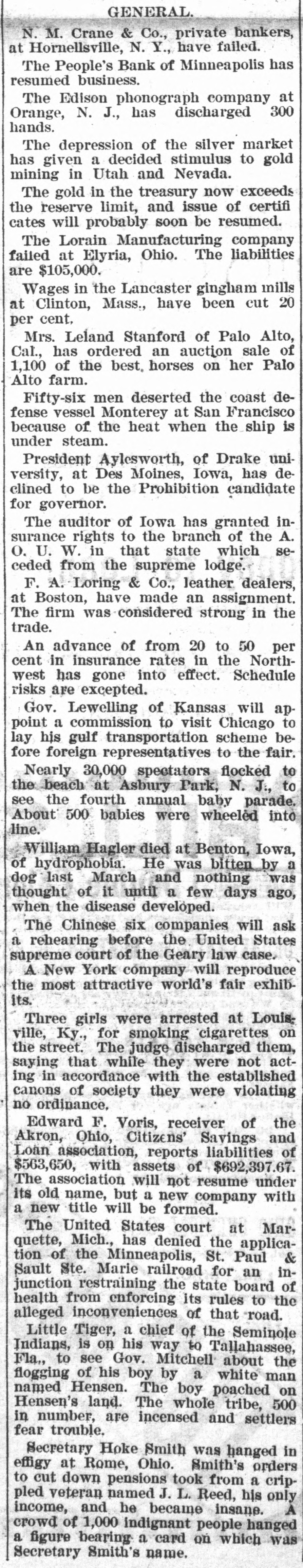 GENERAL N. M. Crane & Co., private bankers, at Hornellsville, N. Y., have failed. The People's Bank of Minneapolis has resumed business. The Edison phonograph company at Orange, N. J., has discharged 300 hands. The depression of the silver market has given a decided stimulus to gold mining in Utah and Nevada. The gold in the treasury now exceeds the reserve limit, and issue of certifi cates will probably soon be resumed. The Lorain Manufacturing company failed at Elyria, Ohio. The liabilities are $105,000. Wages in the Lancaster gingham mills at Clinton, Mass., have been cut 20 per cent. Mrs. Leland Stanford of Palo Alto, Cal., has ordered an auction sale of 1,100 of the best, horses on her Palo Alto farm. Fifty-six men deserted the coast defense vessel Monterey at San Francisco because of the heat when the ship is under steam. President Aylesworth, of Drake university, at Des Moines, Iowa, has declined to be the Prohibition candidate for governor. The auditor of Iowa has granted insurance rights to the branch of the A. O. U. W. in that state which seceded from the supreme lodge. F. A. Loring & Co., leather dealers, at Boston, have made an assignment. The firm was considered strong in the trade. An advance of from 20 to 50 per cent in insurance rates in the Northwest has gone into effect. Schedule risks are excepted. Gov. Lewelling of Kansas will appoint a commission to visit Chicago to lay his gulf transportation scheme before foreign representatives to the fair. Nearly 30,000 spectators flocked to the beach at Asbury Park, N. J., to see the fourth annual baby parade. About 500 babies were wheeled into line. William Hagler died at Benton, Iowa, of hydrophobia. He was bitten by a dog last March and nothing was thought of it until a few days ago, when the disease developed. The Chinese six companies will ask a rehearing before the United States supreme court of the Geary law case. A New York company will reproduce the most attractive world's fair exhibits. Three girls were arrested at Louis: ville, Ky., for smoking cigarettes on the street. The judge discharged them, saying that while they were not acting in accordance with the established canons of society they were violating no ordinance, Edward F. Voris, receiver of the Akron, Ohio, Citizens' Savings and Loan association, reports liabilities of $563,650, with assets of $692,397.67 The association will not resume under its old name, but a new company with a new title will be formed. The United States court at Marquette, Mich., has denied the application of the Minneapolis, St. Paul & Sault Ste. Marie railroad for an injunction restraining the state board of health from enforcing its rules to the alleged inconveniences of that road. Little Tiger, a chief of the Seminole Indians, is on his way to Tallahassee, Fla., to see Gov. Mitchell about the flogging of his boy by a white man named Hensen. The boy poached on Hensen's land. The whole tribe, 500 in number, are incensed and settlers fear trouble. Secretary Hoke Smith was hanged in effigy at Rome, Ohio. Smith's orders to cut down pensions took from a crippled veteran named J. L. Reed, his only income, and he became insane. A crowd of 1,000 indignant people hanged a figure bearing a card on which was Secretary Smith's name.