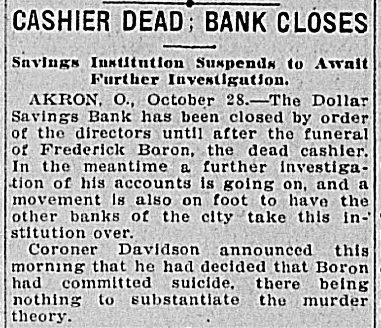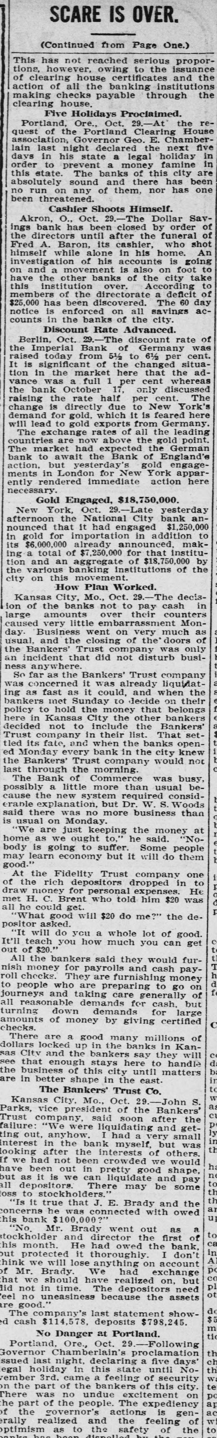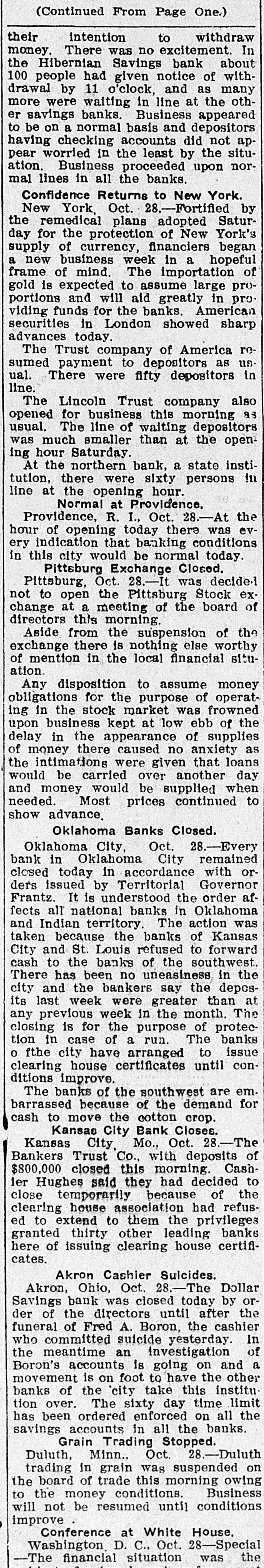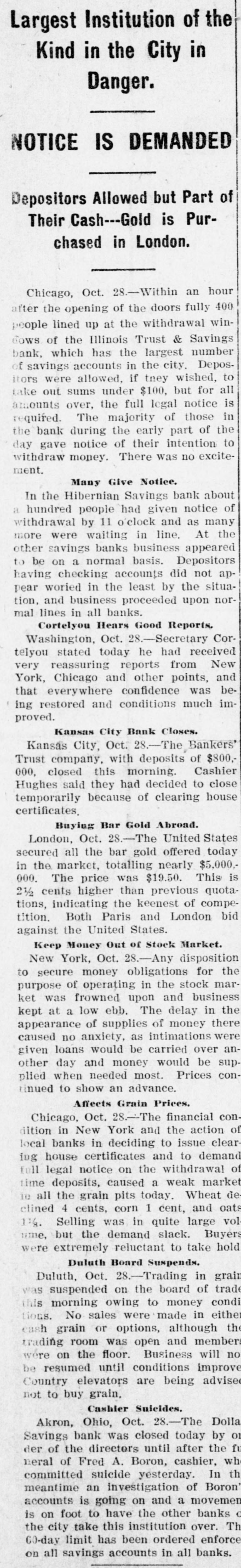 Largest Institution of the Kind in the City in Danger. NOTICE IS DEMANDED Depositors Allowed but Part of Their Cash Gold is Purchased in London. Chicago, Oct. 28.-Within an hour after the opening of the doors fully 400 people lined up at the withdrawal windows of the Illinois Trust & Savings bank, which has the largest number of savings accounts in the city. Depositors were allowed. if tney wished, to take out sums under $100, but for all amounts over, the full legal notice is required. The majority of those in the bank during the early part of the day gave notice of their intention to withdraw money. There was no excitement. Many Give Notice. In the Hibernian Savings bank about a hundred people had given notice of withdrawal by 11 o'clock and as many more were waiting in line. At the other savings banks business appeared to be on a normal basis. Depositors having checking accounts did not appear woried in the least by the situation, and business proceeded upon normal lines in all banks. Cortelyou Hears Good Reports. Washington, Oct. 28.-Secretary Corstated very telyou reassuring today reports he had from received New York, Chicago and other points, and that everywhere confidence was being restored and conditions much improved. Kansas City Bank Closes. Kansas City, Oct. 28.-The Bankers' Trust company, with deposits of $800,000, closed Hughes said they this had morning. decided to Cashier close temporarily because of clearing house certificates, Buying Bar Gold Abroad. London, Oct. 28.-The United States secured all the bar gold offered today in the market, totalling nearly $5,000.000. The price was $19.50. This is 2 1/2 cents higher than previous quotations, indicating the keenest of competition. Both Paris and London bid against the United States. Keep Money Out of Stock Market. New York, Oct. 28.-Any disposition to secure money obligations for the purpose of operating in the stock market was frowned upon and business kept at a low ebb. The delay in the appearance of supplies of money there caused no anxiety, as intimations were given loans would be carried over another day and money would be supplied when needed most. Prices continued to show an advance. Affects Grain Prices. Chicago, Oct. 28.-The financial condition in New York and the action of local banks in deciding to issue clearing house certificates and to demand full legal notice on the withdrawal of time deposits, caused a weak market 10 all the grain pits today. Wheat de clined 4 cents, corn 1 cent, and oats 11/6. Selling was in quite large vol time, but the demand slack. Buyers were extremely reluctant to take hold Duluth Board Suspends. Duluth, Oct. 28.-Trading in grain was suspended on the board of trade this morning owing to money condi tions. No sales were made in either cash grain or options, although the trading room was open and members were on the floor. Business will no be resumed until conditions improve Country elevators are being advised not to buy grain. Cashier Suicides. Akron, Ohio, Oct. 28.-The Dolla Savings bank was closed today by 01 der of the directors until after the fu neral of Fred A. Boron, cashier, who committed suicide yesterday. In th meantime an investigation of Boron' accounts is going on and a movemen is on foot to have the other banks C the city take this institution over. Th 60-day limit has been ordered enforce on all savings accounts in all banks.