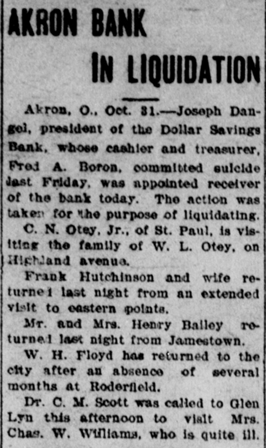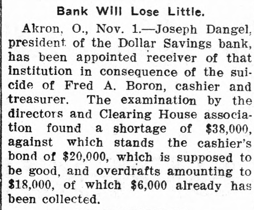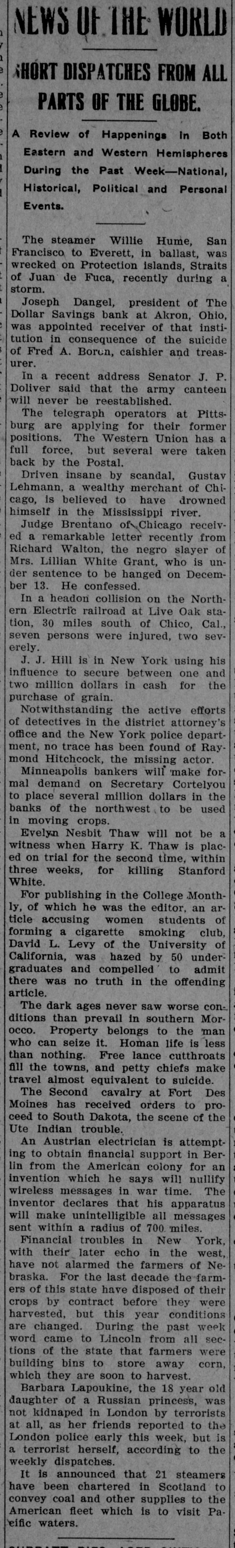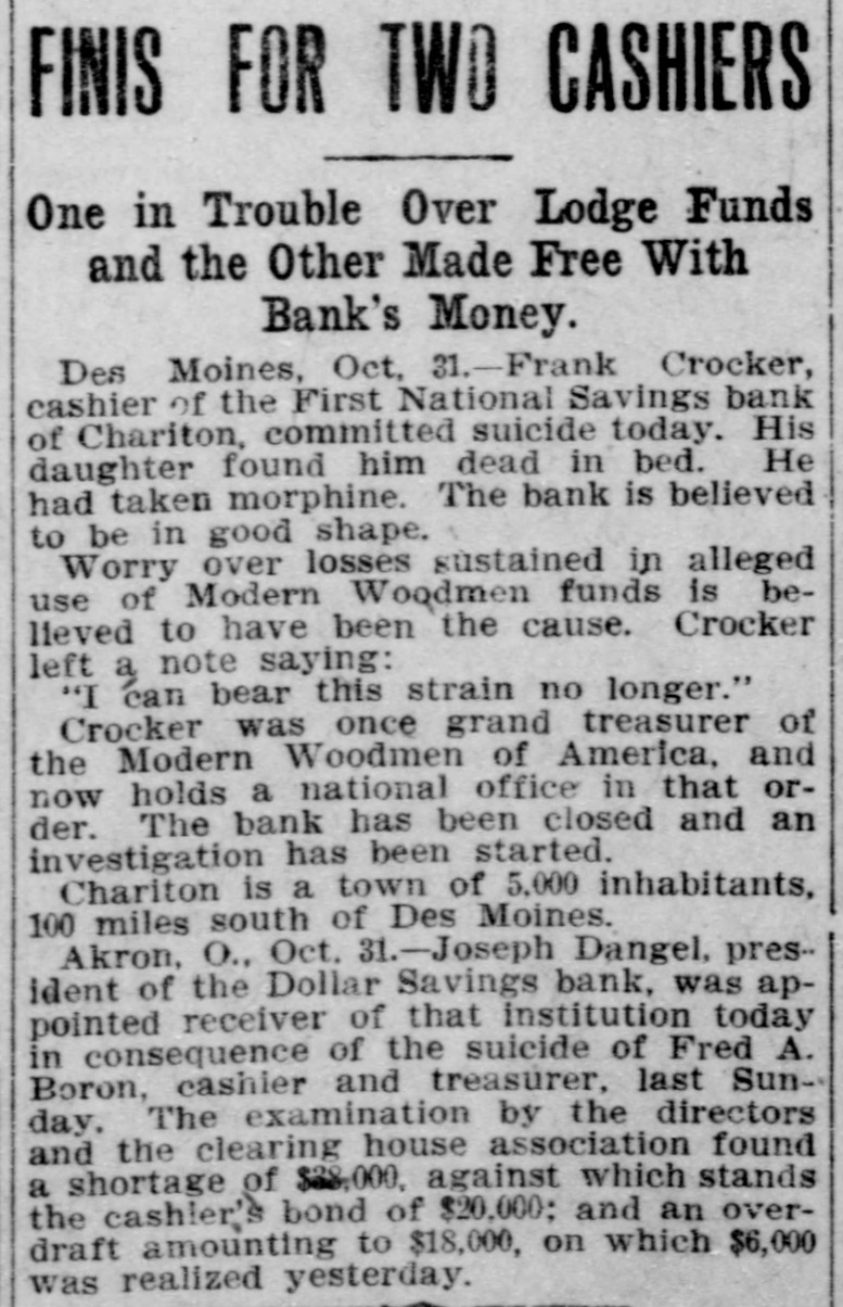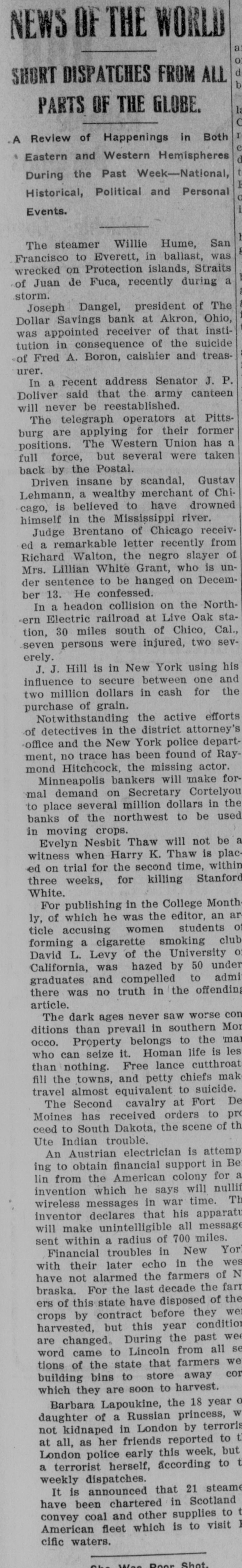 Largest Institution of the Kind in the City in Danger. NOTICE IS DEMANDED Depositors Allowed but Part of Their Cash Gold is Purchased in London. Chicago, Oct. 28.-Within an hour after the opening of the doors fully 400 people lined up at the withdrawal windows of the Illinois Trust & Savings bank, which has the largest number of savings accounts in the city. Depositors were allowed. if tney wished, to take out sums under $100, but for all amounts over, the full legal notice is required. The majority of those in the bank during the early part of the day gave notice of their intention to withdraw money. There was no excitement. Many Give Notice. In the Hibernian Savings bank about a hundred people had given notice of withdrawal by 11 o'clock and as many more were waiting in line. At the other savings banks business appeared to be on a normal basis. Depositors having checking accounts did not appear woried in the least by the situation, and business proceeded upon normal lines in all banks. Cortelyou Hears Good Reports. Washington, Oct. 28.-Secretary Corstated very telyou reassuring today reports he had from received New York, Chicago and other points, and that everywhere confidence was being restored and conditions much improved. Kansas City Bank Closes. Kansas City, Oct. 28.-The Bankers' Trust company, with deposits of $800,000, closed Hughes said they this had morning. decided to Cashier close temporarily because of clearing house certificates, Buying Bar Gold Abroad. London, Oct. 28.-The United States secured all the bar gold offered today in the market, totalling nearly $5,000.000. The price was $19.50. This is 2 1/2 cents higher than previous quotations, indicating the keenest of competition. Both Paris and London bid against the United States. Keep Money Out of Stock Market. New York, Oct. 28.-Any disposition to secure money obligations for the purpose of operating in the stock market was frowned upon and business kept at a low ebb. The delay in the appearance of supplies of money there caused no anxiety, as intimations were given loans would be carried over another day and money would be supplied when needed most. Prices continued to show an advance. Affects Grain Prices. Chicago, Oct. 28.-The financial condition in New York and the action of local banks in deciding to issue clearing house certificates and to demand full legal notice on the withdrawal of time deposits, caused a weak market 10 all the grain pits today. Wheat de clined 4 cents, corn 1 cent, and oats 11/6. Selling was in quite large vol time, but the demand slack. Buyers were extremely reluctant to take hold Duluth Board Suspends. Duluth, Oct. 28.-Trading in grain was suspended on the board of trade this morning owing to money condi tions. No sales were made in either cash grain or options, although the trading room was open and members were on the floor. Business will no be resumed until conditions improve Country elevators are being advised not to buy grain. Cashier Suicides. Akron, Ohio, Oct. 28.-The Dolla Savings bank was closed today by 01 der of the directors until after the fu neral of Fred A. Boron, cashier, who committed suicide yesterday. In th meantime an investigation of Boron' accounts is going on and a movemen is on foot to have the other banks C the city take this institution over. Th 60-day limit has been ordered enforce on all savings accounts in all banks.