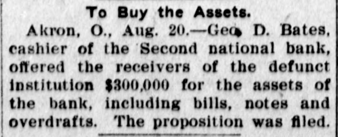 To Buy the Assets. Akron, O., Aug. 20.-Geo D. Bates, cashier of the Second national bank, offered the receivers of the defunct institution $300,000 for the assets of the bank, including bills, notes and overdrafts. The proposition was filed.