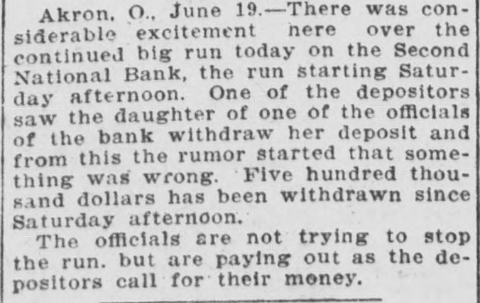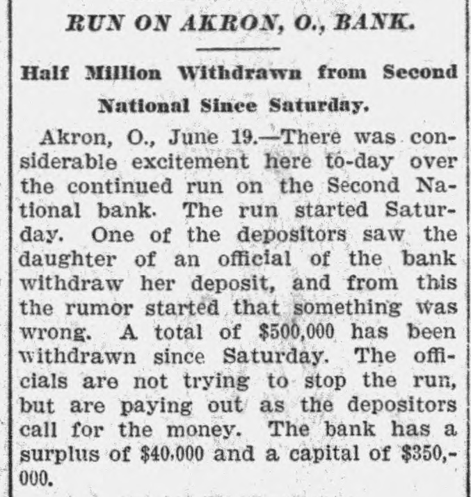 RUN ON AKRON, O., BANK. Half Million Withdrawn from Second National Since Saturday. Akron, O., June 19.-There was considerable excitement here to-day over the continued run on the Second National bank. The run started Saturday. One of the depositors saw the daughter of an official of the bank withdraw her deposit, and from this the rumor started that something was wrong. A total of $500,000 has been withdrawn since Saturday. The officials are not trying to stop the run, but are paying out as the depositors call for the money. The bank has a surplus of $40,000 and a capital of $350,000.