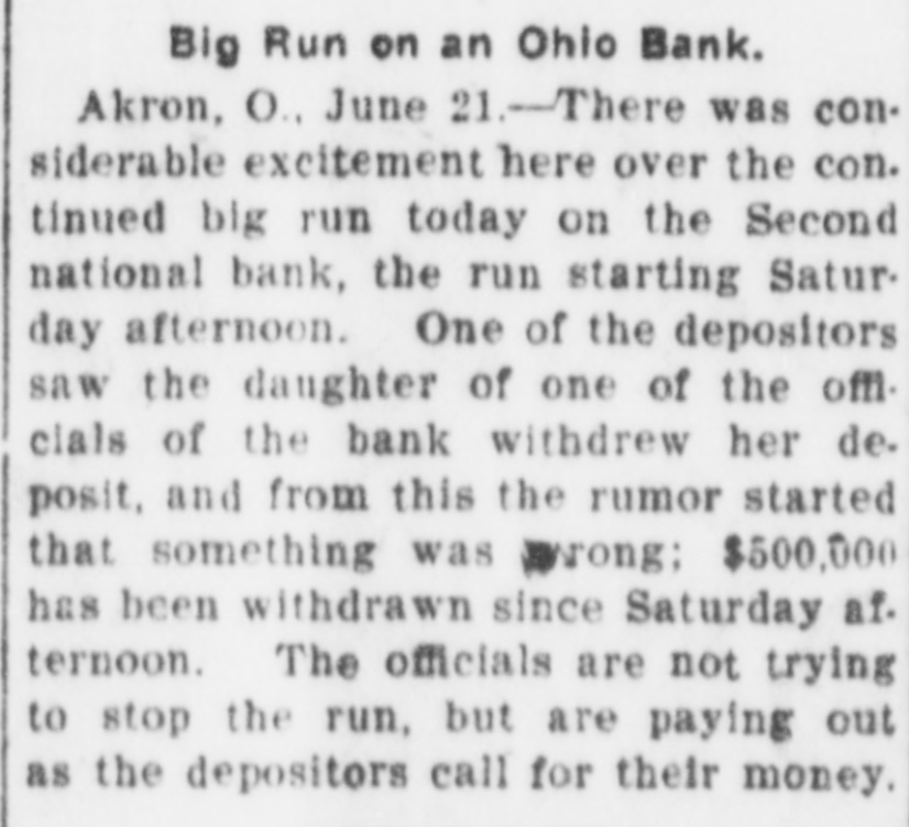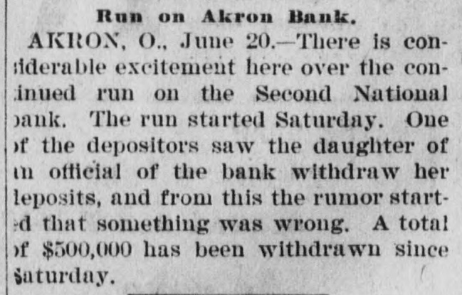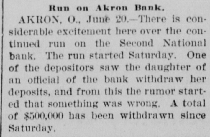 Run on Akron Bank. AKRON, O., June 20.-There is considerable excitement here over the continued run on the Second National bank. The run started Saturday. One of the depositors saw the daughter of an official of the bank withdraw her deposits, and from this the rumor started that something was wrong. A total of $500,000 has been withdrawn since Saturday.