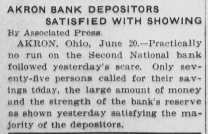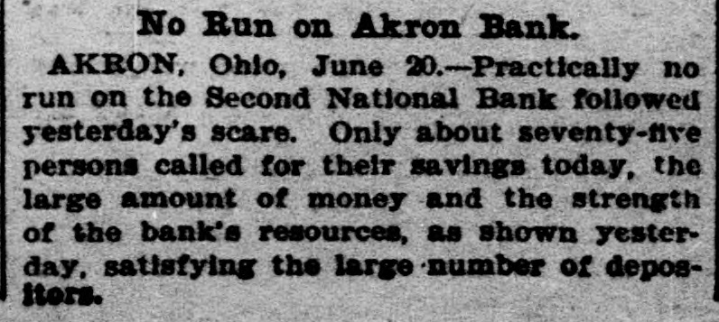 No Run on Akron Bank. AKRON, Ohio, June 20.-Practically no run on the Second National Bank followed yesterday's scare. Only about seventy-five persons called for their savings today, the large amount of money and the strength of the bank's resources, as shown yesterday, satisfying the large number of depositors.