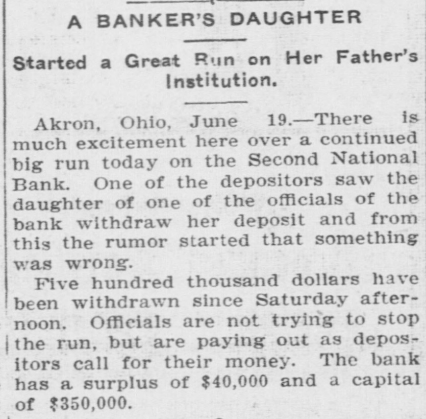 A BANKER'S DAUGHTER Started a Great Run on Her Father's Institution. is Akron, Ohio, June 19.-There much excitement here over a continued big run today on the Second National Bank. One of the depositors saw the daughter of one of the officials of the bank withdraw her deposit and from this the rumor started that something was wrong. Five hundred thousand dollars have been withdrawn since Saturday afternoon. Officials are not trying to stop the run, but are paying out as depositors call for their money. The bank has a surplus of $40,000 and a capital of $350,000.