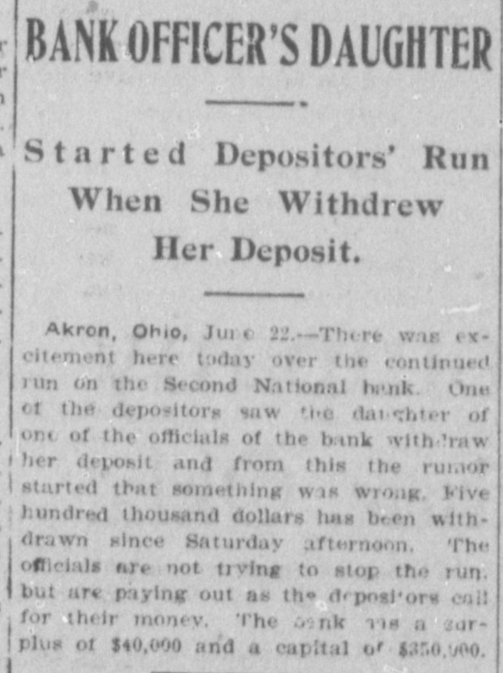 BANK OFFICER'S DAUGHTER Started Depositors' Run When She Withdrew Her Deposit. Akron, Ohio, June 22.-There was excitement here today over the continued run on the Second National bank. One of the depositors saw the daughter of one of the officials of the bank withdraw her deposit and from this the rumor started that something was wrong, Five hundred thousand dollars has been withdrawn since Saturday afternoon. The officials are not trying to stop the run. but are paying out as the depositors call for their money. The bank 118 a surplus of $40,000 and a capital or $350,000.