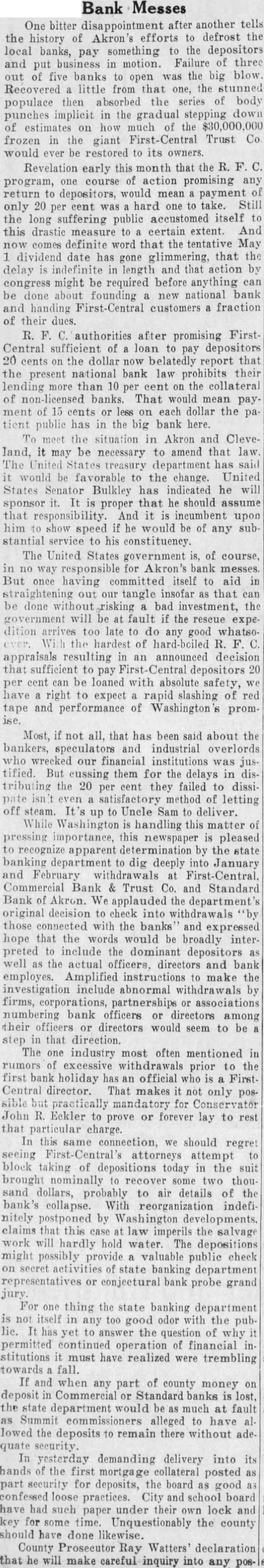 WITHDRAWALS CUT BY 20 OHIO BANKS Institutions With $815,000,000 in Deposits Await Legislative Action. By the Associated Press. COLUMBUS, Ohio, February 27.Twenty Ohio Banks, all but two in Cleveland, Akron, Dayton and Ycungstown, today placed restrictions on heavy withdrawals in anticipation of emergency banking laws Gov. George White promised to offer to the current Legislature. On the basis of December 31, 1932, statements. the institutions had more than $815,000,000 in deposits and more than $1,025,000,000 in rescurces. Both in Akron and Cleveland, the banks announced future deposits would be set aside and not be placed under the restrictions. All Dayton banks closed for a three-day holiday. One Refuses to Participate. All eight of Cleveland's banks opened as usual, but six of them limited withto 5 per and a seventh, a Trust, drawals deposits, placed temporarily restriction the of Guardian cent 1 per of cent. The eighth, the National City Bank, declined to participate and announced it would conduct business on a normal basis. The six which limited withdrawals cent of deposits were the Bank, National Cleveland to American 5 per Savings Bank, Central Trust United Co., Lorain Street Savings & Trust Co., Society for Savings and Union Trust Co. While they placed no specified limit, the Union National and the Mahoning National Banks at Ycungstown announced they would restrict large and unusual withdrawals. Sufficient funds will be paid cut on demand, they said, to prevent inconvenience to customers. One Per Cent Per Month. Akron's five banks - First Central Trust Co., Firestone Park Trust & Savings Bank, the Commercial Bank & Trust Co., the Dime Savings Bank Co., and the Standard Savings Bank-restricted savings deposit withdrawals. to 1 per cent per month. "Abnormal" checking account withdrawals will not be honored under a complicated system. The four banks of Dayton-the Winters National, the Third National, the Merchants National and the Morris Plan-declared a three-day holiday under a declaration by the city commission and mayor. The Clinton Savings Bank Co., near Akron, announced it would follow the lead of Akron banks. The First American Trust Co. of Lima, Ohio, limited withdrawals to 2 per cent of deposits. There was no announced action to interrupt normal banking elsewhere in the State. Gov. White declined to divulge the nature of the proposed legislation. Manager G. A. Stephenson of the Cleveland Clearing House Association, however, said the suggested laws would "enable the superintendent of banks, with the approval of the Governor and attorney general, to stop or limit withdrawals from Ohio banks."