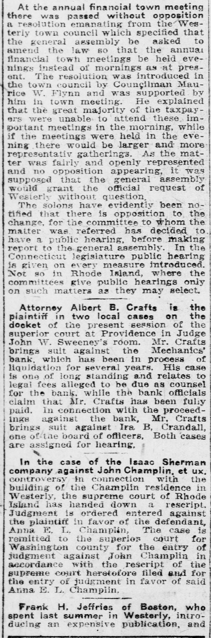 At the annual financial town meeting there was passed without opposition a resolution emanating from the Westerly town council which specified that the general assembly be asked to amend the law so that the annual financial town meetings be held evenings instead of mornings as at present. The resolution was introduced in the town council by Councilman Maurice W. Flynn and was supported by him in town meeting. He explained that the great majority of the taxpayers were unable to attend these important meetings in the morning, while if the meetings were held in the evening there would be larger and more representative gatherings. As the matter was fairly and openly represented and no opposition appearing, it was supposed that the general assembly would grant the official request of Westerly without question, The solons have evidently been notified that there is opposition to the change, for the committee to whom the matter was referred has decided to have a public hearing, before making report to the general assembly. In the Connecticut legislature public hearing is given on every measure introduced. Not go in Rhode Island, where the committees give public hearings only on such matters as they may select. Attorney Albert B. Crafts is the plaintiff in two local cases on the docket of the present session of the superior court at Providence in Judge John W. Sweeney's room. Mr. Crafts brings suit against the Mechanics' bank. which has been in process of liquidation for several years. His case is one of long standing and relates to legal fees alleged to be due as counsel for the bank. while the bank officials claim that Mr. Crafts has been fully paid. In connection with the proceedings against the bank, Mr. Crafts brings suit against Ira B, Crandall, one of the board of officers, Both cases are assigned for hearing, In the case of the Isaac Sherman company against John Champlin. et ux. controversy in connection with the building of the Champlin residence in Westerly, the supreme court of Rhode Island has handed down a rescript. Judgment is ordered entered against the plaintiff in favor of the defendant, Anna E. L. Champlin, The case is remitted to the superior court for Washington county for the entry of judgment against John Champlin in accordance with the rescript of the supreme court heretofore filed and for the entry of judgment in favor of said Arna E. L. Champiin, Frank H. Jeffries of Beston, who spent last summer in Westerly, introducing an expensive publication, and