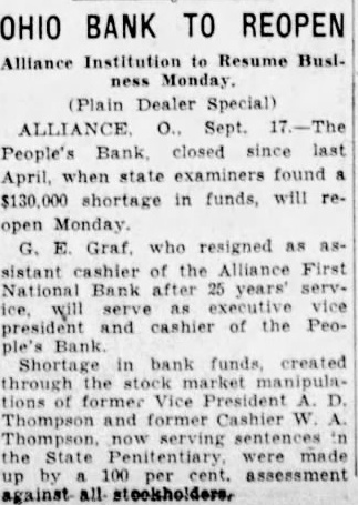 OHIO BANK TO REOPEN Alliance Institution to Resume Monday. (Plain Dealer Special) O., Sept. closed since last People's April, when state examiners found $130,000 shortage in funds, will reopen Monday. E. Graf. resigned as sistant cashier the Alliance First National Bank after years' serve executive and cashier of the Peopresident Shortage in bank created through the tions former Thompson former Cashier Thompson. sentences the State were by 100 assessment against
