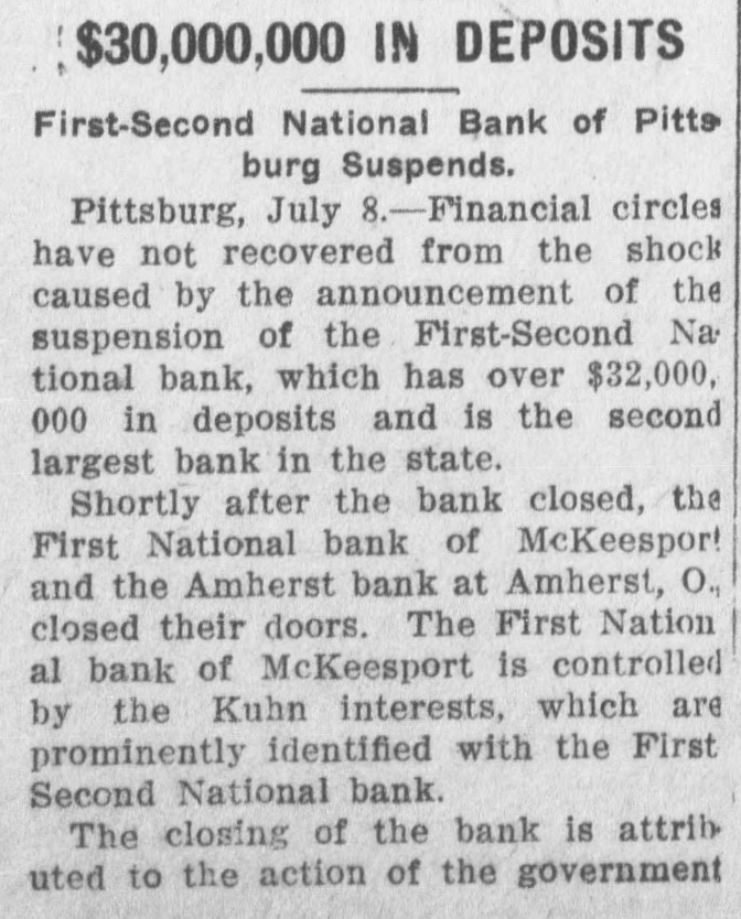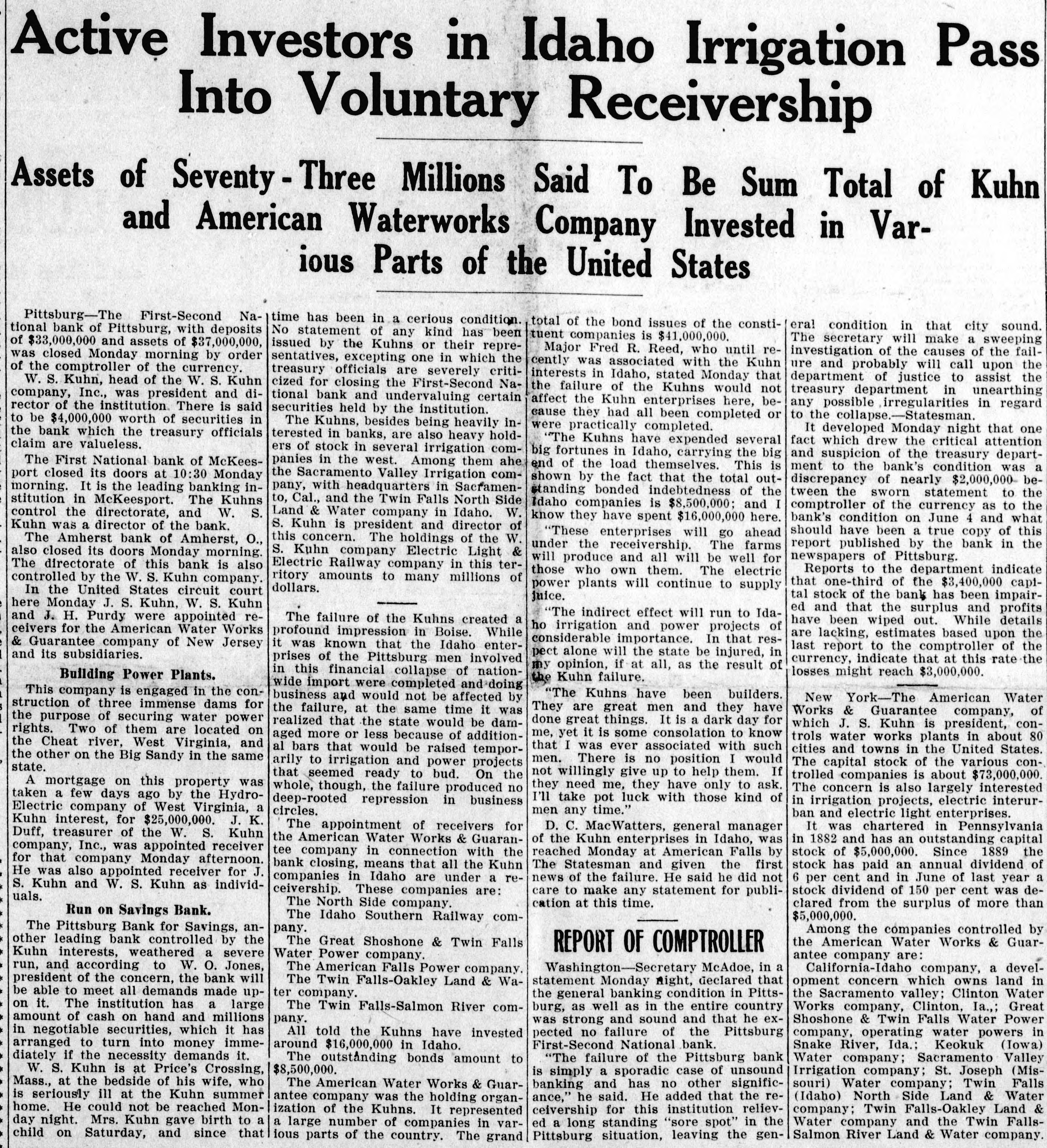 Active Investors in Idaho Irrigation Pass Into Voluntary Receivership Assets of Millions Said To Seventy Be Sum of Total Kuhn and American Waterworks Company Invested in Various Parts of the United States Pittsburg-The First-Second Natime has been in a cerious condition. total of the bond issues of the constieral condition in that city sound. tional bank of Pittsburg, with deposits No statement of any kind has been tuent companies is $41,000,000. The secretary will make a sweeping of $33,000,000 and assets of $37,000,000, issued by the Kuhns or their repreMajor Fred R. Reed, who until reinvestigation of the causes of the failwas closed Monday morning by order sentatives, excepting one in which the cently was associated with the Kuhn ure and probably will call upon the of the comptroller of the currency. treasury officials are severely critiinterests in Idaho, stated Monday that department of justice to assist the W. S. Kuhn, head of the S. Kuhn cized for closing the First-Second Nathe failure of the Kuhns would not treasury department in unearthing company, Inc., was president and ditional bank and undervaluing certain affect the Kuhn enterprises here, beany possible irregularities in regard rector of the institution. There is said securities held by the institution. cause they had all been completed or to the collapse.-Statesman. to be $4,000,000 worth of securities in The Kuhns, besides being heavily inwere practically completed. It developed Monday night that one the bank which the treasury officials terested in banks, are also heavy hold"The Kuhns have expended several fact which drew the critical attention claim are valueless. ers of stock in several irrigation combig fortunes in Idaho, carrying the big and suspicion of the treasury departThe First National bank of McKeespanies in the west. Among them ahe end of the load themselves. This is ment to the bank's condition was a the Sacramento Valley Irrigation comport closed its doors at 10:30 Monday shown by the fact that the total outdiscrepancy of nearly $2,000,000 bepany, with headquarters in Sacramenmorning. It is the leading banking instanding bonded indebtedness of the tween the sworn statement to the to, Cal., and the Twin Falls North Side stitution in McKeesport. The Kuhns Idaho companies is $8,500,000; and I comptroller of the currency as to the Land & Water company in Idaho. W. control the directorate, and W. S. know they have spent $16,000,000 here. bank's condition on June 4 and what S. Kuhn is president and director of Kuhn was a director of the bank. should have been a true copy of this "These enterprises will go ahead this concern. The holdings of the W. The Amherst bank of Amherst, O., report published by the bank in the under the receivership. The farms S. Kuhn company Electric Light & also closed its doors Monday morning. newspapers of Pittsburg. will produce and all will be well for The directorate of this bank is also Electric Railway company in this terReports to the department indicate those who own them. The electric ritory amounts to many millions of controlled by the W. S. Kuhn company. that one-third of the $3,400,000 capipower plants will continue to supply dollars. In the United States circuit court tal stock of the bank has been impairjuice. here Monday J. S. Kuhn, W. S. Kuhn ed and that the surplus and profits "The indirect effect will run to Idaand J. H. Purdy were appointed reThe failure of the Kuhns created a have been wiped out. While details ho irrigation and power projects of ceivers for the American Water Works profound impression in Boise. While are lacking, estimates based upon the considerable importance. In that res& Guarantee company of New Jersey it was known that the Idaho enterlast report to the comptroller of the pect alone will the state be injured, in and its subsidiaries. prises of the Pittsburg men involved currency, indicate that at this my opinion, if at all, as the result of in this financial collapse of nationlosses might reach $3,000,000. Building Power Plants. the Kuhn failure. wide import were completed and doing This company is engaged in the con"The Kuhns have been builders. business and would not be affected by New York-The American Water struction of three immense dams for They are great men and they have the failure, at the same time it was Works & Guarantee company, of the purpose of securing water power done great things. It is a dark day for realized that the state would be damwhich J. S. Kuhn is president, conrights. Two of them are located on me, yet it is some consolation to know aged more or less because of additiontrols water works plants in about 80 the Cheat river, West Virginia, and that I was ever associated with such cities and towns in the United States. al bars that would be raised temporthe other on the Big Sandy in the same men. There is no position I would arily to irrigation and power projects The capital stock of the various constate. not willingly give up to help them. If that seemed ready to bud. On the trolled companies is about $73,000,000. A mortgage on this property was they need me, they have only to ask. whole, though, the failure produced no The concern is also largely interested taken a few days ago by the HydroI'll take pot luck with those kind of deep-rooted repression in business in irrigation projects, electric interurElectric company of West Virginia, a men any time." circles. ban and electric light enterprises. Kuhn interest, for $25,000,000. J. K. The appointment of receivers for D. C. MacWatters, general manager It was chartered in Pennsylvania Duff, treasurer of the W. S. Kuhn the American Water Works & Guaranof the Kuhn enterprises in Idaho, was in 1882 and has an outstanding capital company, Inc., was appointed receiver tee company in connection with the stock of $5,000,000. Since 1889 the reached Monday at American Falls by for that company Monday afternoon. bank closing, means that all the Kuhn stock has paid an annual dividend of 