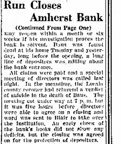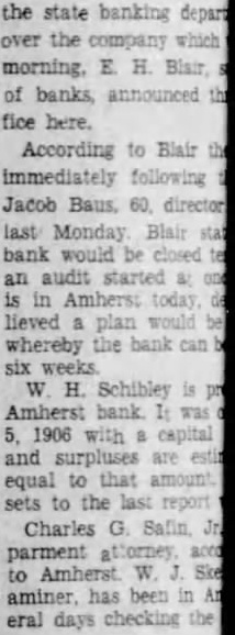 the state banking depart over the company which morning, E. H. Blair of banks, announced fice here. According to Blair immediately following Jacob Baus, 60, director last Monday Blair bank would be closed an audit started & is in Amherst today lieved plan would whereby the bank can six weeks W. H. Schibley is Amherst bank was 5, 1906 with capital and surpluses are equal to that amount sets to the last parment attorney, to Amherst W. Ske aminer. has been in An eral days checking the