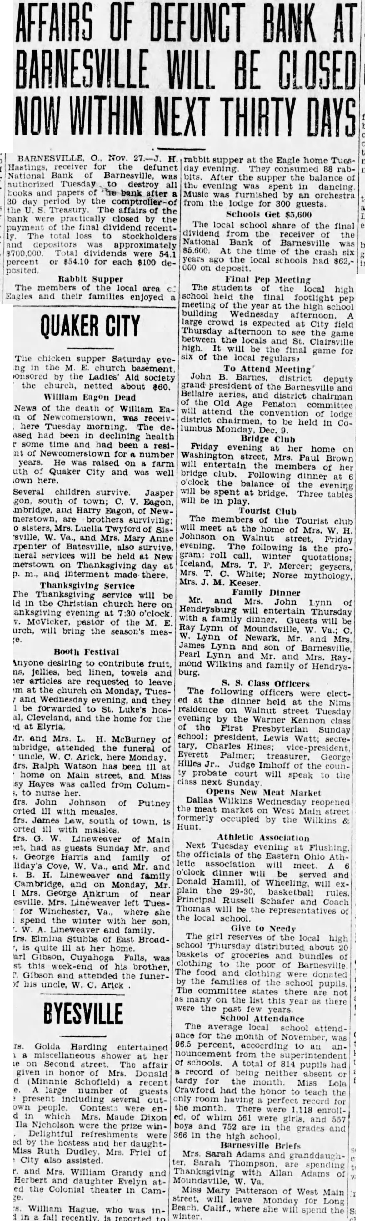 Athletic Association Next Tuesday evening officials the Eastern Ohio association meet. o'clock dinner served and Donald Hamill, the basketball rules. Principal Schafer Thomas the representatives the local school. Give to Needy The girl the local high Thursday about baskets of groceries and bundles clothing poor Barnesville The were donated the school pupils. there many the list this year there were the past School Attendance The average local school attendthe month of November, percent, to an the of schools. pupils record of being tardy Miss Lole Crawford had the honor to teach the only room perfect for the month. There enroll561 were girls, and 557 and 752 are the grades 366 in the Briefs Mrs. Sarah Adams Sarah are Thanksgiving with Allan Adams Va. Mary Patterson of West Main street, Monday for Beach. Calif., where will spend the winter