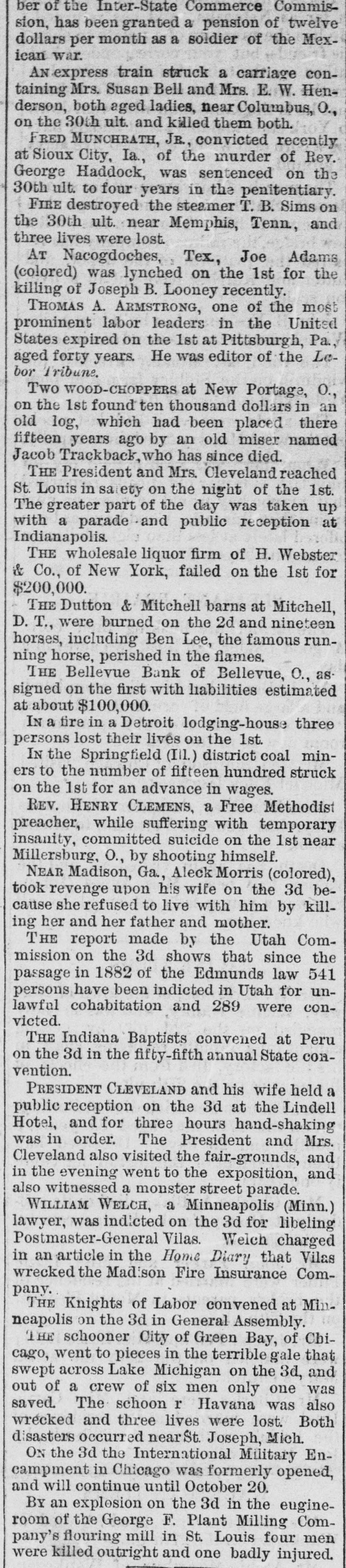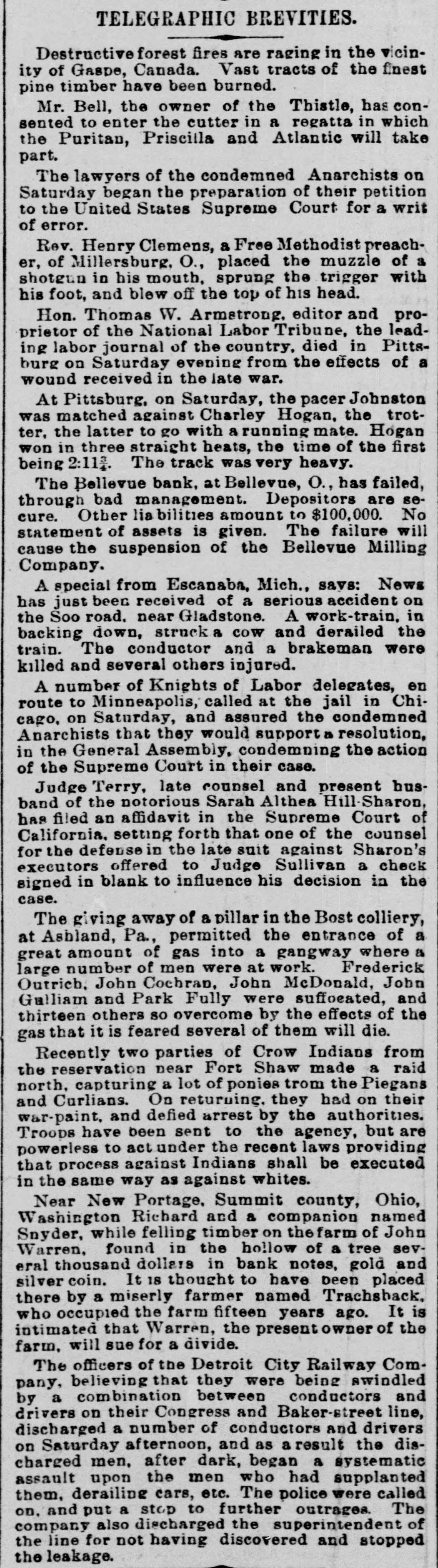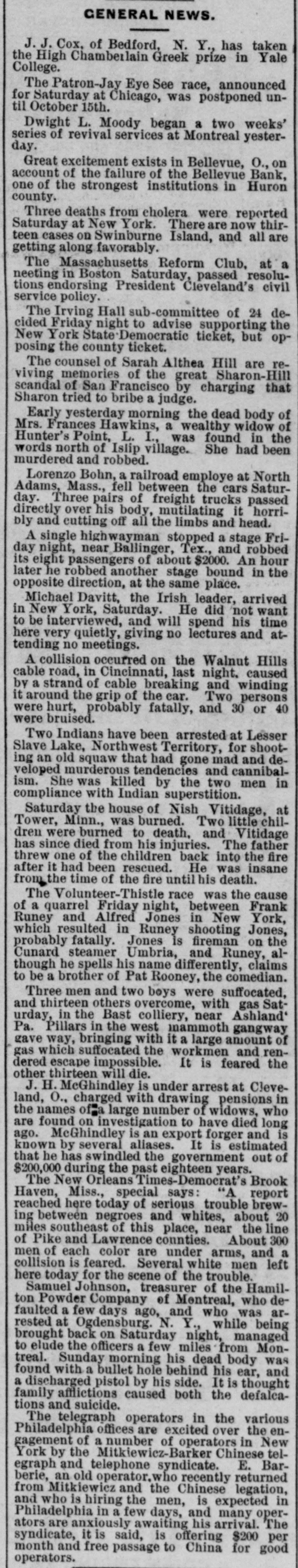 GENERAL NEWS. J.J. Cox, of Bedford, N. Y., has taken the High Chamberlain Greek prize in Yale College. The Patron-Jay Eye See race, announced for Saturday at Chicago, was postponed until October 15th. Dwight L. Moody began a two weeks' series of revival services at Montreal yesterday. Great excitement exists in Bellevue, o., on account of the failure of the Bellevue Bank, one of the strongest institutions in Huron county. Three deaths from eholera were reported Saturday at New York. There are now thirteen cases on Swinburne Island, and all are getting along favorably. The Massachusetts Reform Club, at a neeting in Boston Saturday, passed resolutions endorsing President Cleveland's civil service policy. The Irving Hall sub-committee of 24 decided Friday night to advise supporting the New York State Democratic ticket, but opposing the county ticket. The counsel of Sarah Althea Hill are reviving memories of the great Sharon-Hill scandal of San Francisco by charging that Sharon tried to bribe a judge. Early yesterday morning the dead body of of Mrs. Frances Hawkins, a wealthy widow Hunter's Point, L. I., was found in the words north of Islip village. She had been murdered and robbed. Lorenzo Bohn, a railroad employe at North Adams, Mass., fell between the cars Saturday. Three pairs of freight trucks passed over his body, mutilating it horribly off all the limbs stopped a Fridirectly A and single cutting highwayman and stage head. near Ballinger, Tex., and robbed of about $2000. another stage day later its eight night, he robbed passengers bound An in hour the at the same the Irish in Saturday. He to and will here giving no no tending opposite Michael be New very interviewed, York, direction, quietly, Davitt, meetings. lectures spend leader, did place. his not and arrived want Hills time atA collision occurred on the Walnut cable road, in Cincinnati, last night. caused by a strand of cable breaking and winding it around the grip of the car. Two persons 40 were hurt, probably fatally, and 30 or were bruised. Two Indians have been arrested at Lesser Slave Lake, Northwest Territory, for shoot- dean old squaw that had gone mad and ing veloped murderous tendencies and cannibal- in ism. She was killed by the two men compliance with Indian superstition. Saturday the house of Nish Vitidage, chil- at Minn., was burned. Two little Tower, were burned to death. and Vitidage father dren since died from his injuries. The fire threw has one of the children back into the insane it had been rescued. He was after from the time of the fire until h death. The Volunteer-Thistle race was the Frank cause quarrel Friday night, between York, of a and Alfred Jones in New Jones, Runey resulted in Runey shooting the which fatally. Jones is fireman on alprobably steamer Umbria, and Runey, claims though Cunard he spells his name differently, comedian. to be a brother of Pat Rooney, the Three men and two boys were suffocated, Satthirteen others overcome, with Ashland' gas and in the Bast colliery, near urday, Pillars in the west mammoth gangway of Pa. way, bringing with it a large amount and rengave suffocated the workmen the dered gas which escape impossible. It is feared other thirteen McGhindley will die. is under arrest at Cleve- in J. H. O., charged with drawing pensions who land, of a large number of widows, died long the names found on investigation to have and is are McGhindley is an export forger estimated ago. several aliases. It is out of known he by has swindled the government that during the past eighteen years. $200,000 New Orleans Times-Democrat's "A report Brook The Miss., special says: Haven, here today of serious trouble about brew- 20 reached between negroes and whites, the line ing southeast of this place, near About 300 miles and Lawrence counties. and of Pike each color are under arms, left a men collision of is feared. Several white trouble. men here today for the scene of the Johnson, treasurer of the who Hamil- deSamuel Powder Company of Mentreal, was arton few days ago, and who faulted at a Ogdensburg. N. Y., while managed being rested back on Saturday night, Monthe officers a few miles to morning his dead brought elude Sunday from body was and found treal. with a bullet hole behind his ear, pistol by his side. It is a afflictions caused both the tions and suicide. family discharged defalca- thought telegraph operators in the various the enThe offices are excited over in New of a number of Mitkiewiez-Barker Barand telephone Philadelphia gagement York by the syndicate. operators Chinese E. telan old operator. who berie, and the Chinese egraph from Mitkiewiez recently expected returned legation, in is hiring the men, is and in a few days, awaiting his Philadelphia who anxiously and arrival. many $200 oper- The per ators are it is said, is offering for good month syndicate, and free passage to China operators.
