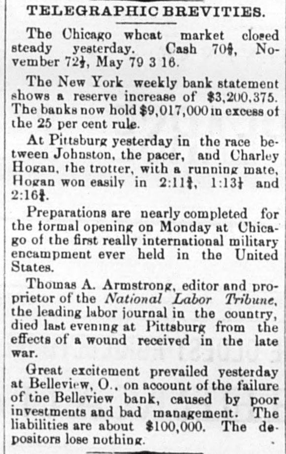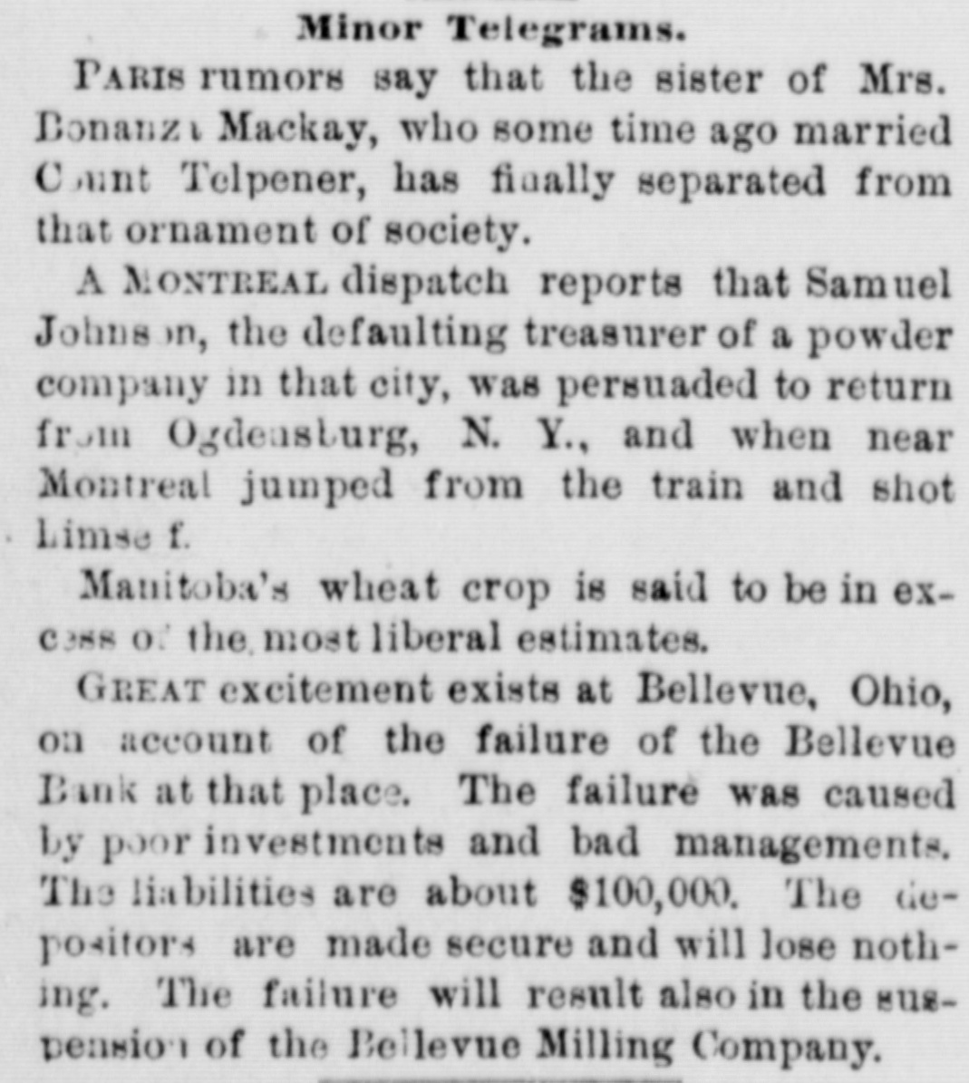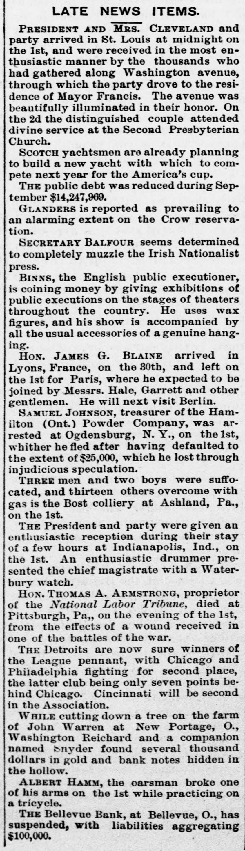 GENERAL NEWS. J.J. Cox, of Bedford, N. Y., has taken the High Chamberlain Greek prize in Yale College. The Patron-Jay Eye See race, announced for Saturday at Chicago, was postponed until October 15th. Dwight L. Moody began a two weeks' series of revival services at Montreal yesterday. Great excitement exists in Bellevue, o., on account of the failure of the Bellevue Bank, one of the strongest institutions in Huron county. Three deaths from eholera were reported Saturday at New York. There are now thirteen cases on Swinburne Island, and all are getting along favorably. The Massachusetts Reform Club, at a neeting in Boston Saturday, passed resolutions endorsing President Cleveland's civil service policy. The Irving Hall sub-committee of 24 decided Friday night to advise supporting the New York State Democratic ticket, but opposing the county ticket. The counsel of Sarah Althea Hill are reviving memories of the great Sharon-Hill scandal of San Francisco by charging that Sharon tried to bribe a judge. Early yesterday morning the dead body of of Mrs. Frances Hawkins, a wealthy widow Hunter's Point, L. I., was found in the words north of Islip village. She had been murdered and robbed. Lorenzo Bohn, a railroad employe at North Adams, Mass., fell between the cars Saturday. Three pairs of freight trucks passed over his body, mutilating it horribly off all the limbs stopped a Fridirectly A and single cutting highwayman and stage head. near Ballinger, Tex., and robbed of about $2000. another stage day later its eight night, he robbed passengers bound An in hour the at the same the Irish in Saturday. He to and will here giving no no tending opposite Michael be New very interviewed, York, direction, quietly, Davitt, meetings. lectures spend leader, did place. his not and arrived want Hills time atA collision occurred on the Walnut cable road, in Cincinnati, last night. caused by a strand of cable breaking and winding it around the grip of the car. Two persons 40 were hurt, probably fatally, and 30 or were bruised. Two Indians have been arrested at Lesser Slave Lake, Northwest Territory, for shoot- dean old squaw that had gone mad and ing veloped murderous tendencies and cannibal- in ism. She was killed by the two men compliance with Indian superstition. Saturday the house of Nish Vitidage, chil- at Minn., was burned. Two little Tower, were burned to death. and Vitidage father dren since died from his injuries. The fire threw has one of the children back into the insane it had been rescued. He was after from the time of the fire until h death. The Volunteer-Thistle race was the Frank cause quarrel Friday night, between York, of a and Alfred Jones in New Jones, Runey resulted in Runey shooting the which fatally. Jones is fireman on alprobably steamer Umbria, and Runey, claims though Cunard he spells his name differently, comedian. to be a brother of Pat Rooney, the Three men and two boys were suffocated, Satthirteen others overcome, with Ashland' gas and in the Bast colliery, near urday, Pillars in the west mammoth gangway of Pa. way, bringing with it a large amount and rengave suffocated the workmen the dered gas which escape impossible. It is feared other thirteen McGhindley will die. is under arrest at Cleve- in J. H. O., charged with drawing pensions who land, of a large number of widows, died long the names found on investigation to have and is are McGhindley is an export forger estimated ago. several aliases. It is out of known he by has swindled the government that during the past eighteen years. $200,000 New Orleans Times-Democrat's "A report Brook The Miss., special says: Haven, here today of serious trouble about brew- 20 reached between negroes and whites, the line ing southeast of this place, near About 300 miles and Lawrence counties. and of Pike each color are under arms, left a men collision of is feared. Several white trouble. men here today for the scene of the Johnson, treasurer of the who Hamil- deSamuel Powder Company of Mentreal, was arton few days ago, and who faulted at a Ogdensburg. N. Y., while managed being rested back on Saturday night, Monthe officers a few miles to morning his dead brought elude Sunday from body was and found treal. with a bullet hole behind his ear, pistol by his side. It is a afflictions caused both the tions and suicide. family discharged defalca- thought telegraph operators in the various the enThe offices are excited over in New of a number of Mitkiewiez-Barker Barand telephone Philadelphia gagement York by the syndicate. operators Chinese E. telan old operator. who berie, and the Chinese egraph from Mitkiewiez recently expected returned legation, in is hiring the men, is and in a few days, awaiting his Philadelphia who anxiously and arrival. many $200 oper- The per ators are it is said, is offering for good month syndicate, and free passage to China operators.